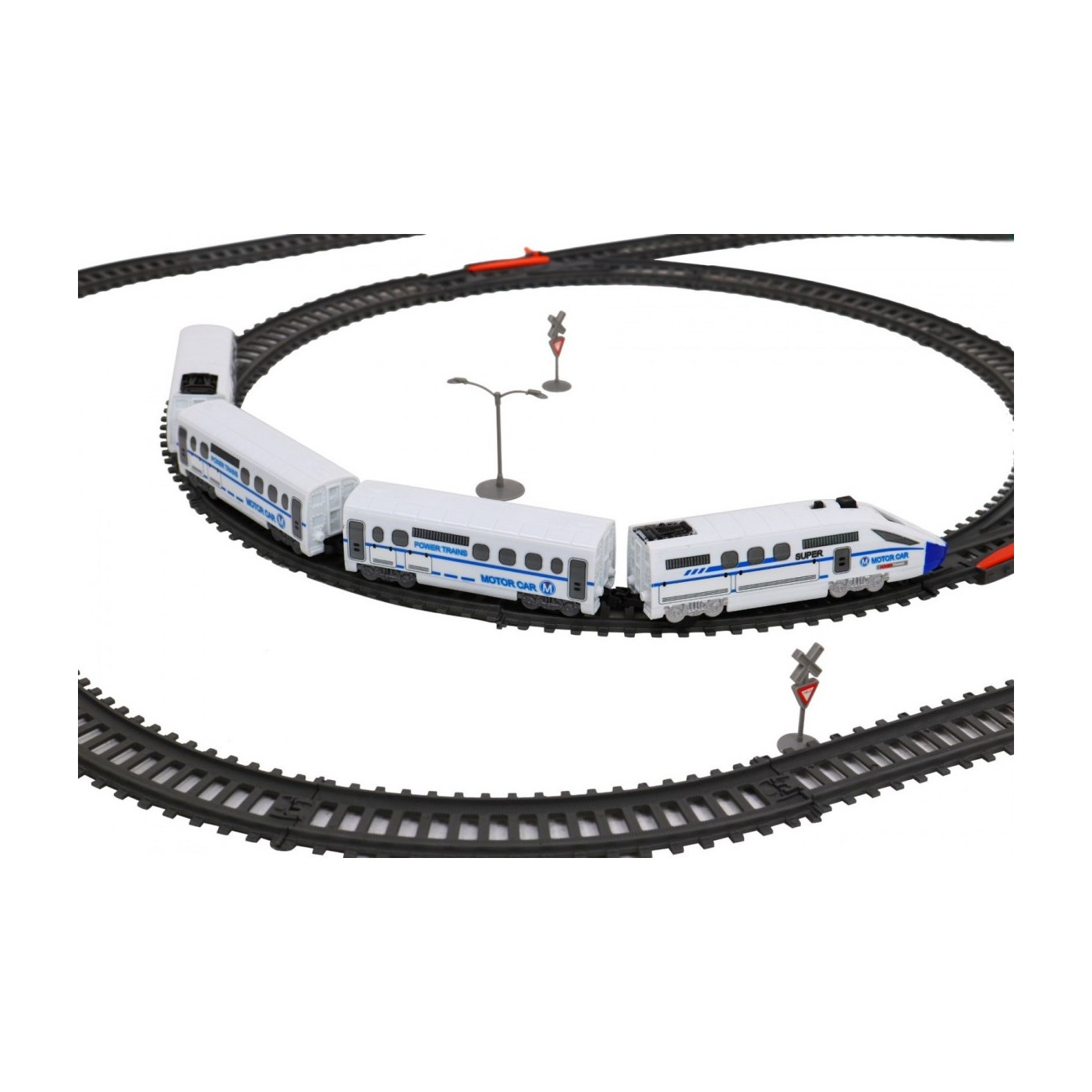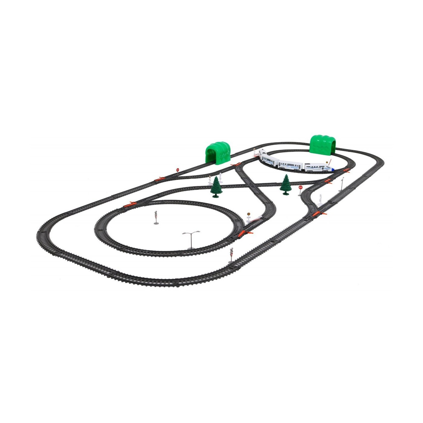 | - 2 x lokomotywa ok. 12,5 cm x 3,5 cm, - 2 x wagon ok. 10 cm x 3,5 cm, - odcinki proste torów, - odcinki torów zakrzywionych, - 2 x tunel, - elementy dekoracyjne (znaki, drzewa słupy itp.), | |