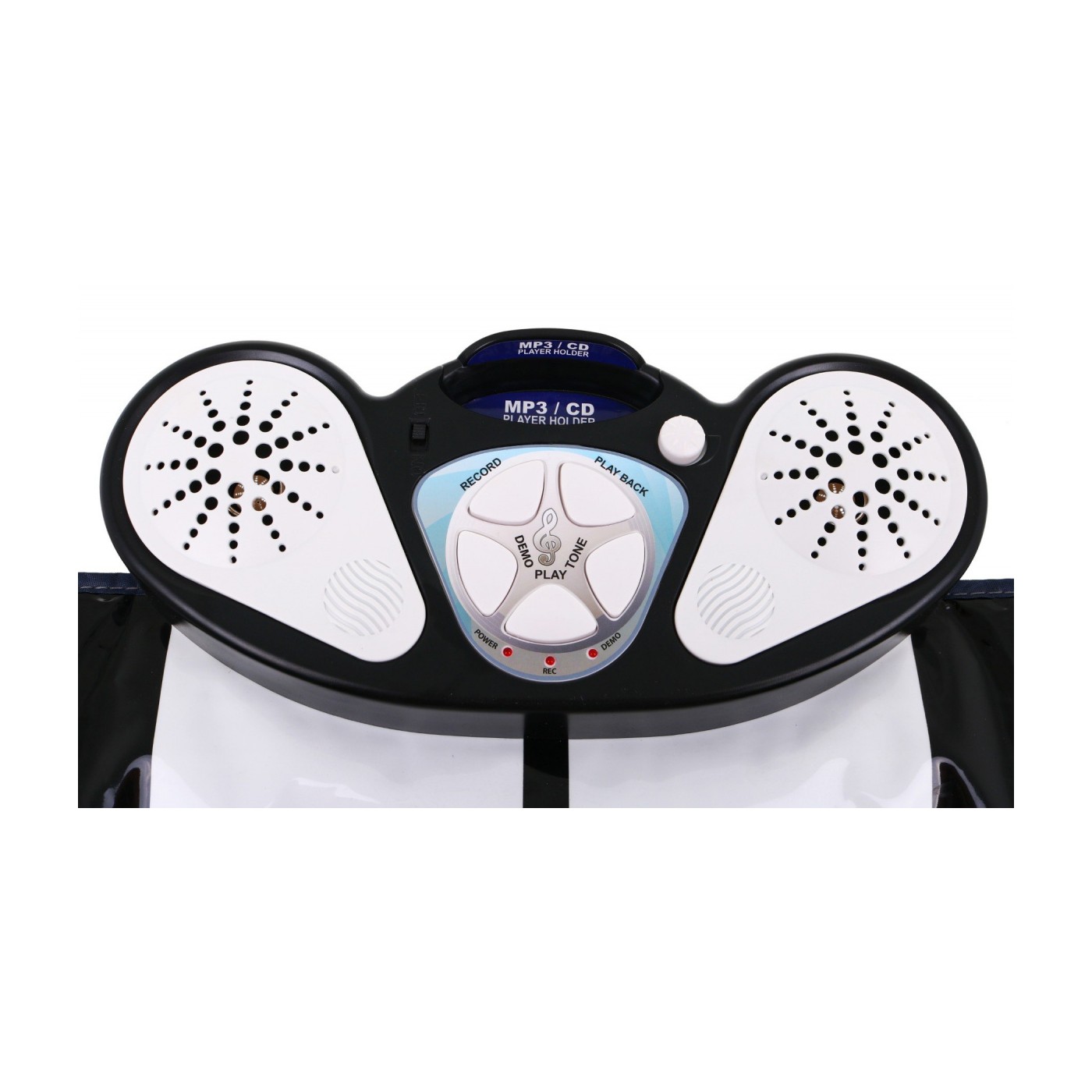 | Duża mata muzyczna w kształcie keyboardu to propozycja dla dzieci lubiących ruch, muzykę i świetną zabawę. Mata poprzez zabawę rozwija zdolności muzyczne, koordynację ręka – oko oraz zdolności sensoryczne. Zestaw składa się z maty z panelem muzycznym w górnej części oraz kabla MP3. Na panelu muzycznym znajdują się dwa głośniki, pokrętło głośności, wejście MP3 oraz 5 przycisków z wyborem trybów: tryb nagrywania, tryb odtwarzania nagranego dźwięku, tryb demo, tryb odtwarzania, tryb tonowy. 1) Tryb odtwarzania i brzmienia: Mata przechodzi do trybu odtwarzania po wciśnięciu klawisza. Domyślnym instrumentem jest fortepian. Można zmienić na inny po naciśnięciu przycisku „TONE”. Do wyboru mamy 9 instrumentów. Matę można podłączyć do zewnętrznego urządzenia muzycznego, aby odtwarzać ulubione utwory. Funkcja demo nie jest dostępna po podłączeniu zewnętrznego urządzenia. Pozostałe funkcje pozostają niezmienne. 2) Tryb DEMO Mata przechodzi w tryb DEMO po naciśnięciu przycisku „DEMO”. Tryb demonstracyjny nie reaguje na białe klawisze. Domyślnym instrumentem trybu demo jest fortepian, można go zmienić naciskając przycisk „TONE”. 3) Tryb Nagrywanie Funkcja nagrywania zostanie włączona po naciśnięciu przycisku „RECORD”, instrumenty można zmieniać po naciśnięciu przycisku „TONE”. Pamięć zostanie wyczyszczona przez ponowne naciśnięcie przycisku „RECORD”. 4) Tryb Odtwarzanie nagranego dźwięku Należy nacisnąć „PLAYBACK” aby otworzyć nagraną melodię Zabawka przeznaczona jest dla dzieci od 3-go roku życia. Zasilana jest bateriami AA (4X1,5V – brak w zestawie). | |