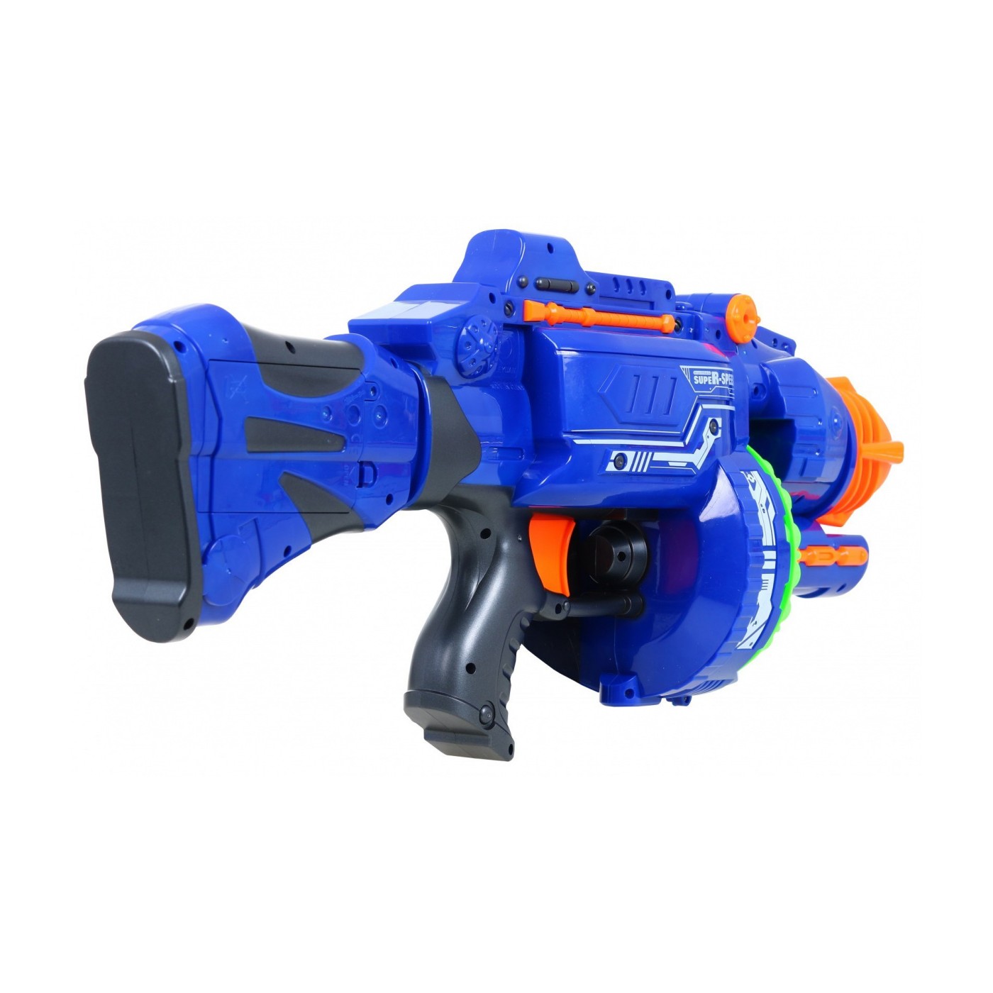 | - typ: bębenkowy, półautomat elektryczny, - typ ładowania: magazynek, - mechanizm spustowy: pojedyncze strzały (naciśnięcie spustu -wyrzut 1 pocisku lub wyrzut serii pocisków) - pojemność magazynku: 20 pocisków, - elektroniczna blokada wystrzału w momencie zaklinowania pocisku w lufie, - pociski: piankowe strzały (w pełni bezpieczne), - zasięg: ok 10 metrów. | |
