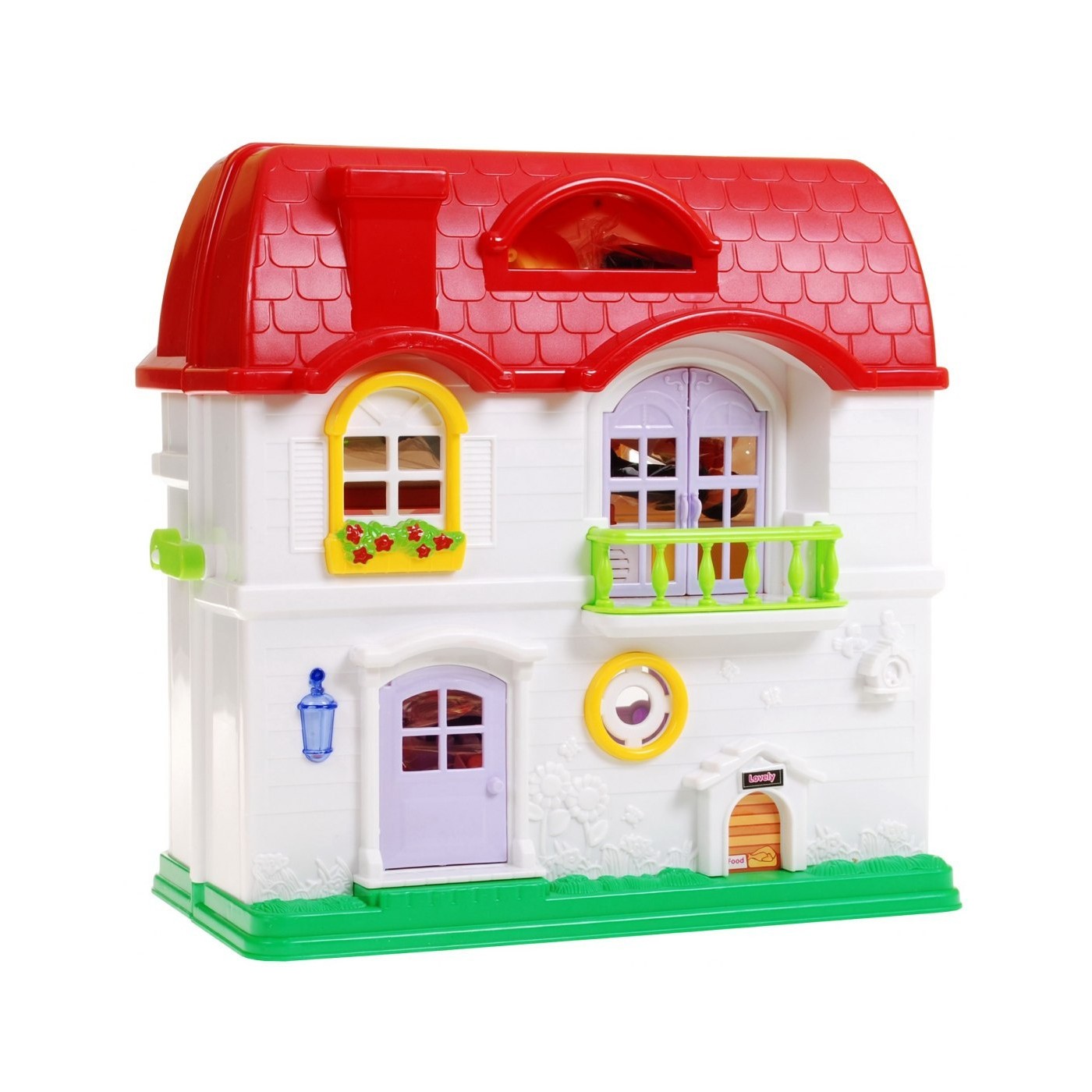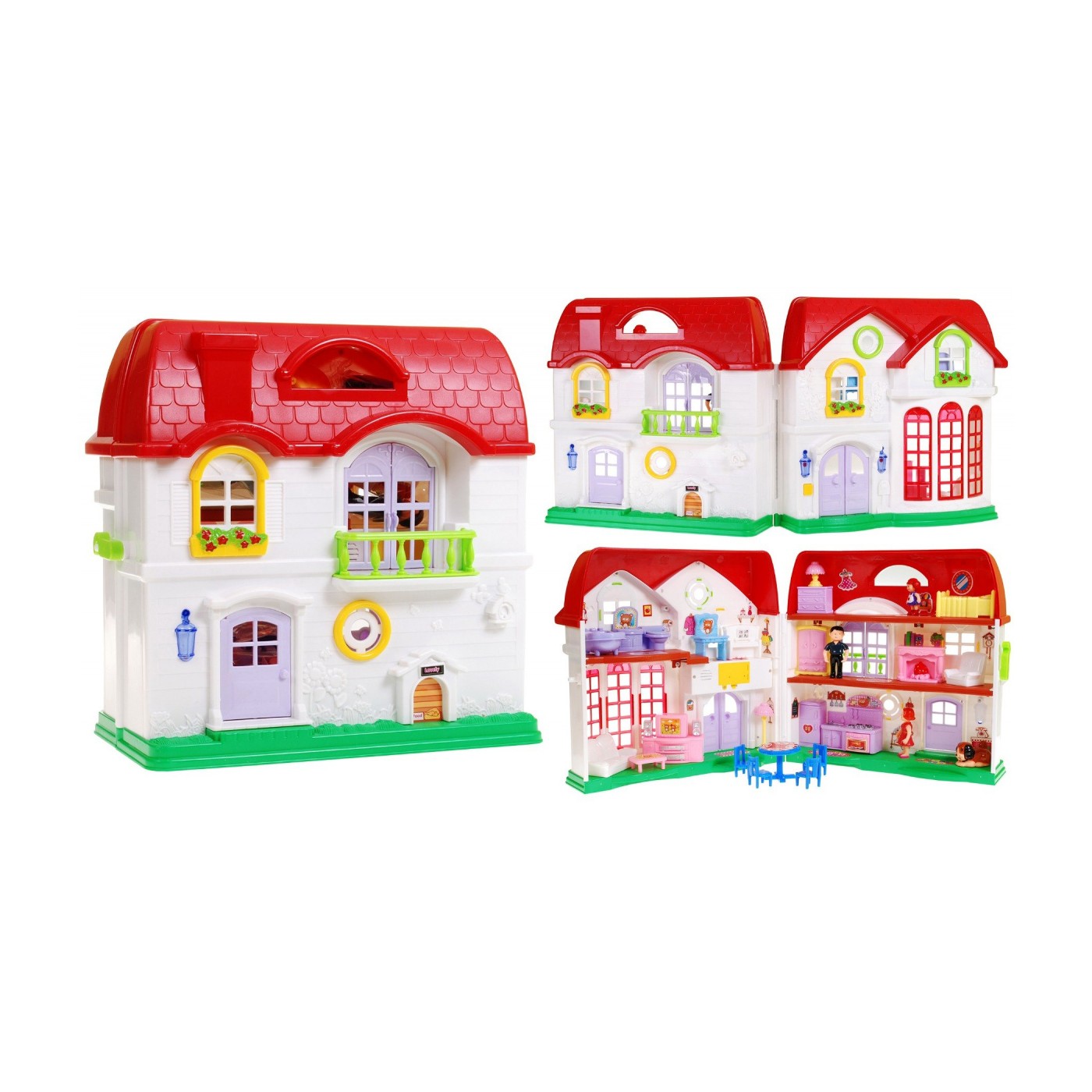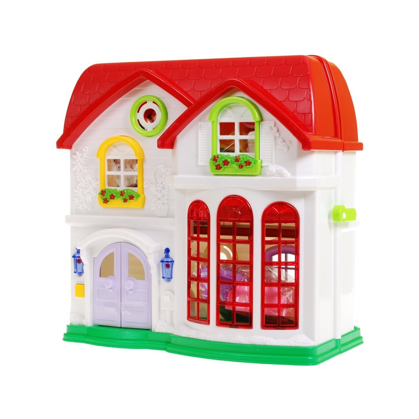 | Piętrowa willa wyposażona w: 1. balkonik i wyście na taras z otwieranymi drzwiami, 2. cztery bajecznie kolorowe okna, 3. otwierane drzwi wejściowe, obok których umieszczono specjalny dzwonek – po naciśnięciu przycisku rozlega się dźwięk dzwonka i szczekanie psa, 4. stylowy, dach, który jednocześnie posiada wygodny i praktyczny uchwyt, pozwalający na przenoszenie złożonej willi, 5. z boku willi zaczep pozwalający na złożenie domku do transportu, 6. zestaw naklejek dekorujących wnętrza. Zabawka zasilana jest bateriami 2 x AA (brak w zestawie). | |