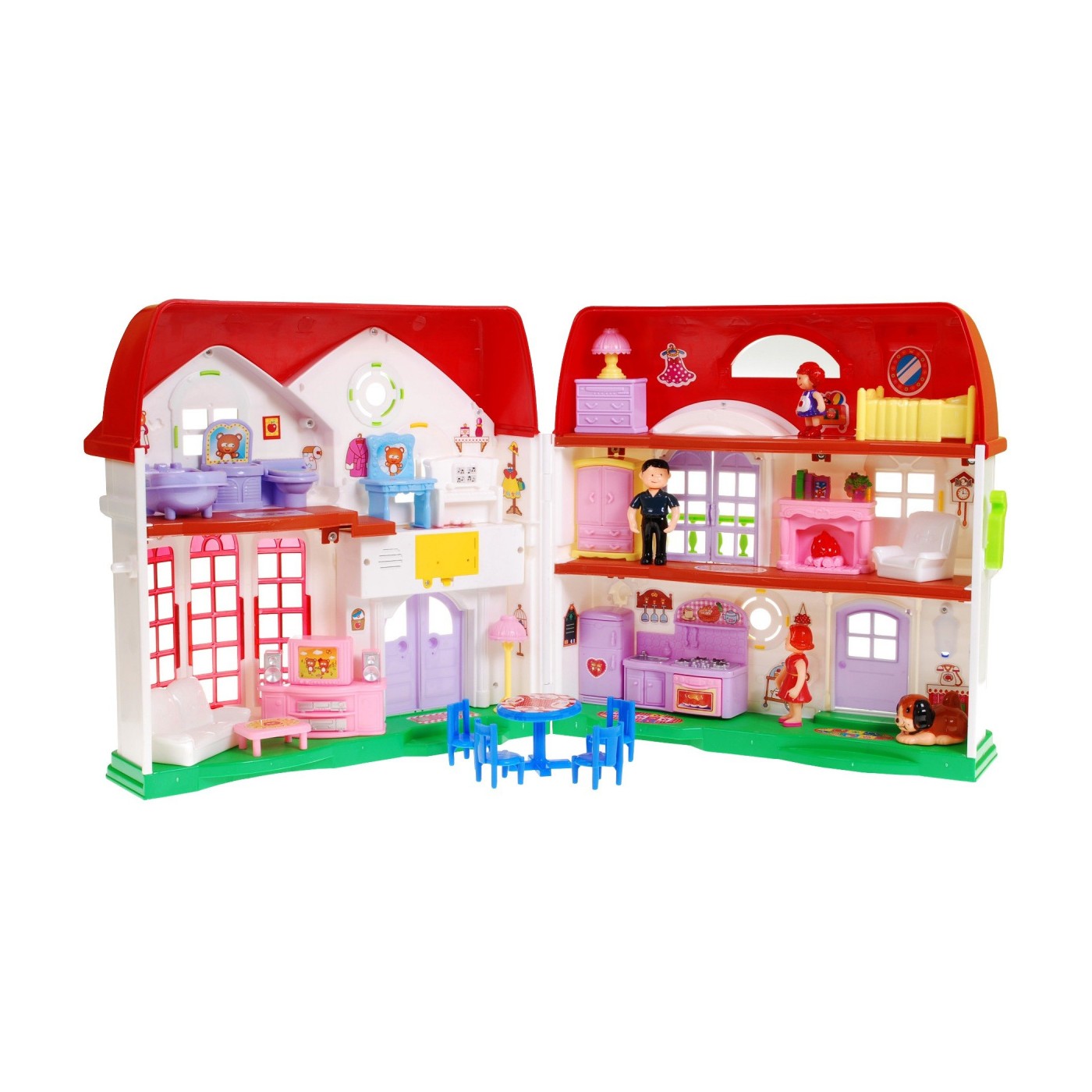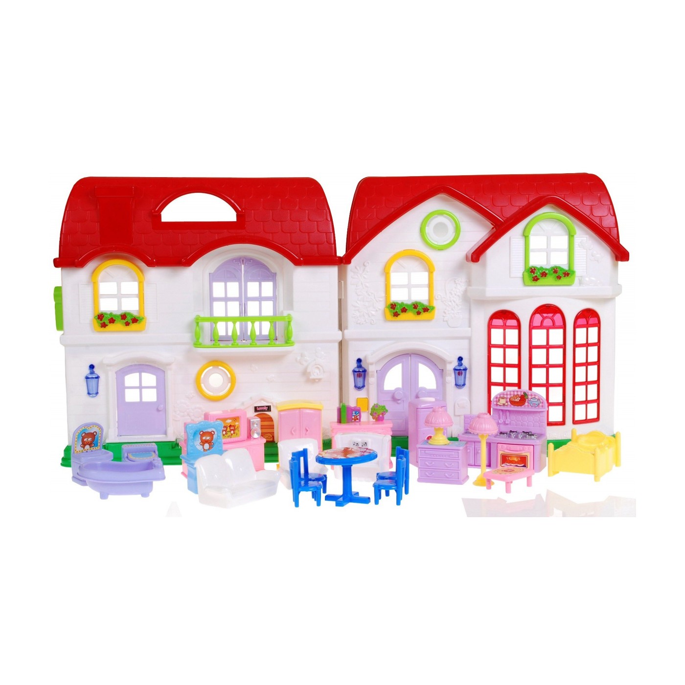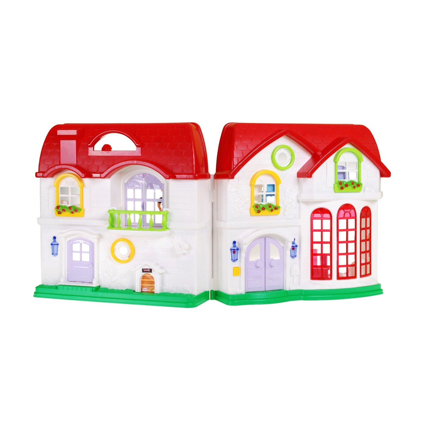 | Piętrowa willa wyposażona w: 1. balkonik i wyście na taras z otwieranymi drzwiami, 2. cztery bajecznie kolorowe okna, 3. otwierane drzwi wejściowe, obok których umieszczono specjalny dzwonek – po naciśnięciu przycisku rozlega się dźwięk dzwonka i szczekanie psa, 4. stylowy, dach, który jednocześnie posiada wygodny i praktyczny uchwyt, pozwalający na przenoszenie złożonej willi, 5. z boku willi zaczep pozwalający na złożenie domku do transportu, 6. zestaw naklejek dekorujących wnętrza. Zabawka zasilana jest bateriami 2 x AA (brak w zestawie). | |