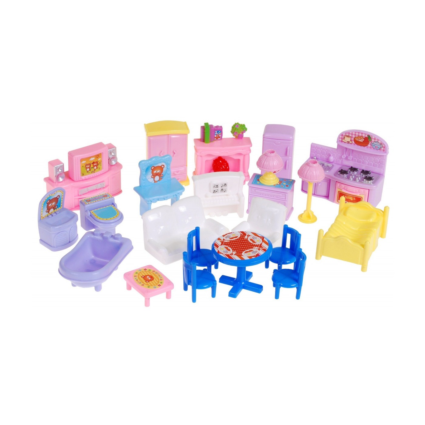 | - rozkładany, piętrowy domek - willa, - 4 figurki mieszkańców – Mama, Tata, Dziecko i Piesek, - 23-częściowy komplet mebli do salonu, jadalni, łazienki, kuchni i innych pokoi składający się z: - wanny, - szafki z umywalką, - toalety, - ławy, - kominka, - sofy, - fotela, - pianina, - stołu z krzesłami, - łóżka, - komody, - szafy na ubrania, - szafki pod telewizor, - lodówki - lampki nocnej, - lampy stojącej, - toaletki, - zestawu kuchennego | |