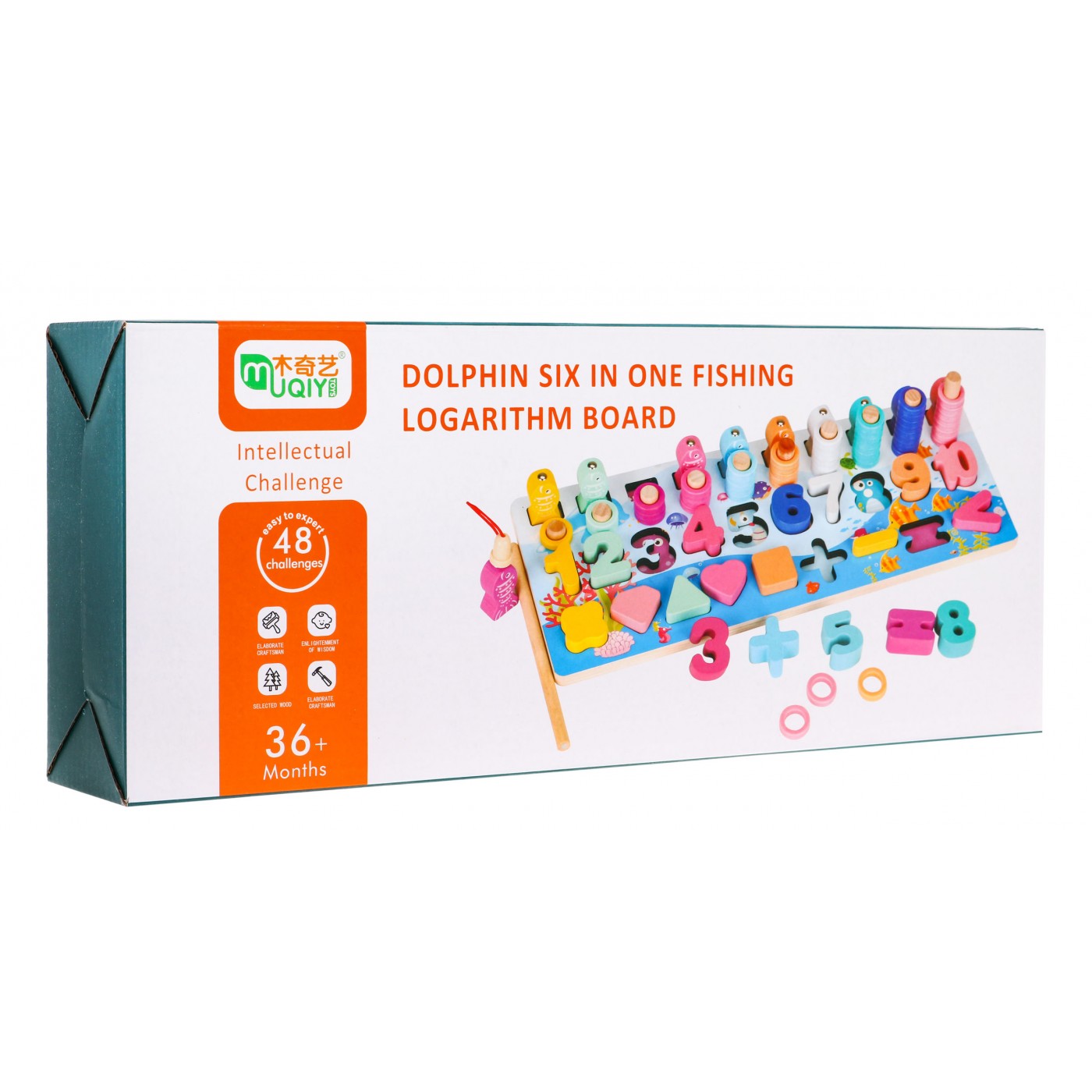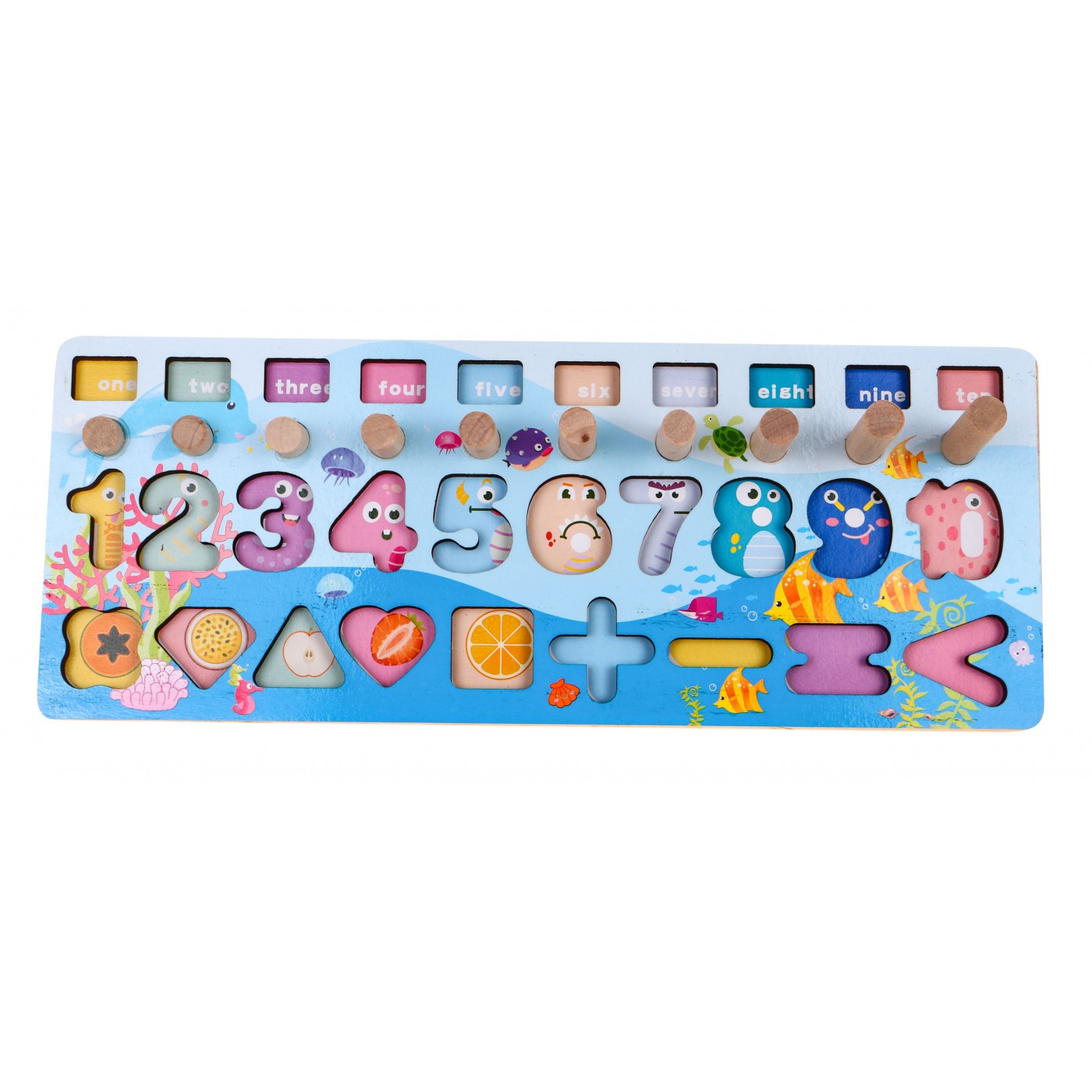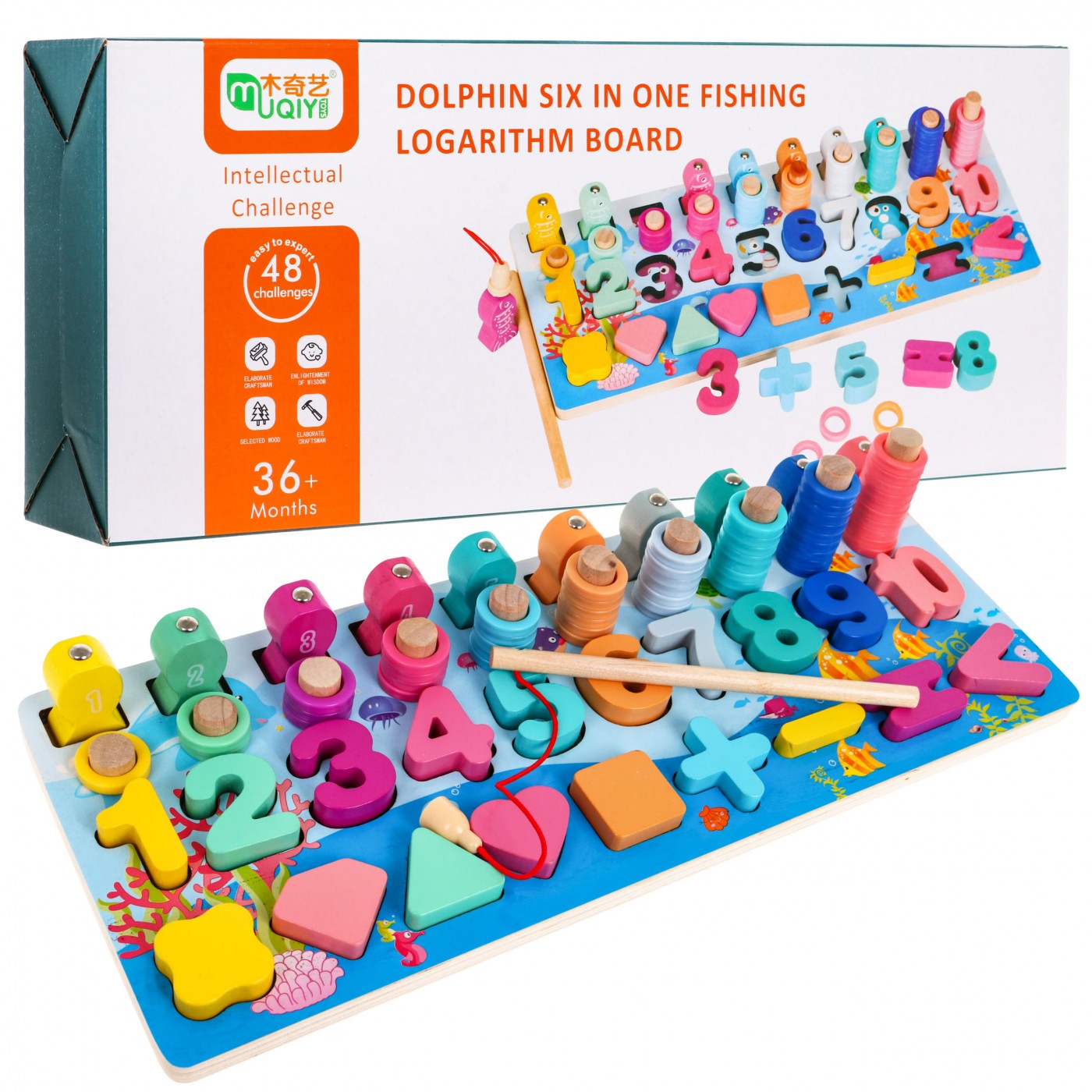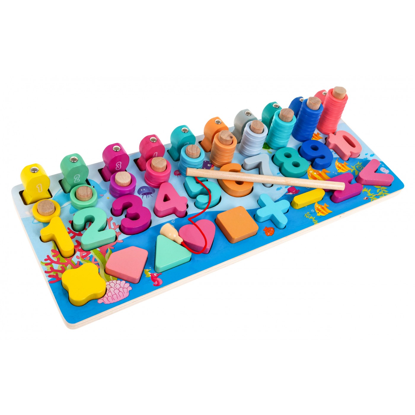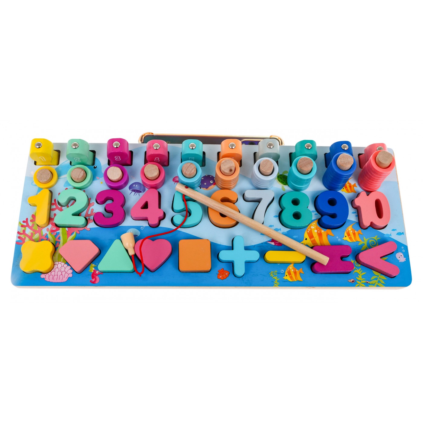 | | Drewniany, bezpieczny zestaw gier przeznaczony jest dla dzieci od 3-go roku życia. Na podstawie znajdują się wycięte kształty i cyfry w które dziecko musi dopasować odpowiedni klocek. Dodatkowo są też drążki różnej długości na które można nakładać kolorowe pierścienie. Na górze podstawy w wyciętych prostokątach umiejscowiono w języku angielskim nazwy cyfr od 1 do 10. Do zestawu dołączono również wędkę na magnez oraz rybki do łowienia. Zabawa a zarazem nauka wprowadzająca w arytmetykę, naukę języka angielskiego, rozpoznawanie kolorów, rozmiarów i ilości. |