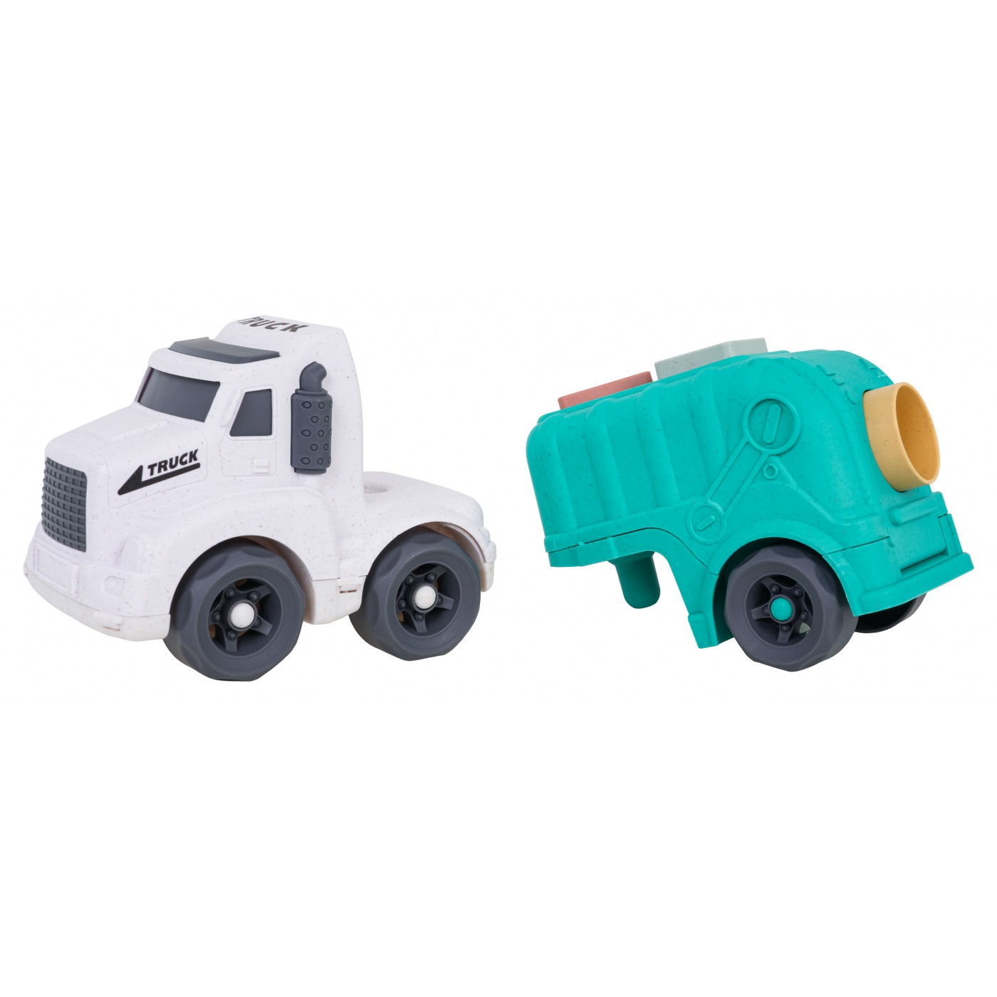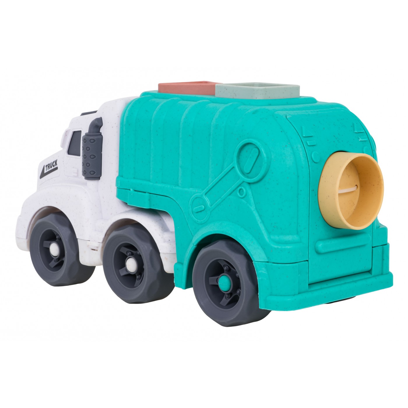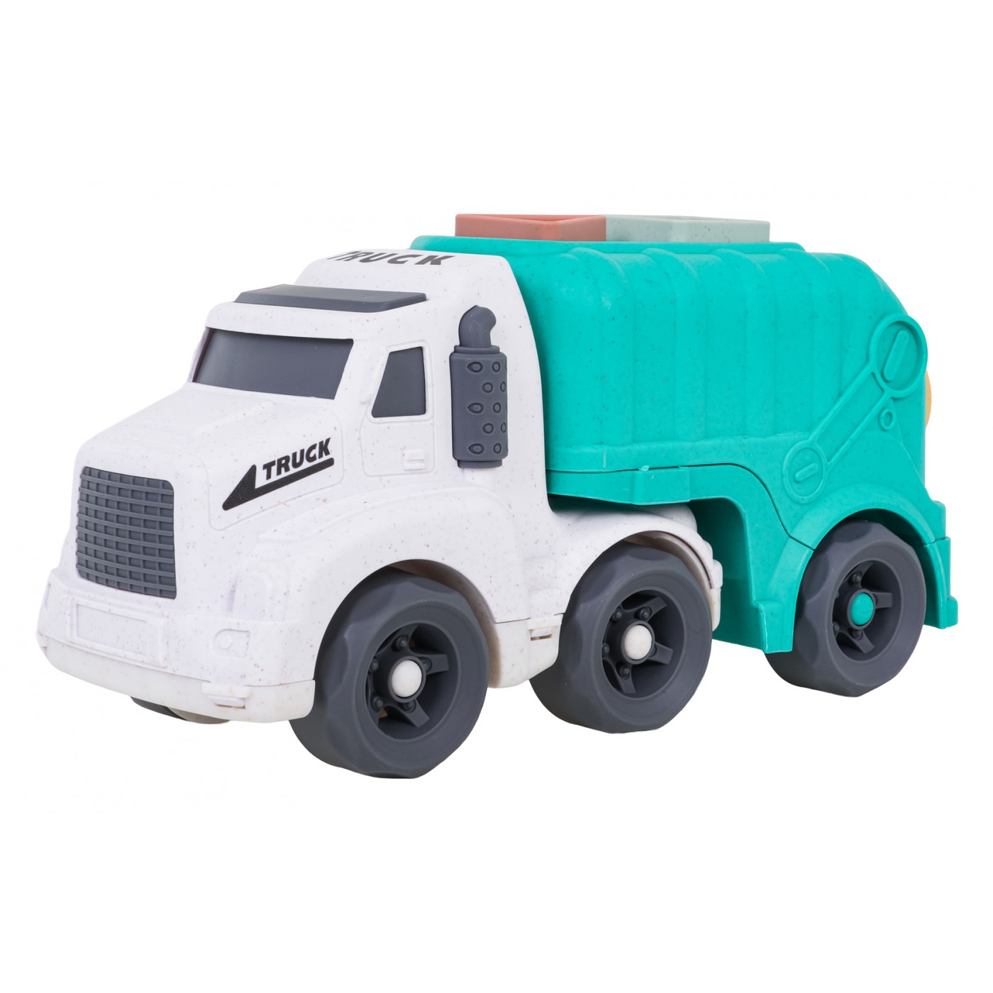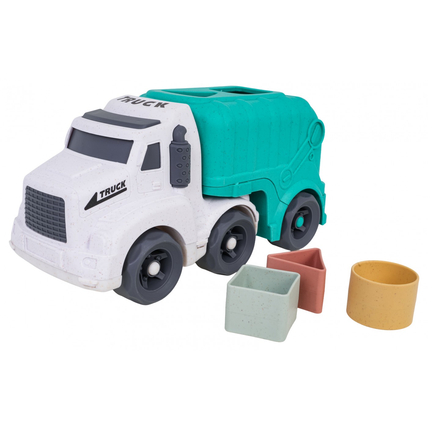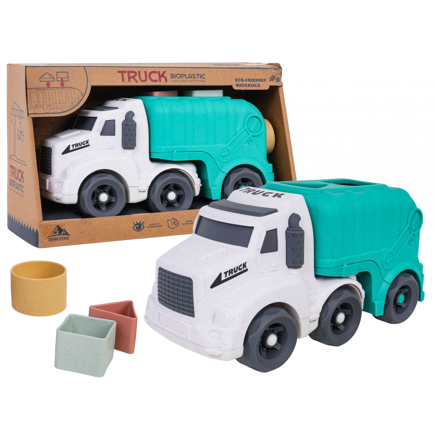 - smetiarske auto vyrobené z bioplastu, - 3 bloky (kruh, trojuholník, štvorec). |
