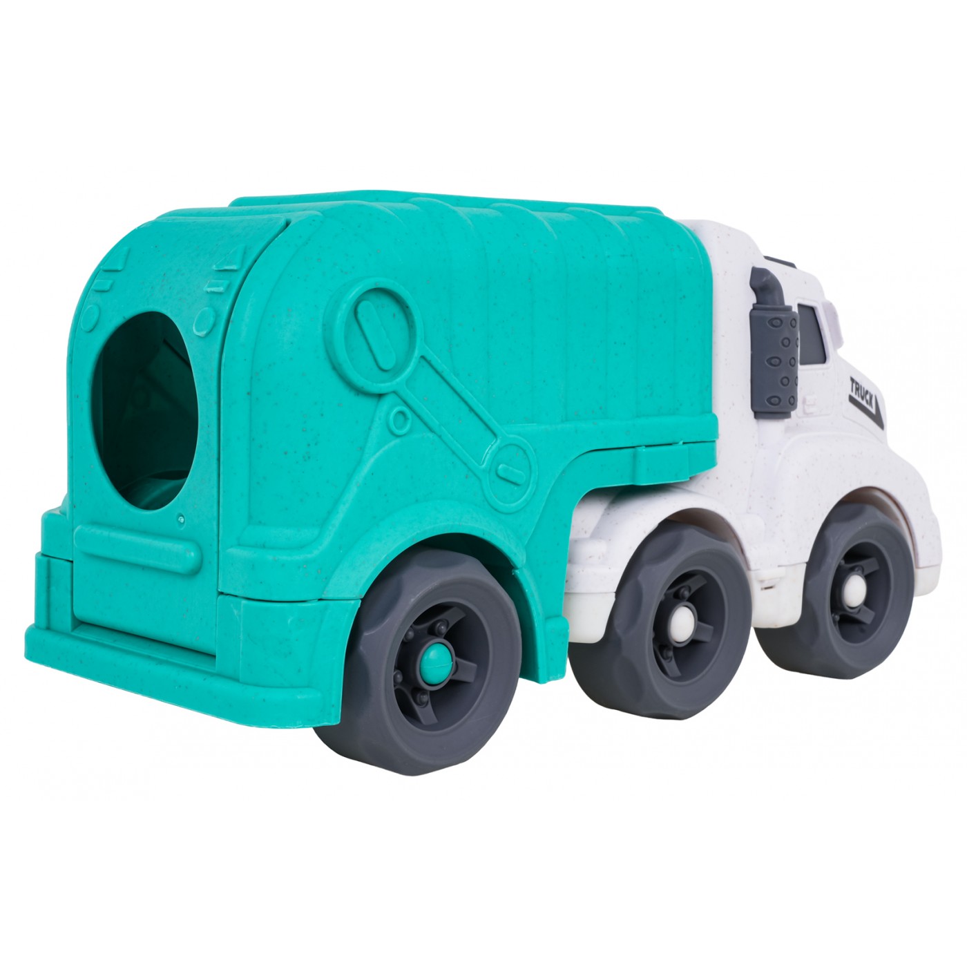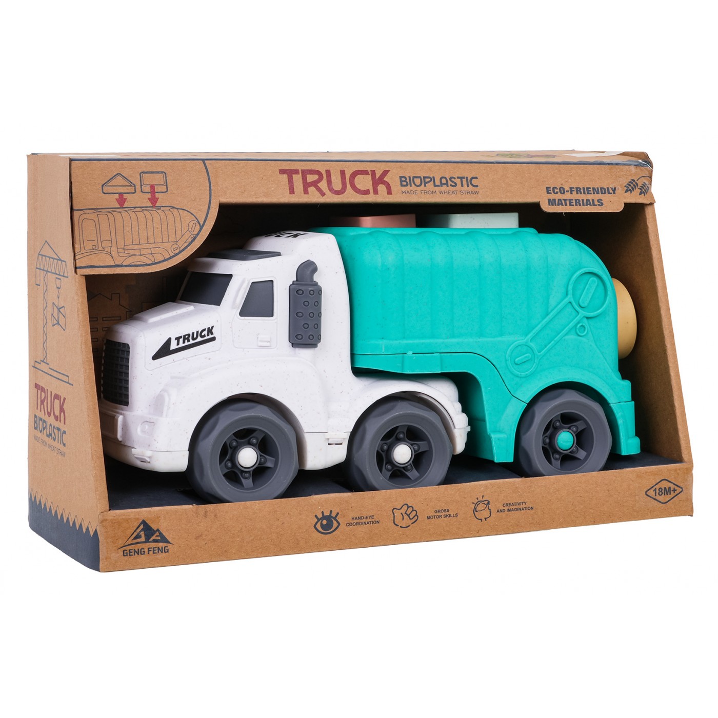 Toto smetiarske auto s triedičom a stavebnicovými kockami je vyrobené z BIOplastu a je vhodné pre deti od osemnástich mesiacov. Je súčasťou ekologickej série. Auto je vyrobené s dôrazom na detail, môže sa pochváliť krásnymi, žiarivými farbami a nemá ostré hrany. Na streche a zadných dverách auta sa nachádza triedič tvarov a stavebnicové kocky sú súčasťou balenia.