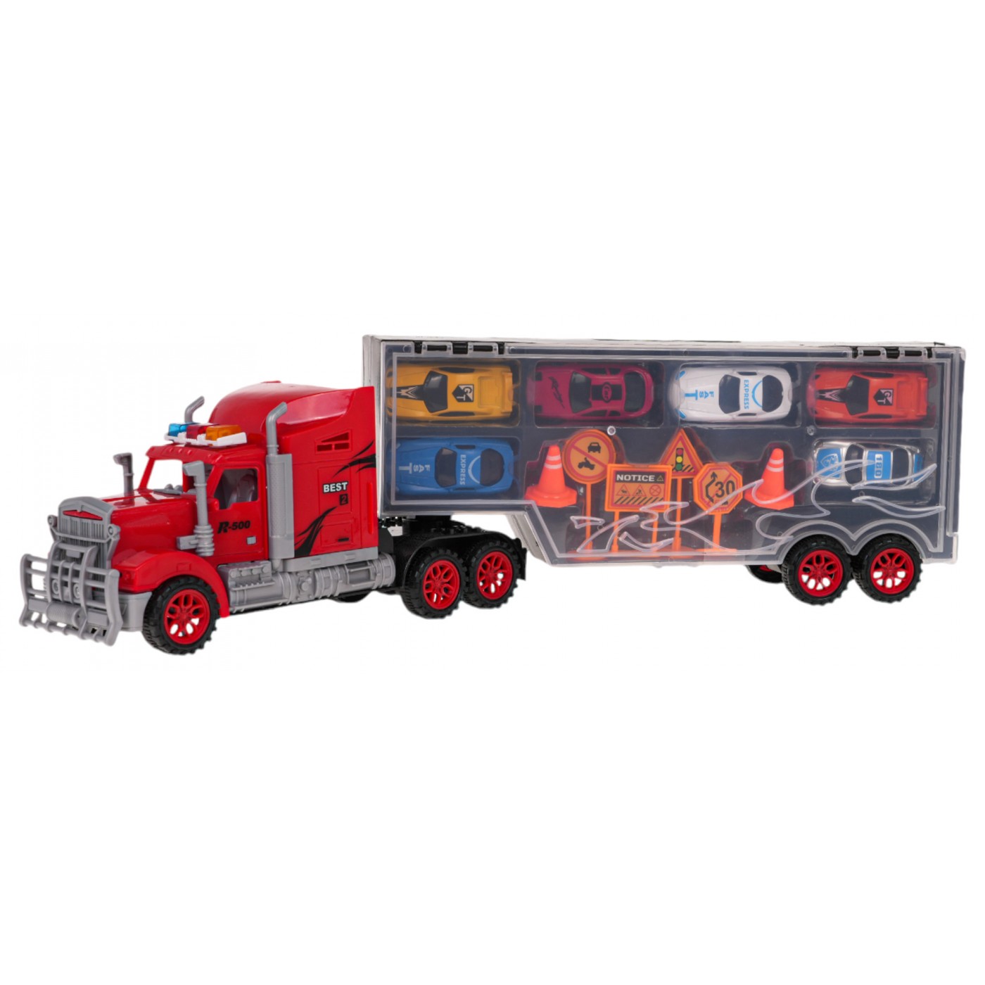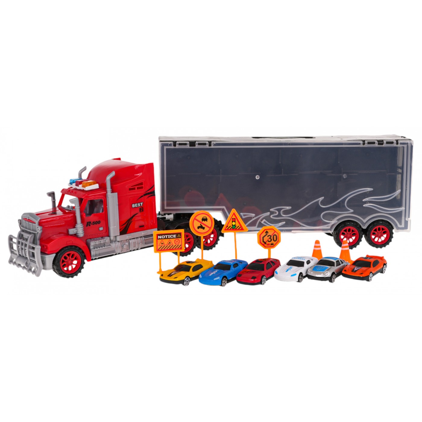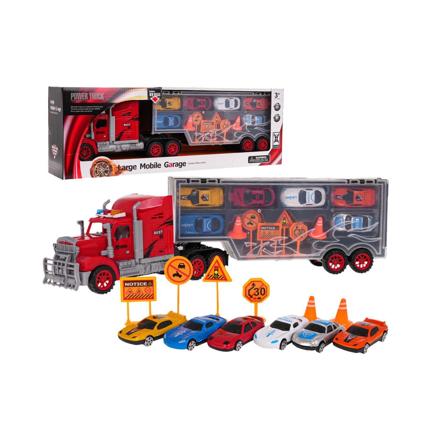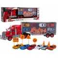Veľký kamión s prívesom, autami a príslušenstvom pre deti od 3 rokov. Hračka je vyrobená z kvalitných materiálov a v živých farbách. Veľký nákladiak má príves so 6 autami, dopravné značky a stĺpy. Náves môžeme odpojiť od vozidla a získať tak skriňu na vozidlo s pohodlnou rukoväťou na prenášanie. Zadné dvere prívesu sa otvoria a vytvoria platformu pre výjazd vozidiel zvnútra.