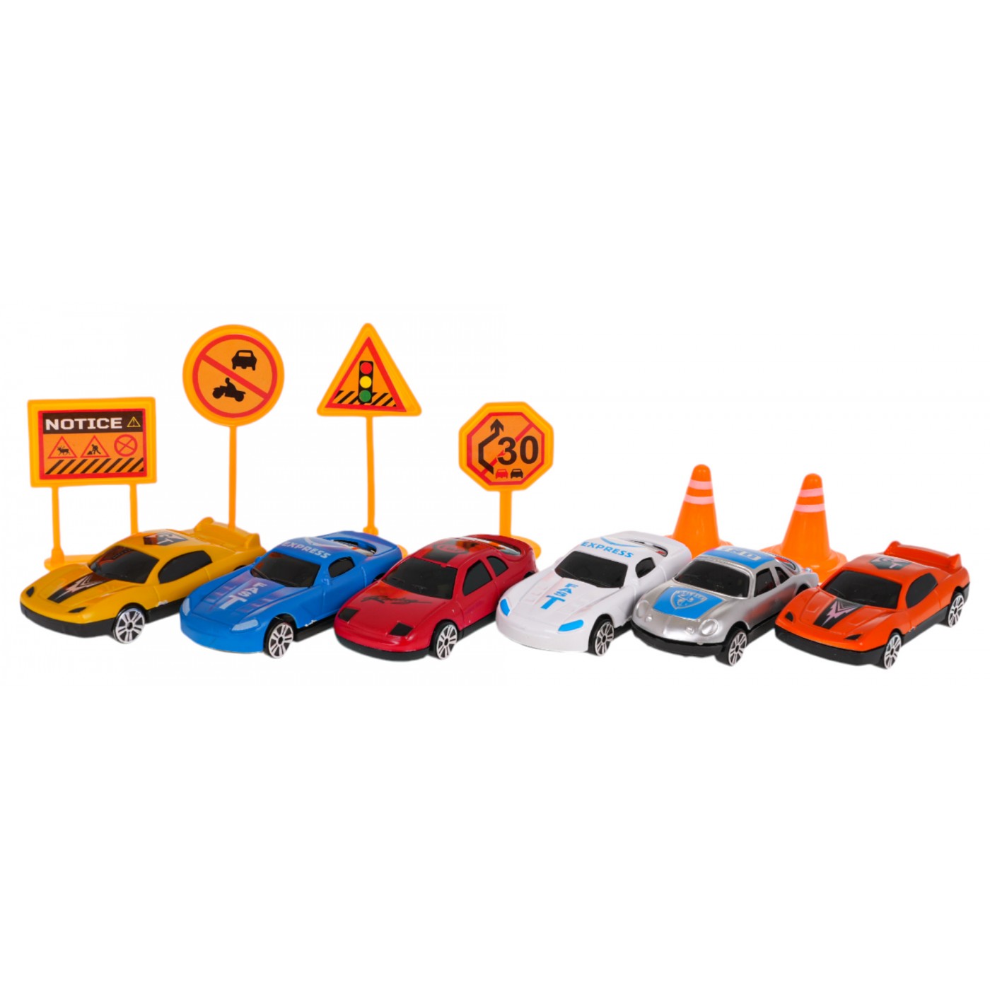 - nákladné auto s návesom, - 6 vozidiel - pružiny , - 4 dopravné značky, - 2 dvojité háčkovanie. |