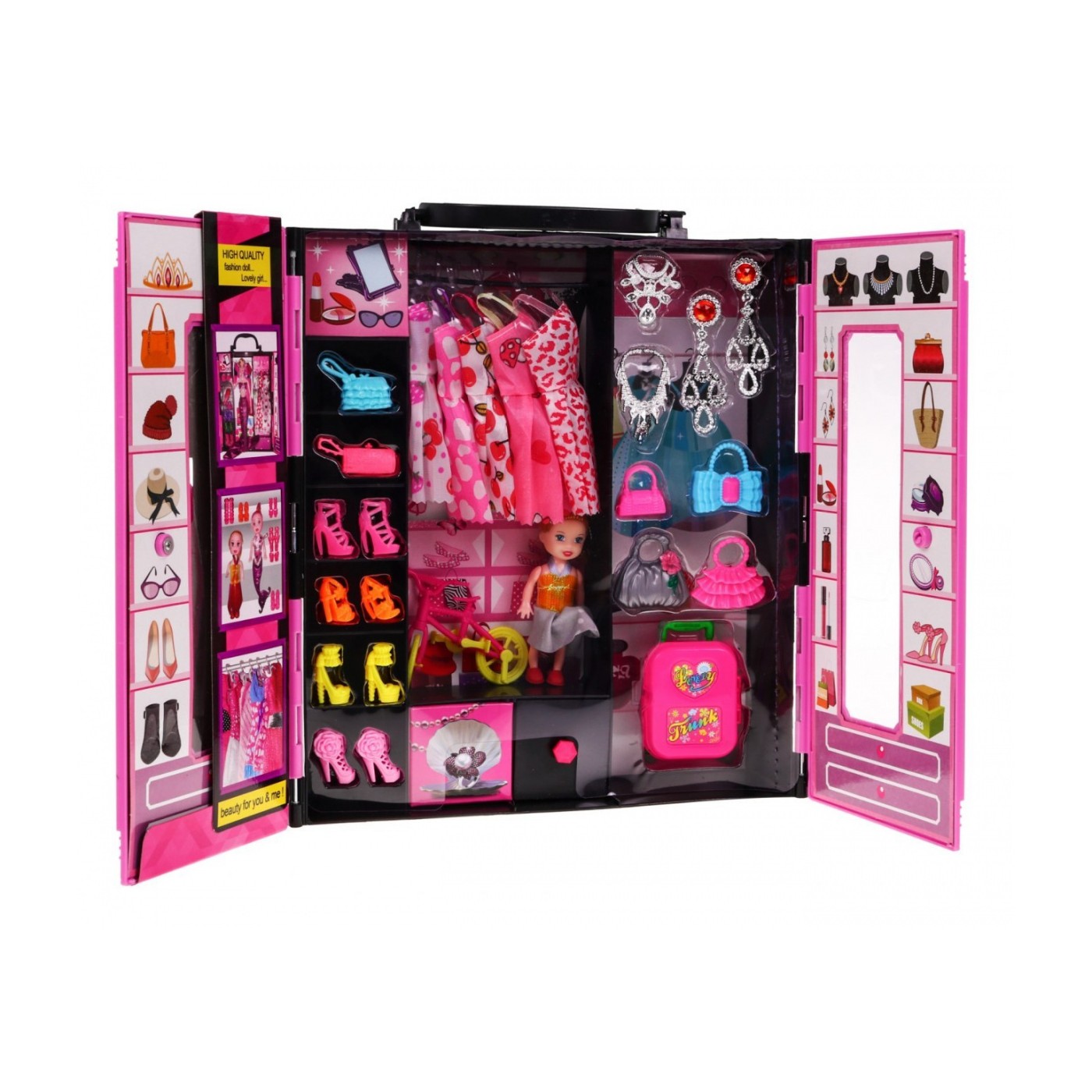 | - szafka ok. 29 cm x 31 cm x 7 cm, - lalka w pięknej sukience balowej ok. 30 cm x 17 cm, - 6x torebka ok. 4 cm x 4 cm większe oraz ok. 2,5 cm x 2,5 cm mniejsze, - 4 x buty ok. 3 cm x 2,5 cm, - otwierana walizka ok. 8 cm x 5,5 cm, - pojemnik na drobiazgi ok. 5,5 cm x 5,5 cm, - rower ok. 9 cm x 7 cm, - mała lalka ok. 10 cm x 4 cm, - 5 x sukienka ok. 14 cm x 6 cm, - 2 x naszyjnik ok. 5 cm x 3 cm, - 2 x kolczyk ok. 8 cm x 2,5 cm | |