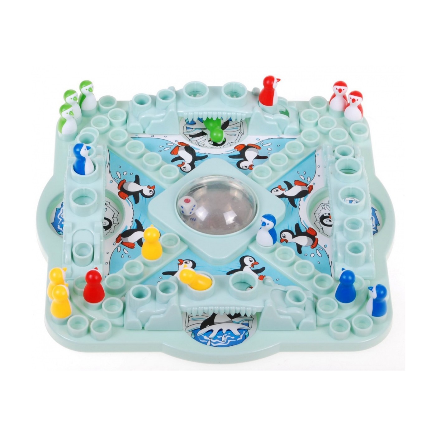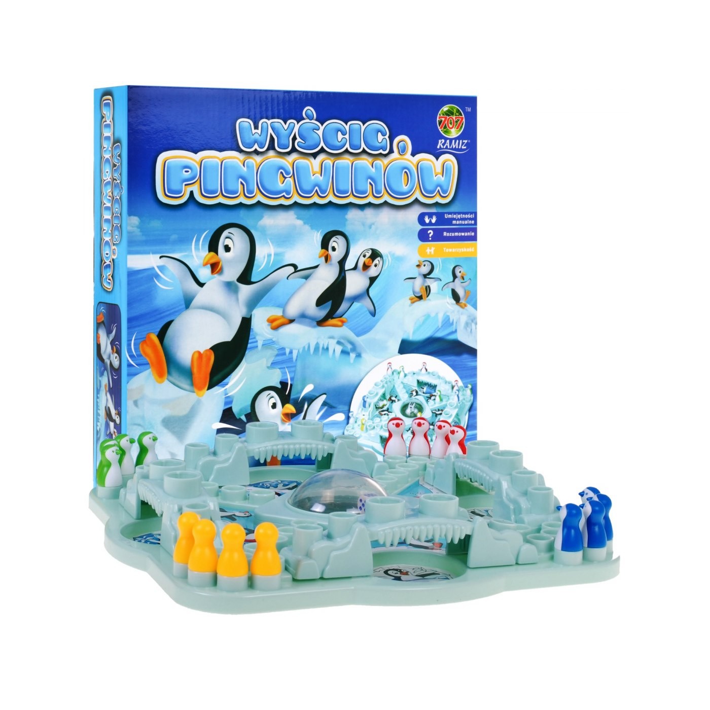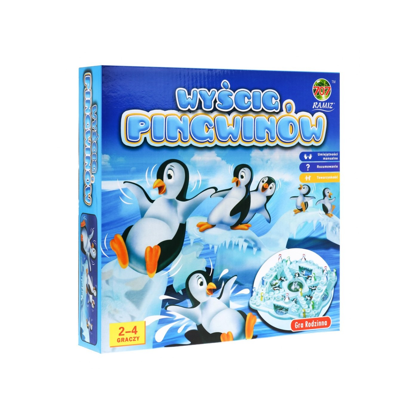 | Pingwiny poruszają się po specjalnie zaprojektowanej planszy z „lodowymi mostami” zgodnie z ruchem wskazówek zegara. Każda drużyna startuje z narożnika, po wyrzuceniu 6 oczek na kostce umieszczonej w centrum planszy, 1 pingwin wchodzi do gry. Pingwiny poruszają się o ilość oczek wskazanych przez kostkę. W trakcie tury możesz poruszać się tylko jednym pingwinkiem. Kiedy twój pingwin stanie na ruchomej części „lodowego mostu” możesz skorzystać z opcji uruchomienia strasznej pułapki i zrzucić stojące na moście pingwiny przeciwnika do lodowatej wody. Zrzucone pingwiny wracają do pól startowych, aby móc ponownie wykonać nimi ruch należy na kostce wyrzucić 6 oczek. Aby zwyciężyć wyścig należy obejść całą planszę i ustawić bezpiecznie w domu całą drużyną. |