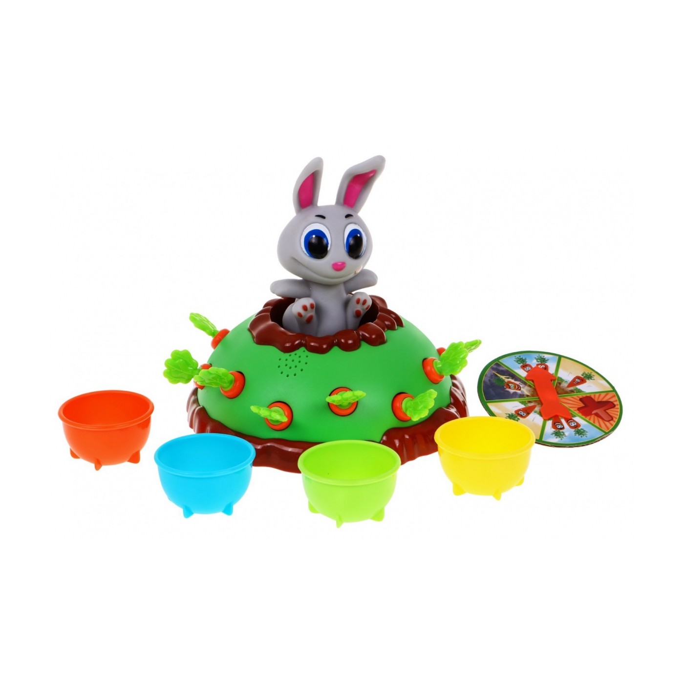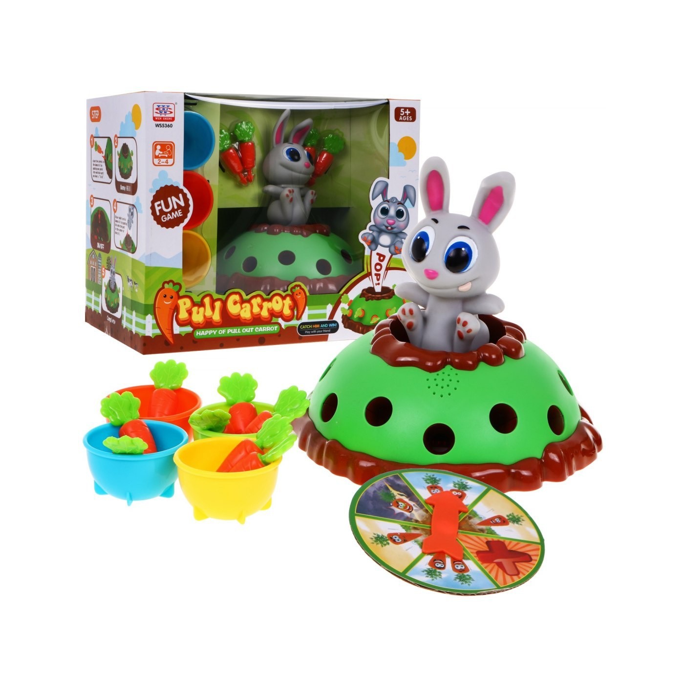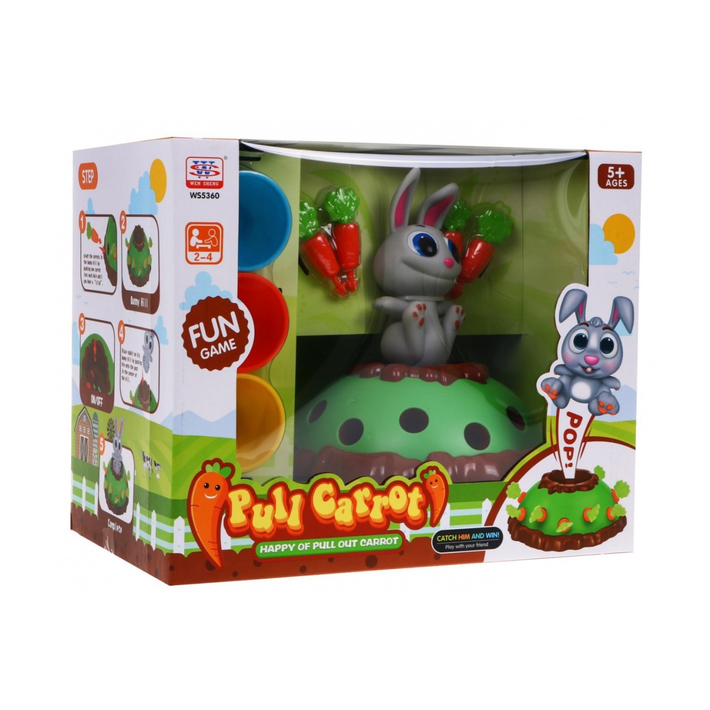 | Mały uroczy króliczek pilnuje swojego kopca z marchewkami, czy uda Ci się podebrać mu marchewkę? Zabawna rodzinna gra zręcznościowa polegająca na podkradaniu króliczkowi marchewek. Ilość graczy 2-4 osoby. Gra rozpoczyna się od zakręcenia strzałką tarczy losującej. Strzałka wskazuje ile marchewek należy zabrać królikowi. Marchewki należy zabierać z kopca bardzo powoli, jeżeli uda Ci się zabrać taką ilość jak wskazała tarcza, grę kontynuuje kolejny gracz i kolejny. Marchewki zabrane królikowi należy umieścić w miseczce (4 szt. w zestawie). Nagle przy wyjmowaniu jednej z marchewki króliczek się przestraszył i wyskoczył ze strachu bardzo wysoko w powietrze. Czy uda Ci się go złapać? Osoba której przy wyjmowaniu marchewek króliczek się przestraszył musi go złapać, jeżeli jej się uda wygrywa, jeśli nie wygrywa ta osoba której udało się zabrać więcej marchewek. Gra przeznaczona jest dla dzieci od 5 – go roku życia. Gra posiada efekty dźwiękowe i świetlne (skoczna muzyczka + migające światła). Gra zasilana jest bateriami typu 3 x AG13 (w zestawie). | |