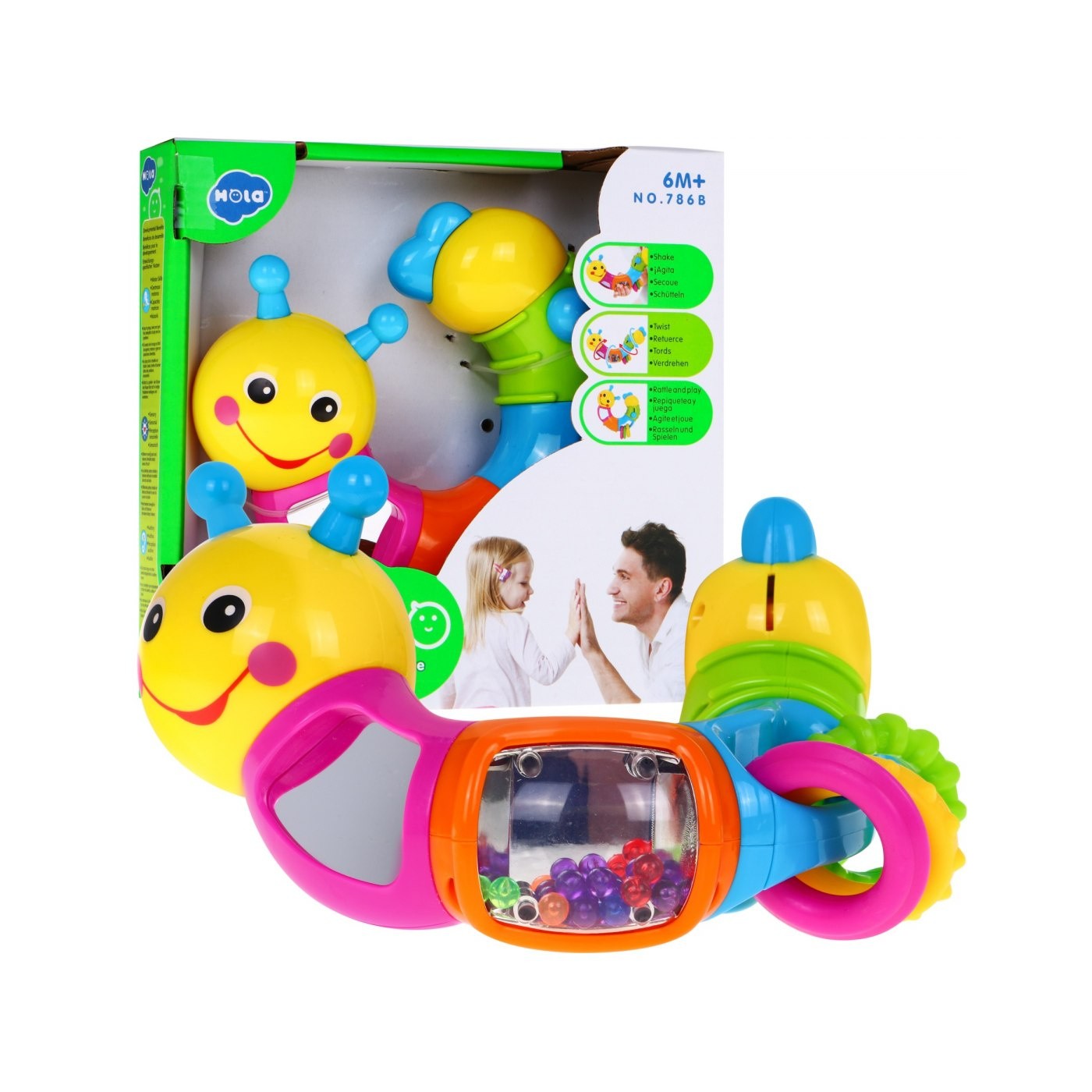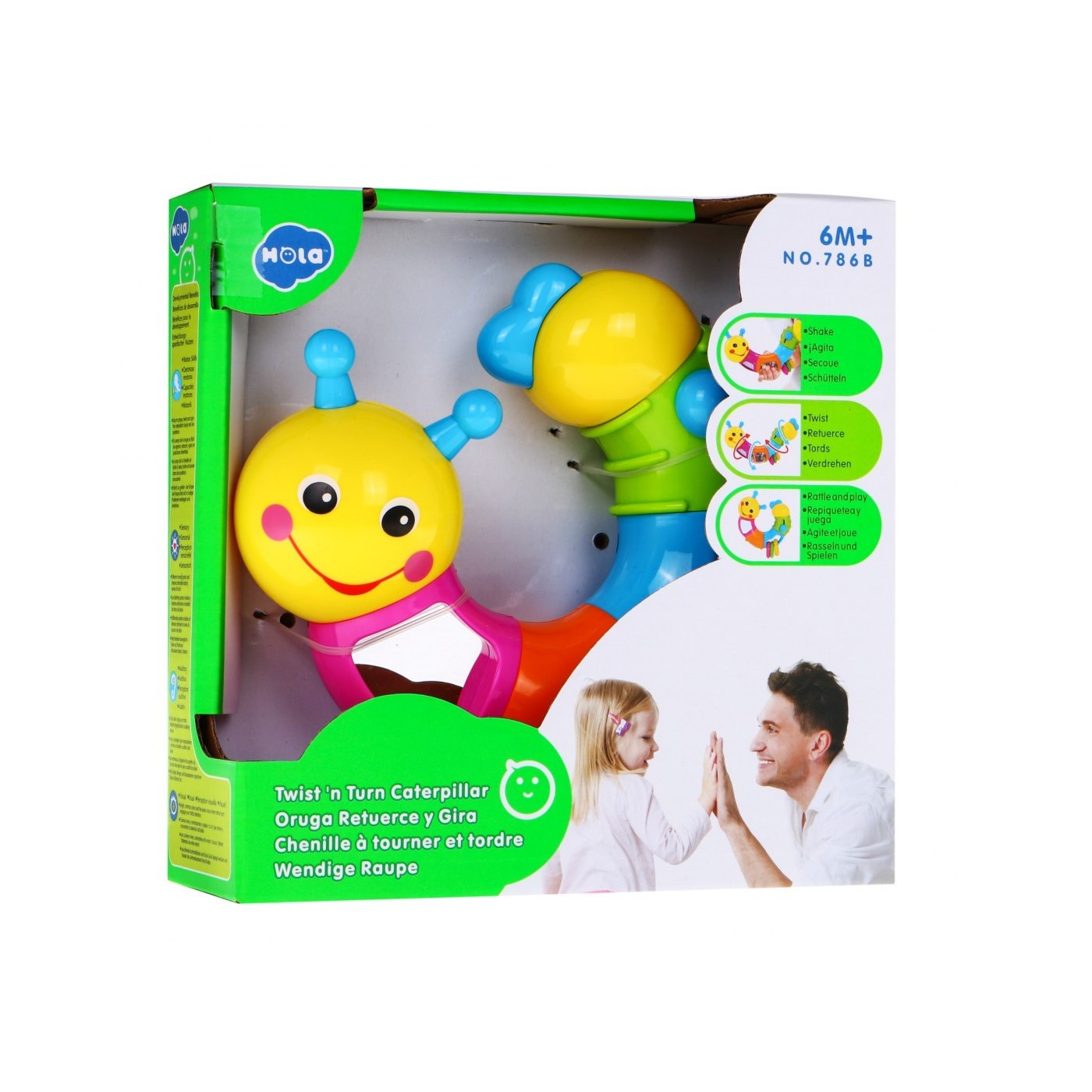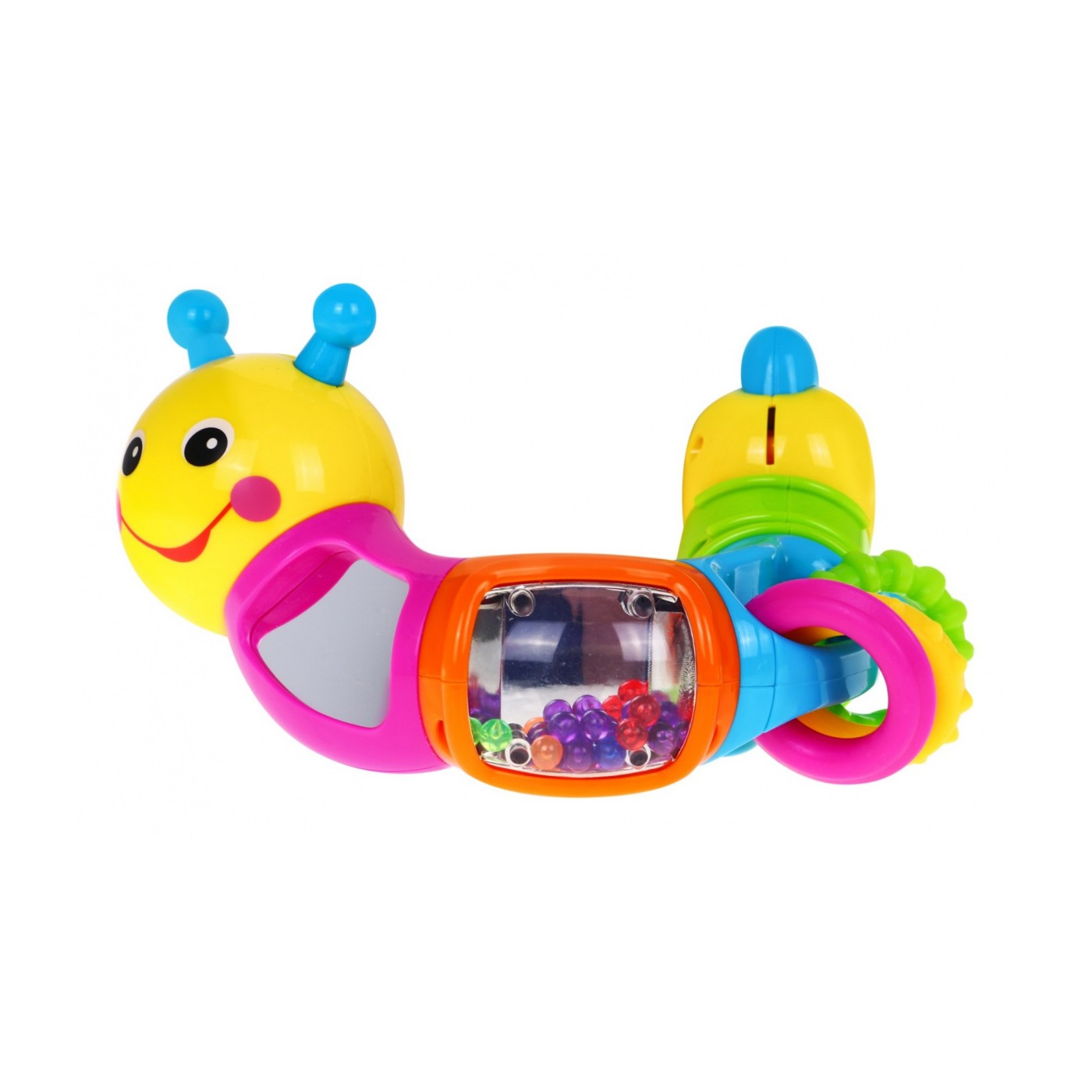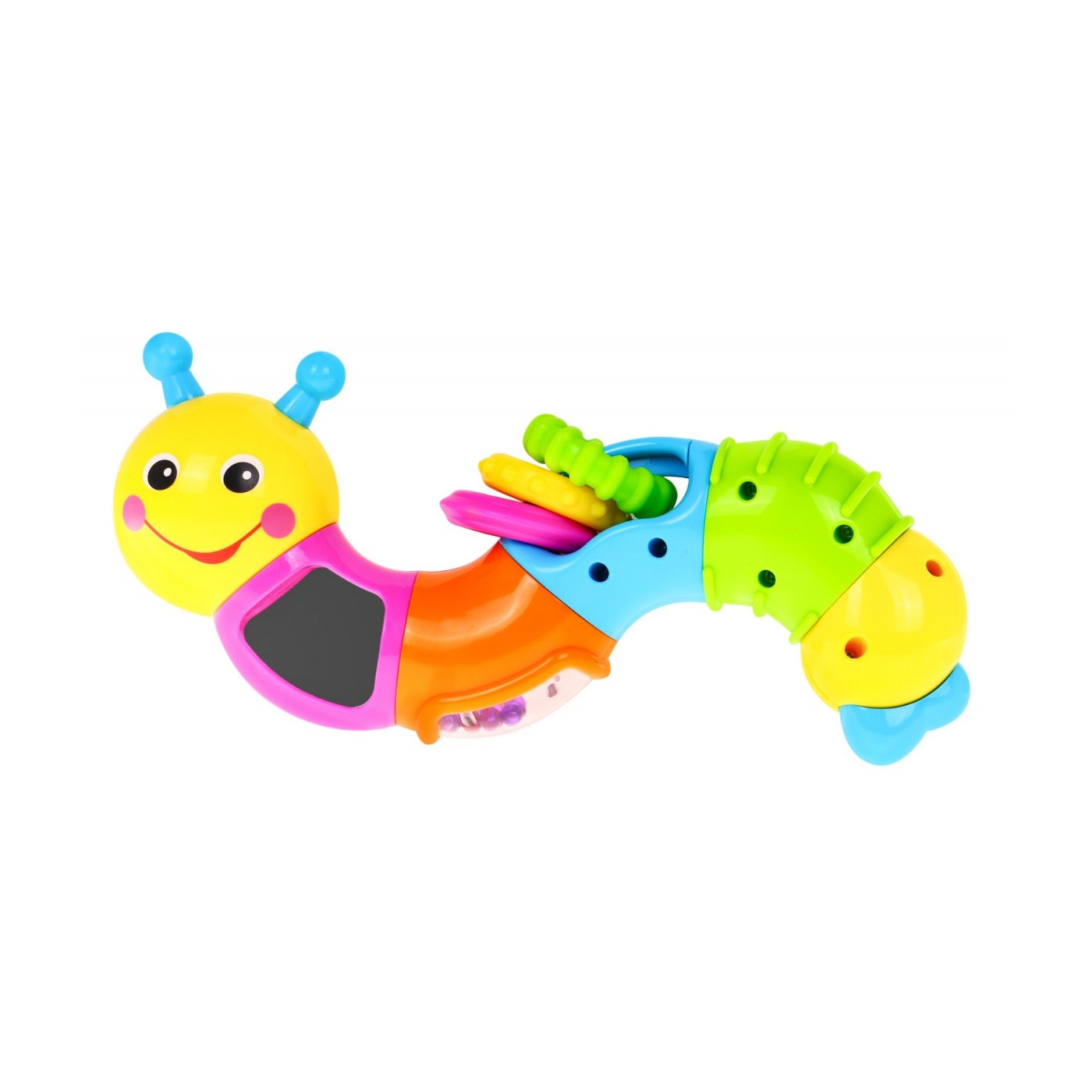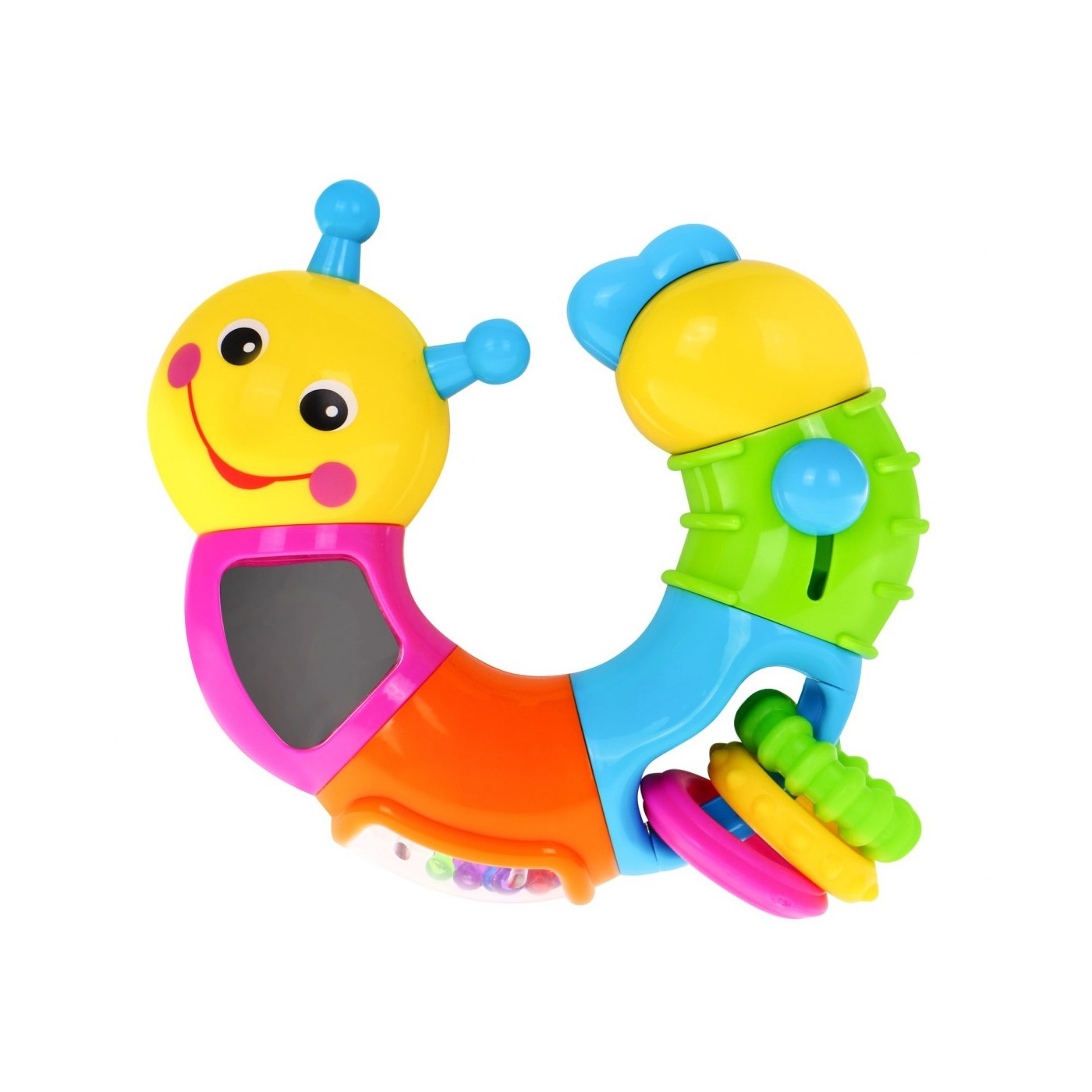 | | GĄSIENNICA posiada sześć edukacyjnych segmentów. Każdy segment jest inny i zaskakuje nas swoimi propozycjami zabawy. Bardzo solidne wykonanie i żywa kolorystyka dodatkowo przyciągają naszą uwagę PIERWSZY SEGMENT głowa gąsienicy z uśmiechniętą buzią obraca się wokoło własnej osi o 360 stopni wydając przy tym dźwięk chrobotania. DRUGI SEGMENT posiada wbudowane bezpieczne lusterko i dodatkowo obraca się wokoło własnej osi o 360 stopni wydając przy tym trzeszczący dźwięk. TRZECI SEGMENT posiada kuleczki w pojemniku z bezpiecznego lusterka oraz obraca się wokoło własnej osi o 360 stopni wydając przy tym dźwięki - kuleczki grzechoczą podczas zabawy. CZWARTY SEGMENT posiada trzy ruchome elementy w kształcie koła z różnymi wypustkami przymocowane na stałe do zabawki. Tak jak poprzednie części segment obraca się wokoło własnej osi o 360 stopni wydając przy tym dźwięk chrobotania. Kółka są miękkie i zastępują gryzaczek. PIĄTY SEGMENT posiada ruchome półkole, które można przesuwać wzdłuż segmentu. Tak jak poprzednie części obraca się wokoło własnej osi o 360 stopni wydając przy tym dźwięk chrobotania. SZÓSTY SEGMENT ogon gąsienicy obraca się wokoło własnej osi o 360 stopni wydając przy tym dźwięk chrobotania. Dzięki obrotowym elementom gąsienicę może przybierać niezliczoną ilość kształtów. Zabawka nie wymaga baterii. |