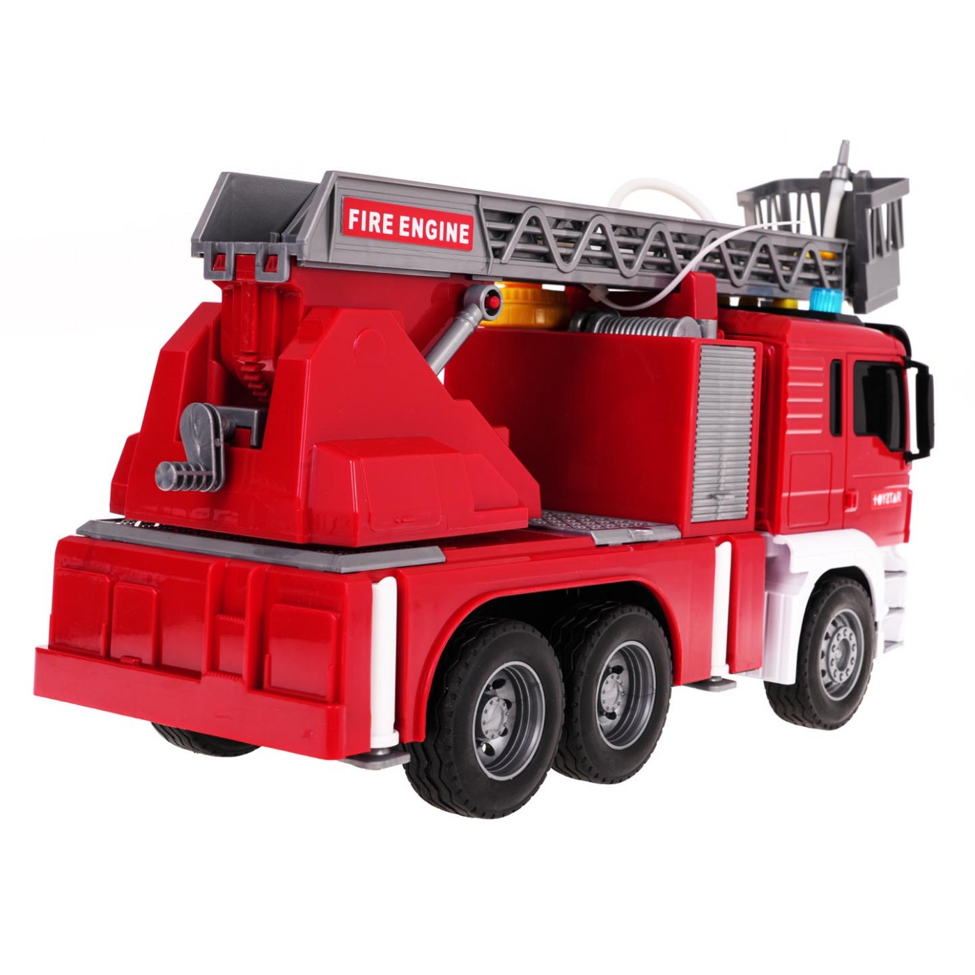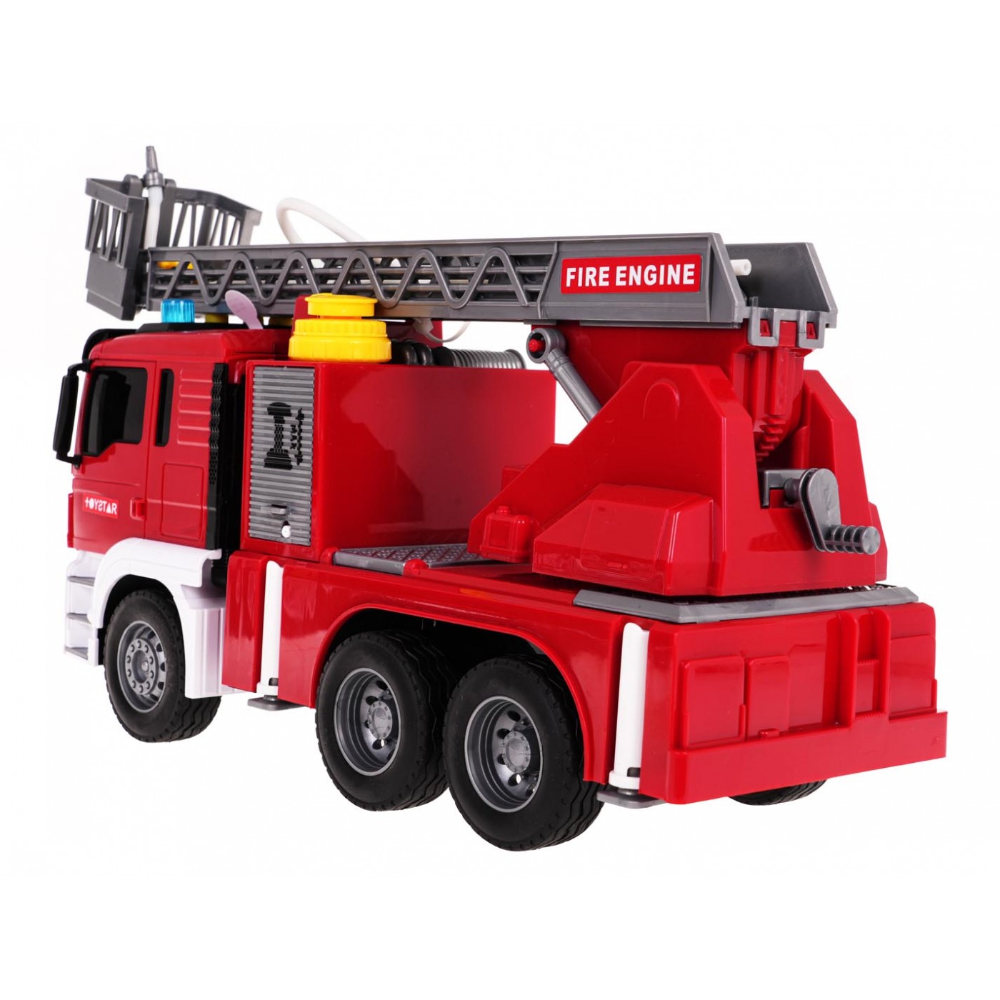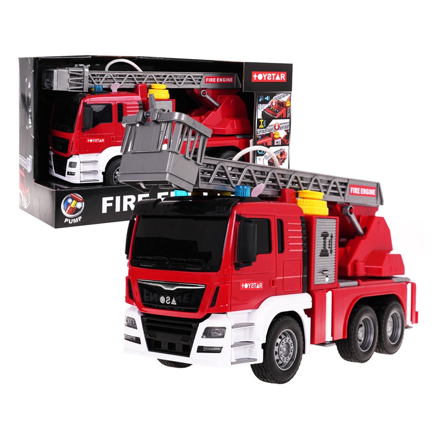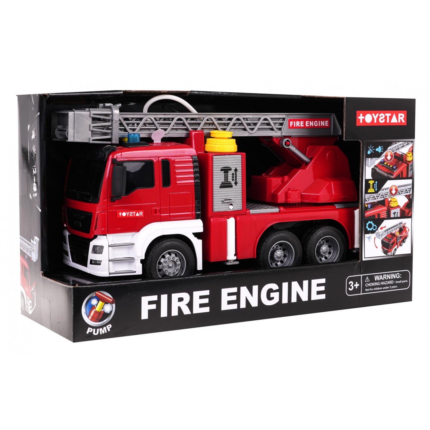 Interaktívna hasičská zbrojnica s vodnou funkciou pre deti od 3 rokov. Záštita je vyrobená z najkvalitnejšieho plastu v živých farbách. Má gumené pneumatiky, dobrú priľnavosť k zemi a pohon Friction. V hornej časti hasičského auta sú tlačidlá zodpovedné za generovanie zvukov sirén, zvukov štartovania vozidla a chodu motora. Po stranách zvukových tlačidiel sú tiež svietiace svetlá. Môžeme zdvíhať a spúšťať rebrík hasičského auta a posúvať ho dopredu (ručne). Po naplnení nádrže umiestnenej vedľa kabíny vozidla vodou a stlačení čerpadla bude voda vytekať z hadice. Hračka je napájaná 3 x AG13 batériami (sú súčasťou balenia).