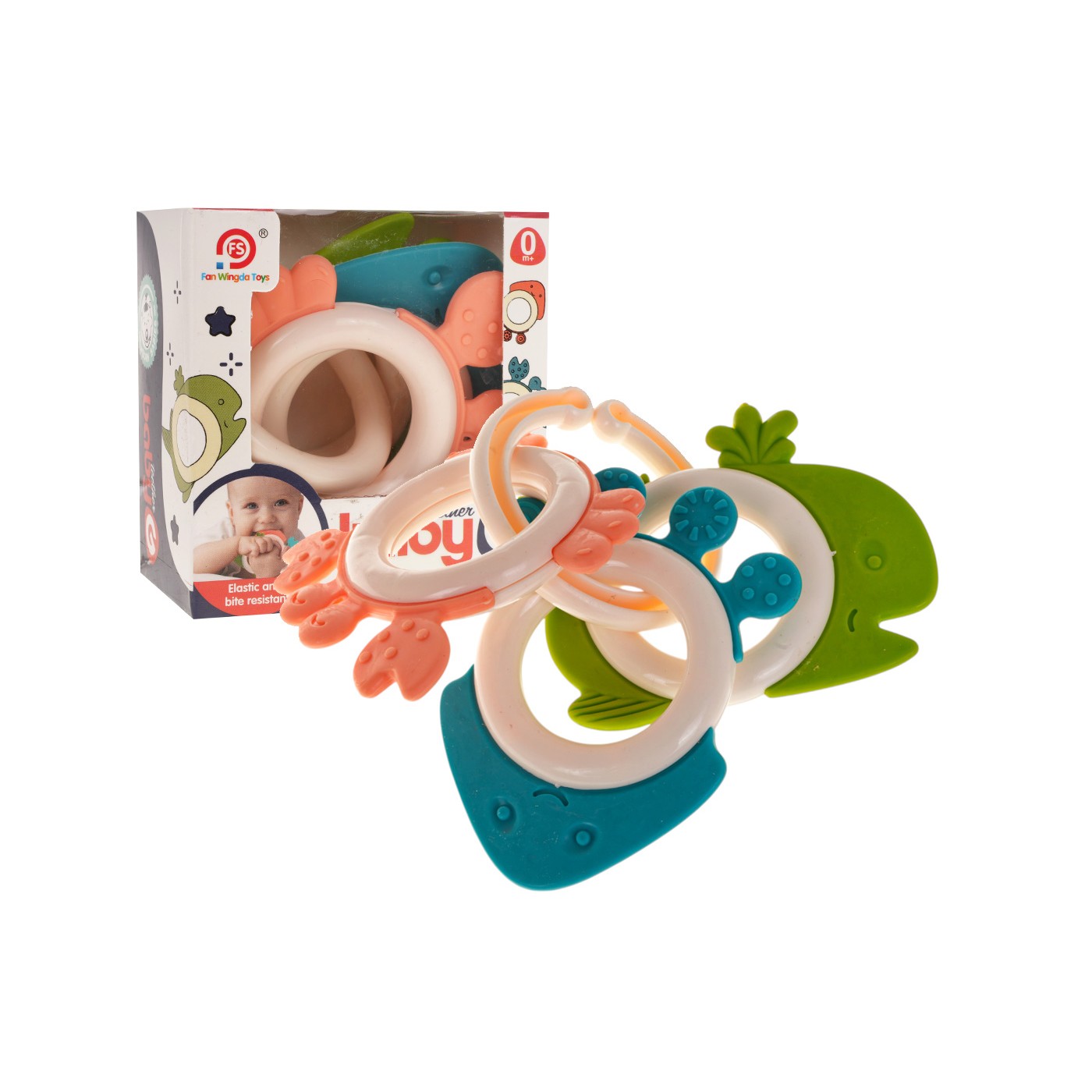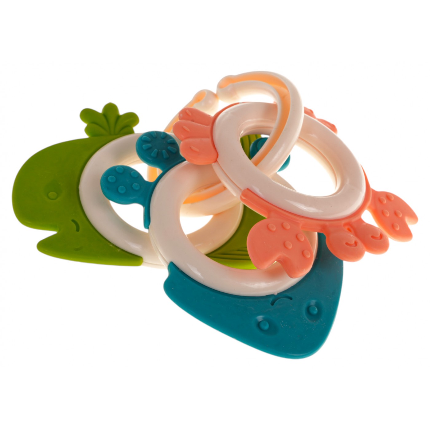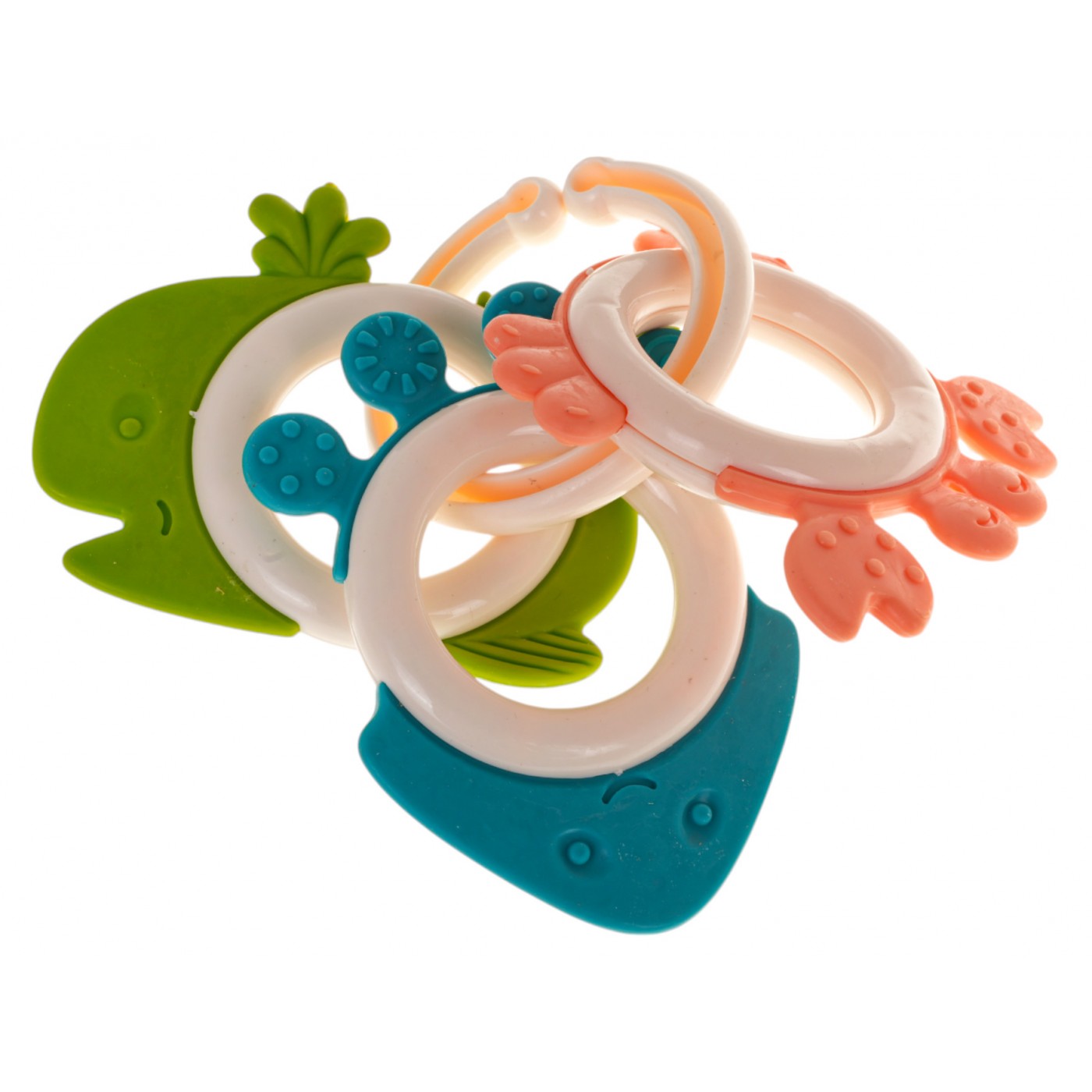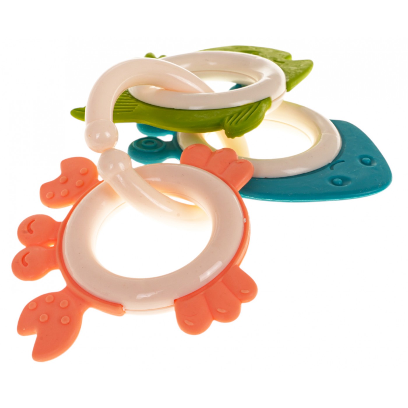 Hryzátko so zvieratkami pre bábätká od prvých dní života. Je bezpečný, precvičuje úchop, pomáha rozoznávať farby a tvary a je nenahraditeľný pri prerezávaní zúbkov. Hračka sa skladá z troch plastových krúžkov s gumenými výstupkami pripomínajúcimi morské živočíchy ako je krab, chobotnica alebo delfín. Keď hračkou zatrasiete, vaše dieťatko bude počuť hrkajúci zvuk.