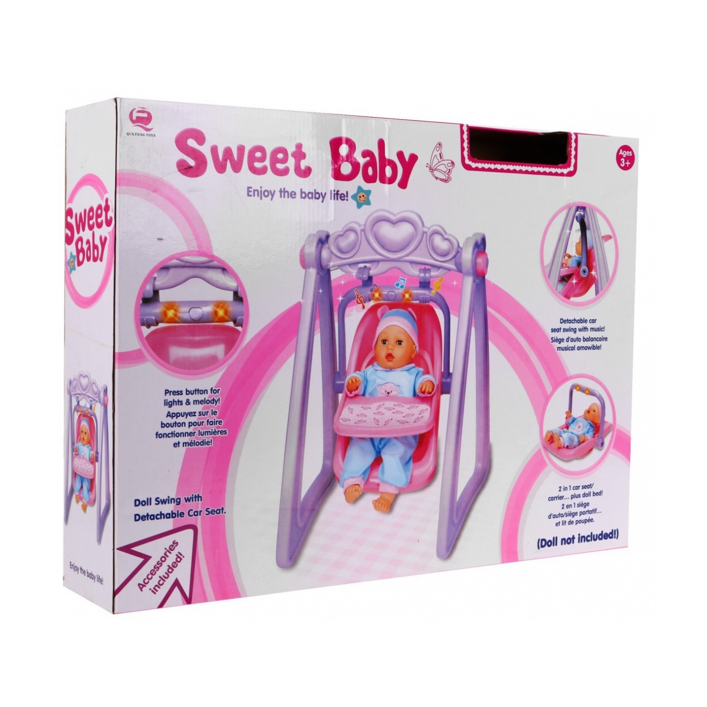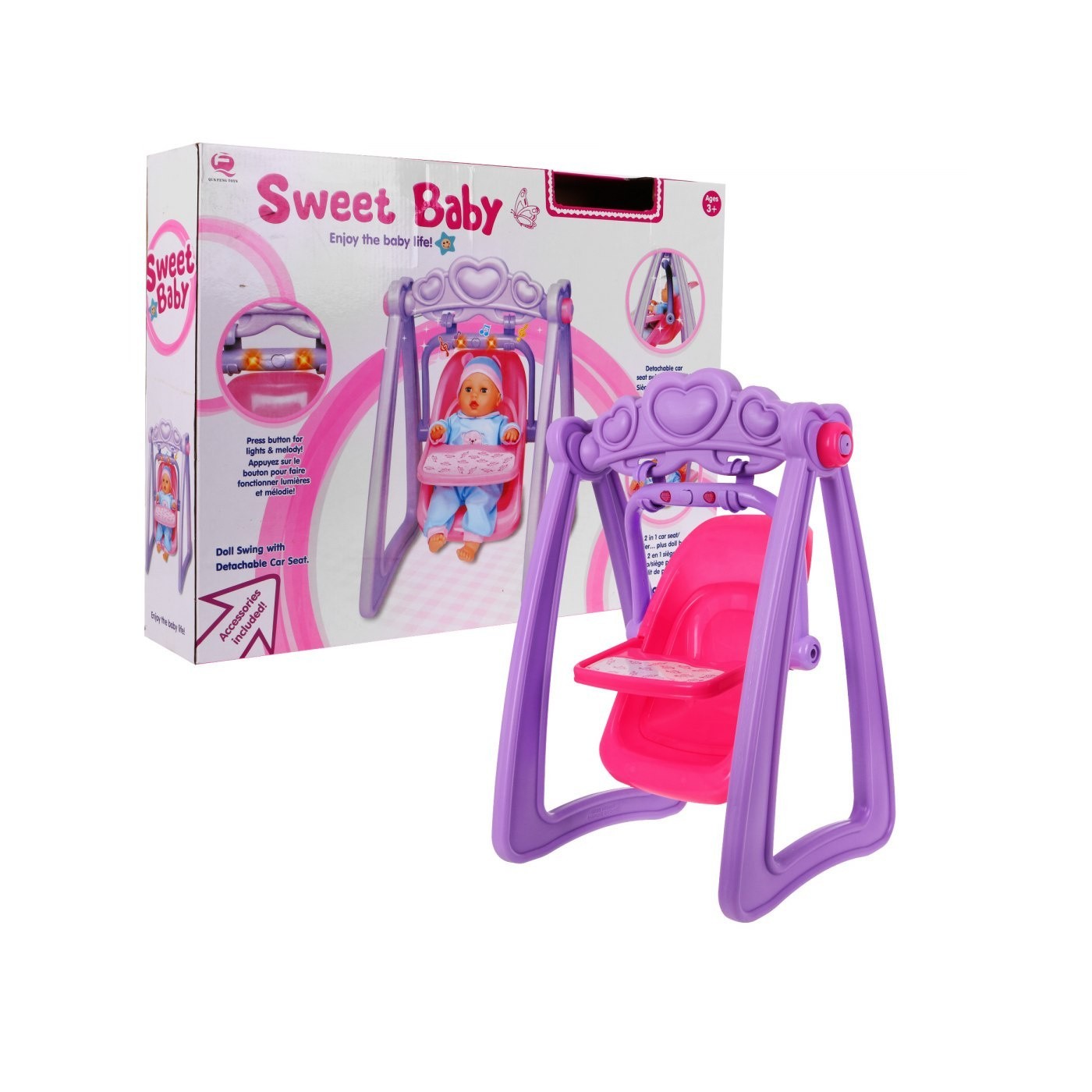 | | Idealna propozycja dla dziewczynek, które lubią bawić się lalkami. Dzięki temu zestawowi mała opiekunka znakomicie spędzi czas ze swoimi ulubionymi zabawkami. Dodatkowym atutem zabawki są efekty dźwiękowe (mrugające serduszka nad siedzeniem) oraz dźwiękowe (miłe dla ucha melodyjki). Zestaw wykonany został w ślicznych różowo- fioletowych kolorach. Jeśli znudzi się zabawa w huśtanie lali, dziecko może bez problemu przekształcić huśtawkę w krzesełko do karmienia lub nosidełko. Dzięki nosidełku, dziecko będzie mogło zabrać swoją lalę wszędzie ze sobą. Zabawka przeznaczona dla dzieci od 3-go roku życia i posiada certyfikat CE. Całość zapakowana w kolorowe opakowanie, idealnie nadaje się na prezent. Zabawka zasilana bateriami typu 2 x AG13 w zestawie. UWAGA, brak lalki w zestawie. |
