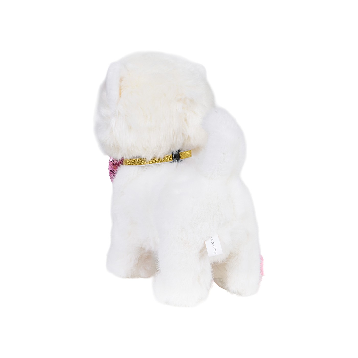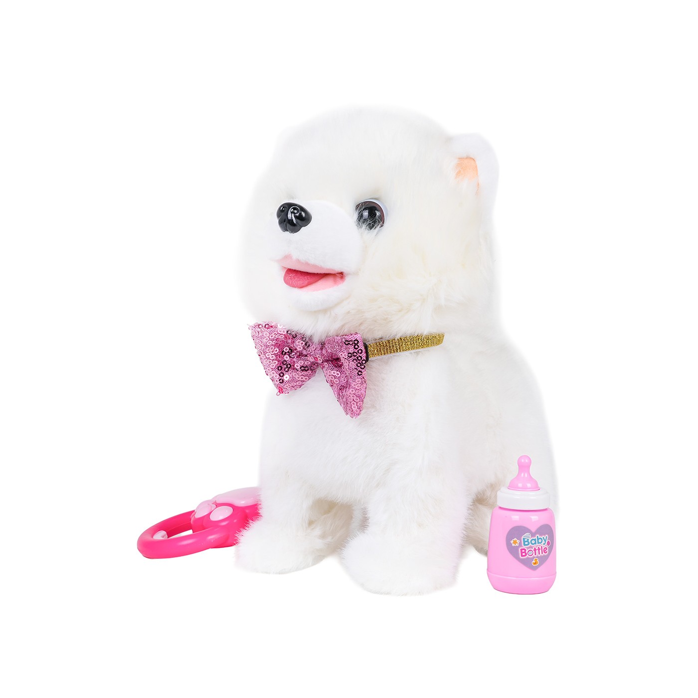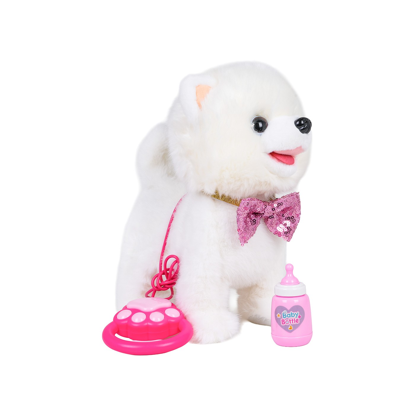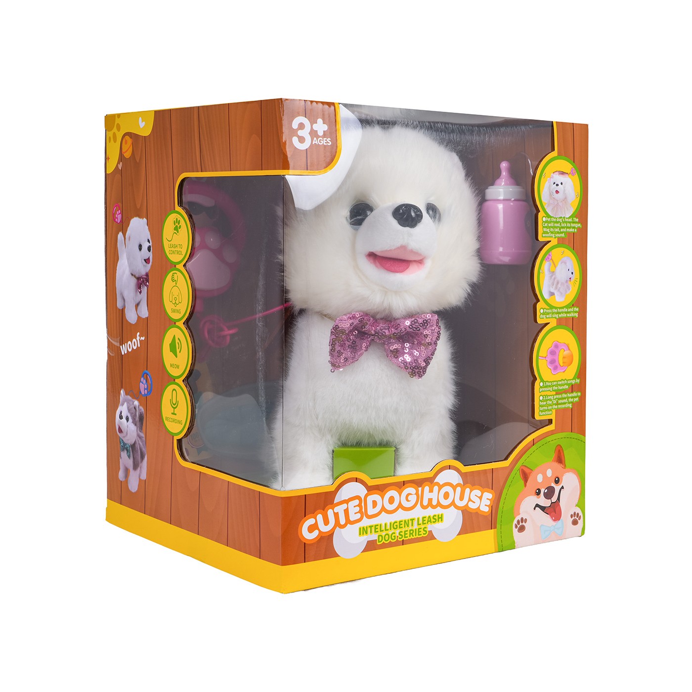 Interaktívny, senzorický biely psík pre deti od troch rokov. Vyrobený z mäkkého, pre deti bezpečného materiálu, psík je ideálny na hladkanie a maznanie. Hračka vyzerá presne ako skutočný domáci miláčik a má interaktívne prvky. Dotknite sa psej hlavy a zviera s vami bude interagovať. Bude prikyvovať hlavou, vrtieť chvostom, vydávať štekacie zvuky, olizovať si jazyk a kráčať. Psík sa dodáva s interaktívnym vodítkom. Krátke stlačenie vodítka spustí u psa štekanie, vyplazovanie jazyka, vrtenie chvostom a chôdzu do rytmu hudby. Stlačením a podržaním spúšte sa aktivujú funkcie nahrávania a prehrávania; psík sa po vás bude opakovať. Psík sa dodáva s fľašou. Hračka je napájaná 3 x AA 1,5V batériami (nie sú súčasťou balenia).