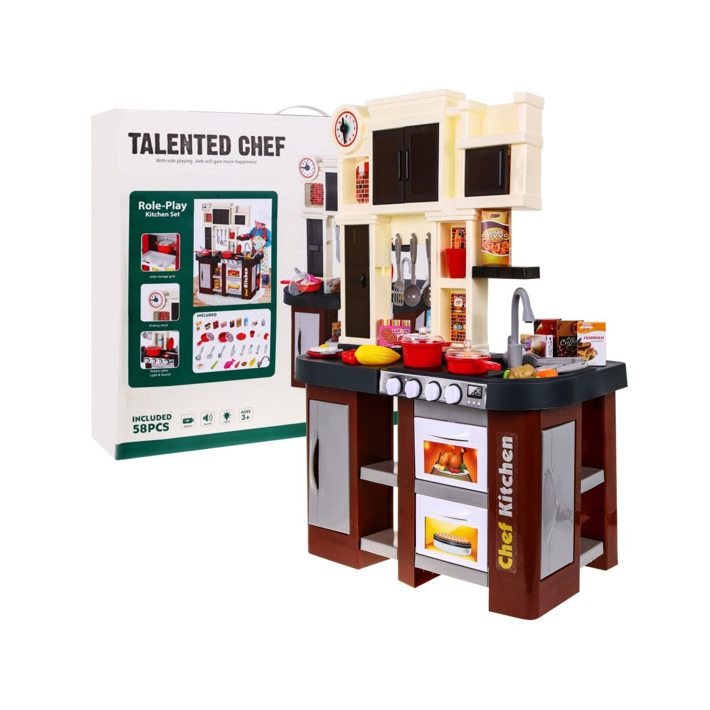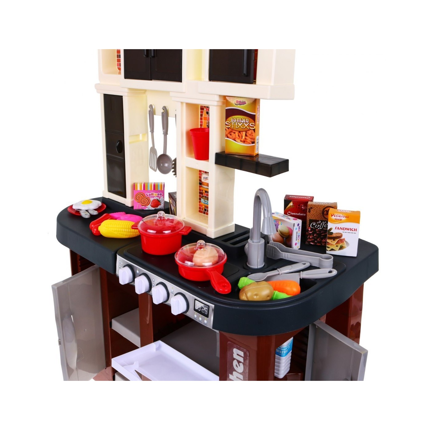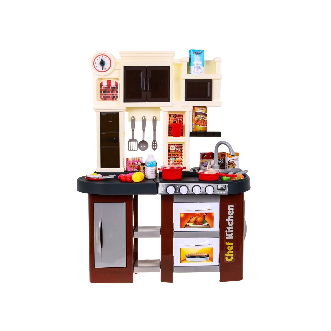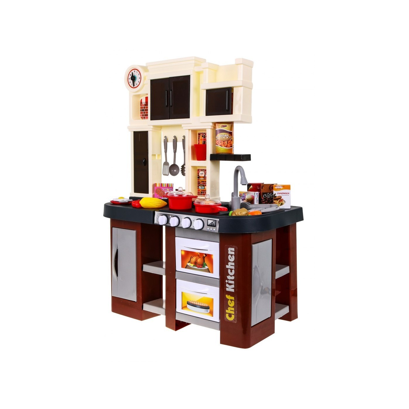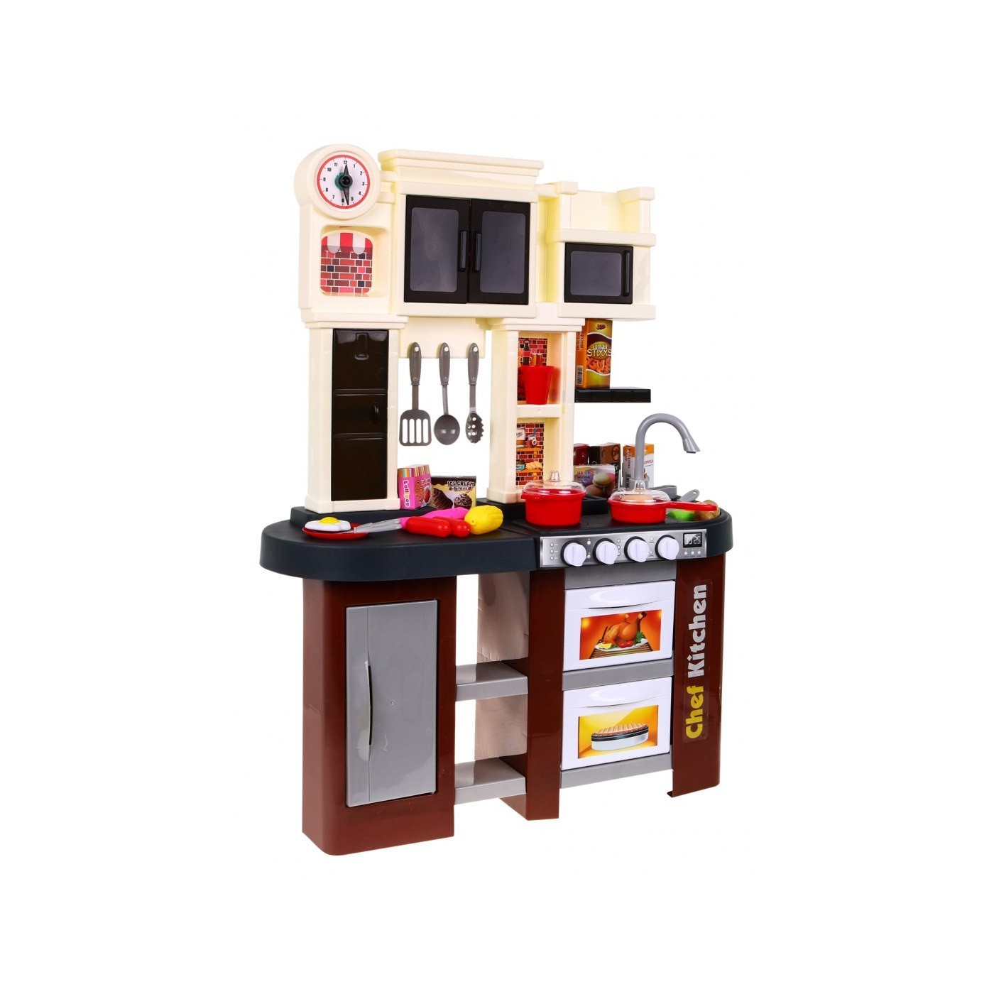 Interaktívna hnedá Kuchyňa pre deti 3+ Horáky so zvukom a svetlom + Kohútik s vodou + Príslušenstvo 58 ks.