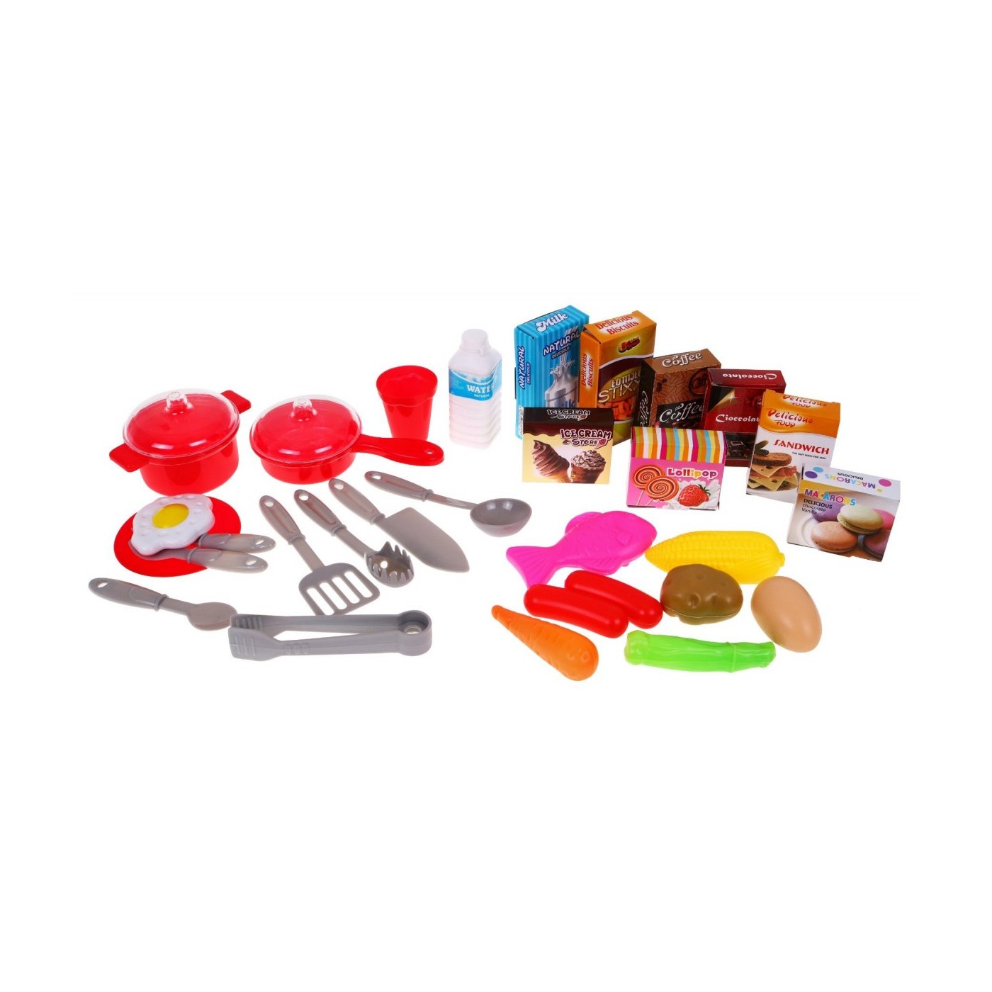 | - kuchnia z kranem, piekarnikiem, półeczkami, płytą do gotowania, szafeczkami, - naklejki do samodzielnego ozdobienia kuchni, - patelnia z pokrywką ok. 14 cm x 7,5 cm x 5,5 cm, - garnek z pokrywką ok. 10,5 cm x 8 cm x 6,5 cm, - talerzyk średnica ok. 8 cm, - kubeczek ok. 5 cm x 4,5 cm, - butelka ok. 8,5 cm x 3 cm, - chochelka, łopatka, cedzak, szczypce do mięsa ok. 12,5 cm x 3,5cm, - mały widelec, nożyk, łyżeczka ok. 10 cm x 2,5 cm, - duży nożyk ok. 13 cm x 3,5 cm, - warzywa (kapusta, kukurydza, ziemniak, marchewka), - jajko sadzone, - parówki, - jajko, - ryba, - kartoniki z ciasteczkami, kawą, czekoladom, lizakami, ciasteczkami, mlekiem, lodami. | |