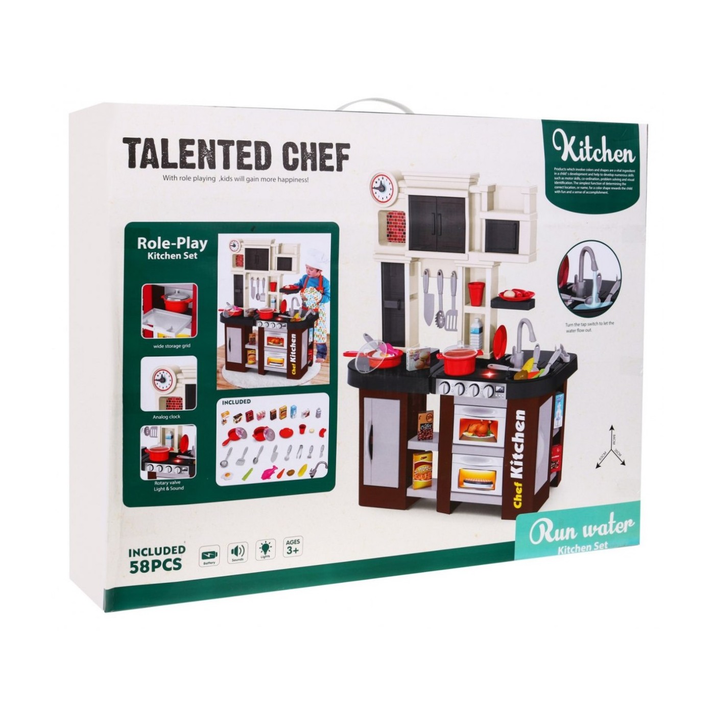 | | Wysokiej jakości, duża kuchnia interaktywna z prawdziwą bieżącą wodą z kranu, światłami i dźwiękami gotowania oraz smażenia. Zestaw z pewnością spodoba się każdemu małemu szefowi kuchni. Zabawka idealna zarówno dla chłopca jak i dziewczynki. Zabawka przeznaczona jest dla dzieci od 3 – go roku życia i posiada certyfikat CE. Zabawka zasilana jest bateriami typu 3 x AA (brak w zestawie). Opis funkcji kuchni: 1. Palniki po przekręceniu wydają odgłosy (gotowanie, smażenie). 2. Palniki podświetlają się przy gotowaniu. 3. Zegar z ruchomymi wskazówkami. 4. Kranik z prawdziwą wodą. 5. Możliwość otwierania piekarnika, szafeczek, lodówki Zestaw składa się z 58 elementów. |