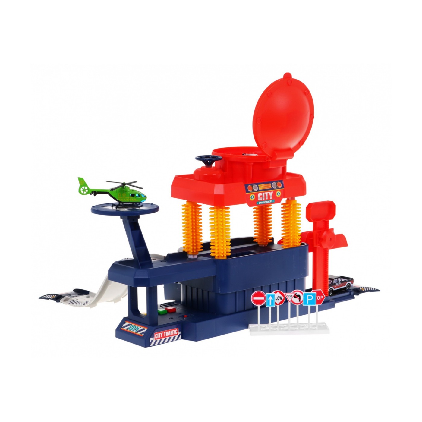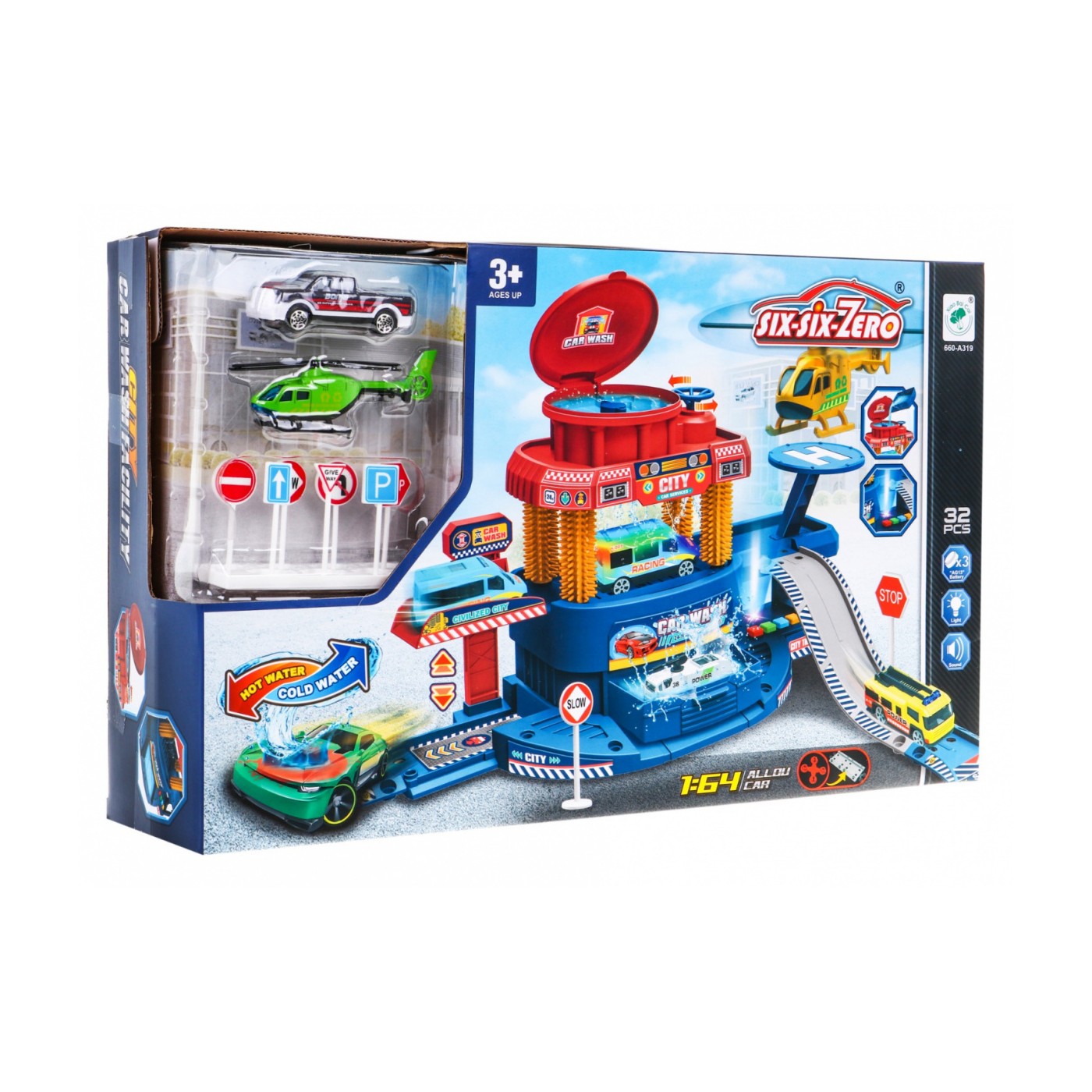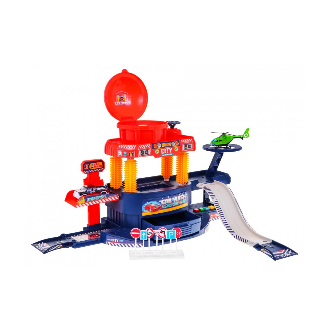 | | Niesamowita myjnia na wodę to zabawka dla małych miłośników motoryzacji od 3- go roku życia. Zabawka posiada 3 poziomy. Pierwszy i drugi poziom na których umiejscowiona jest myjnia, połączony jest ruchomą windą na korbkę. Na dole znajduje się także panel dźwiękowy z różnymi odgłosami syren i migającym światełkiem LED. Na górze jest lotnisko dla helikoptera oraz zbiornik na wodę. Po uzupełnieniu zbiornika wodą, kręcimy korbką a woda przedostaje się na niższe poziomy „myjąc samochody”. Do zestawu dołączony jest pojazd, helikopter i znaki. Zabawka zasilana jest bateriami typu 3 x AG, które znajdują się w zestawie. |