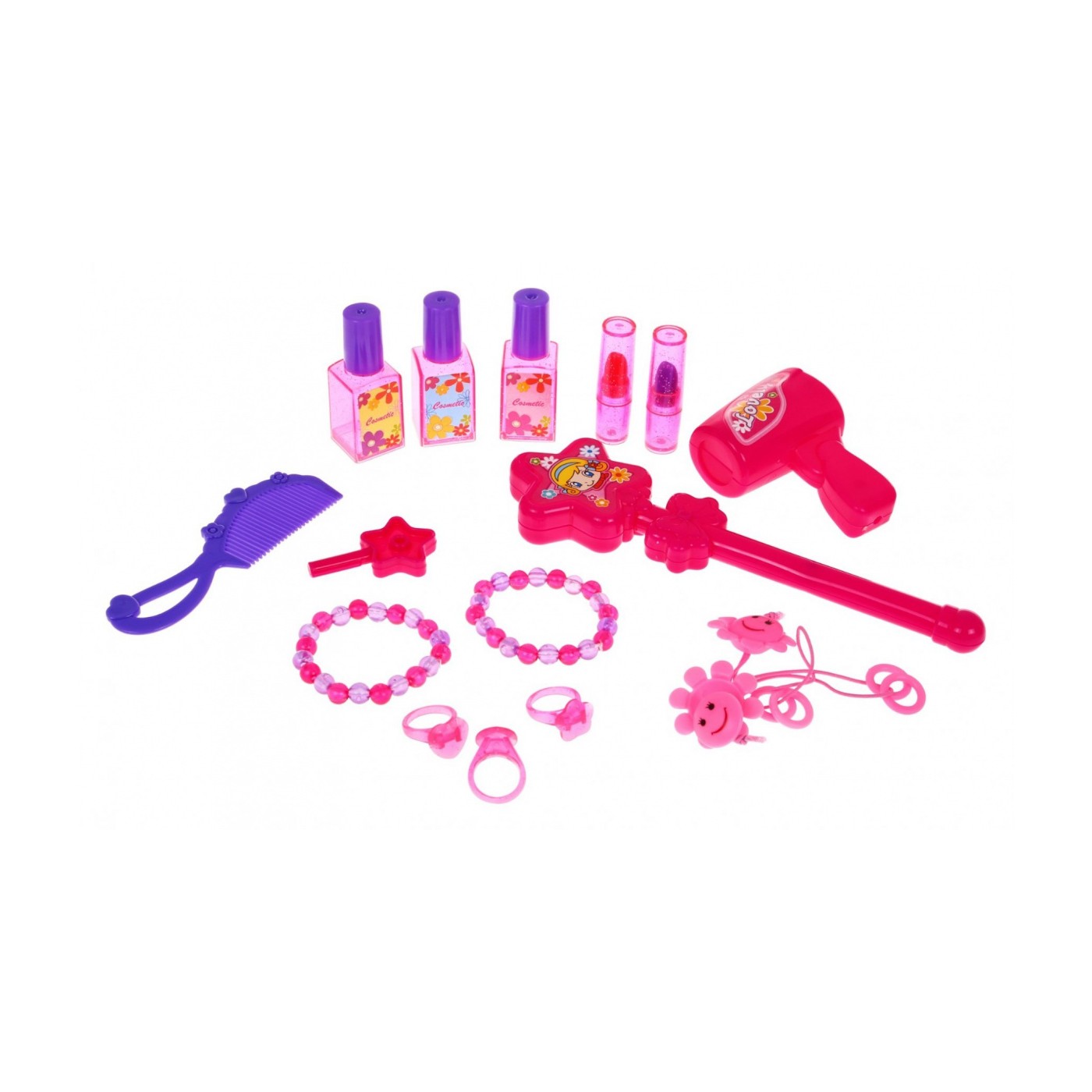 | - toaletka z lustrem, - magiczna różdżka, - suszarka, - grzebień, - kluczyk do zamykania i otwierania szuflady, - 3 x flakonik z perfumami (atrapa), - 2 x bransoletki, - 3 x pierścionki, - 2 x szminka (atrapa), - 2 x gumka do włosów. | |