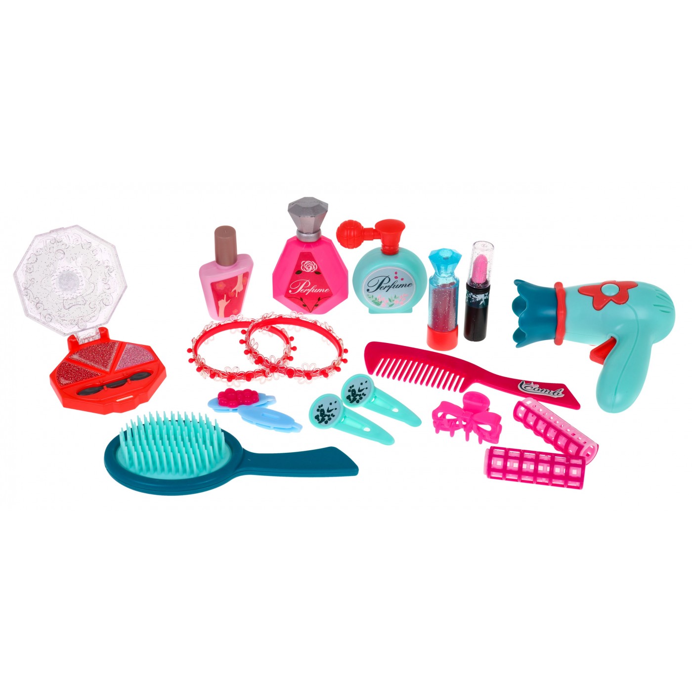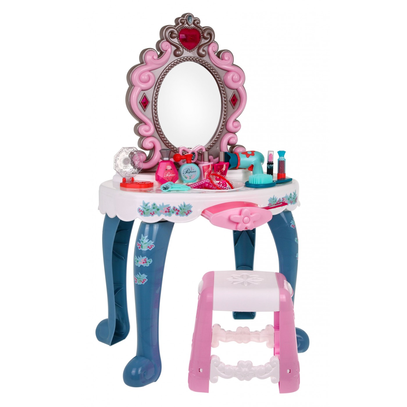 | | - toaletka z lustrem i taboretem, - suszarka w której po naciśnięciu przycisku słychać odgłos suszenia (suszarka nie wymaga baterii), - szczotka do włosów, - grzebień, - dwie szminki, - dwa lakiery do paznokci, - perfumy z atomizerem, - perfumy w ozdobnej buteleczce (plastik), - cienie do powiek, - dwie bransoletki, - dwa wałki do włosów, - pięć spinek do włosów, - naklejki dekoracyjne |
