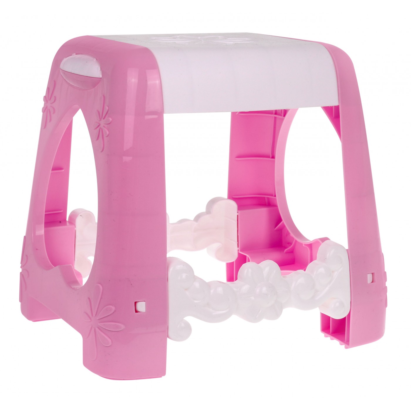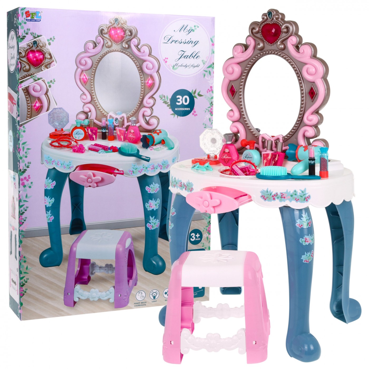 | | Interaktywna toaletka z lustrem, taboretem i akcesoriami dla małej księżniczki od trzeciego roku życia. Zabawka posiada funkcję dźwięku (trzy melodie) i światła (serduszko nad lustrem i dwa diamenciki po bokach lustra). Zabawka zasilana bateriami typu 2 x AA 1,5V (brak w zestawie). Wszystkie kosmetyki dołączone do zestawu są atrapami. |