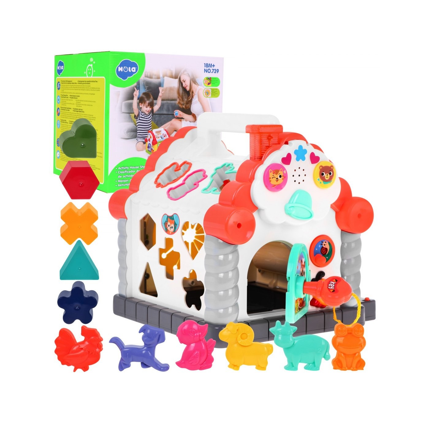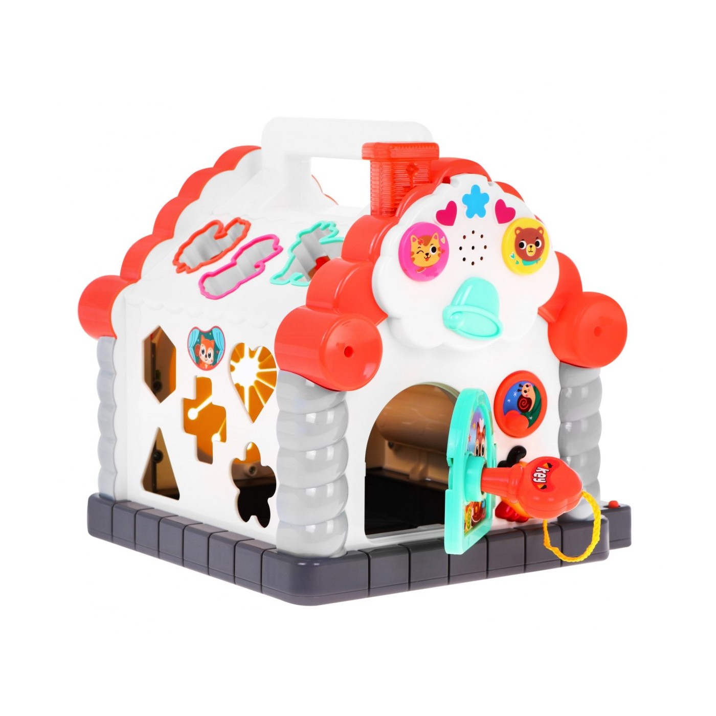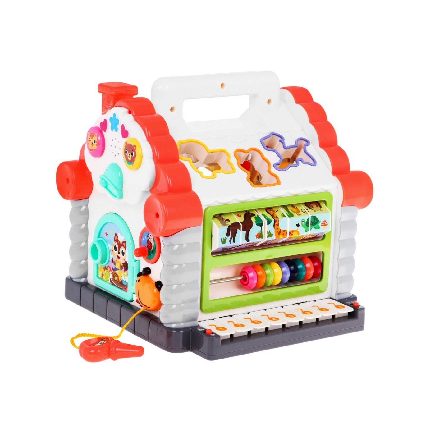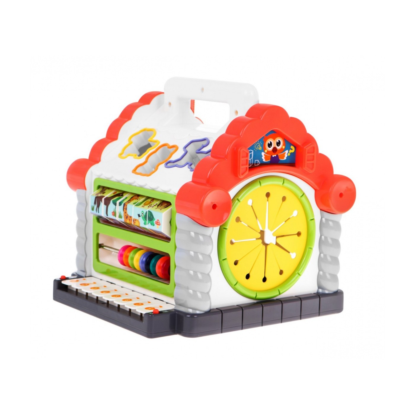 | - kolorowe pianino, które wygrywa pojedyncze dzwięki jak i całe melodie, - kolorowe liczydło, - obrotowe klocki z zadaniami matematycznymi, - otwierane i zamykane na kluczyk drzwi, - wysuwany na sznurku kluczyk, - korbkę do zwijania sznurka od klucza, - gumowy otwór przez który można wyciągać i zgadywać kształty klocków, - 11 o różnych kształtach i kolorach klocków, - 11 otworów do umieszczania klocków. | |