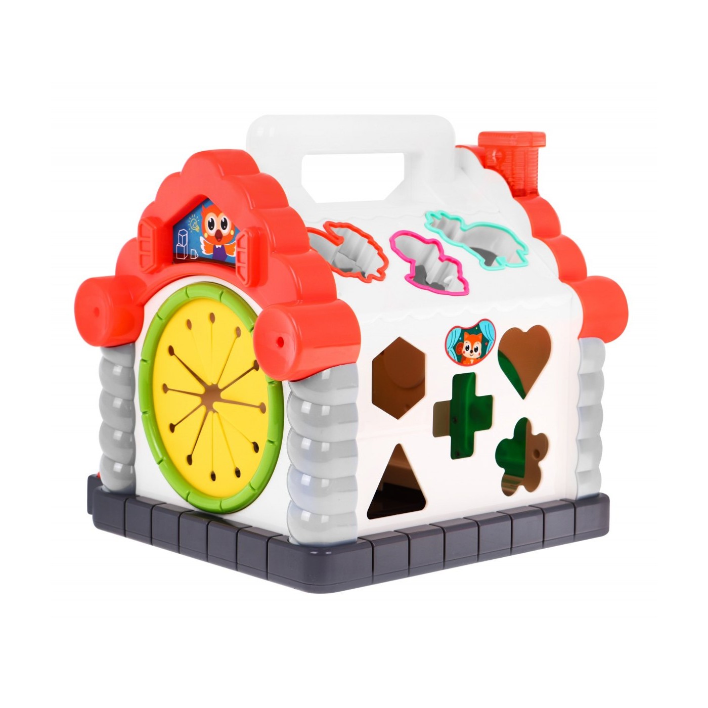 | Interaktywny domek dla dzieci od 18-go miesiąca życia. DOM posiada cztery interaktywne płaszczyzny boczne, oraz aktywne dwa spady dachowe. Każda płaszczyzna jest inna i zaskakuje swoimi propozycjami zabawy. Solidne wykonanie i żywa kolorystyka dodatkowo przyciągają uwagę. Otwory zwierząt znajdujące się na dachu wykończone są kolorową obwolutą odpowiadającą kolorowi klocka. Po poprawnym umiejscowieniu zwierzaka wydobywa się z domku odpowiedni dzwięk i świeci komin. Piesek – szczeka, kogut – pieje, krówka – muczy, baranek – beczy. | |