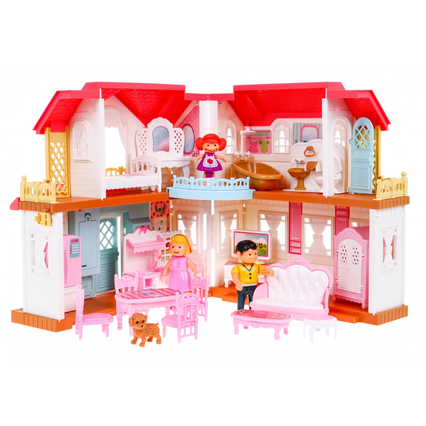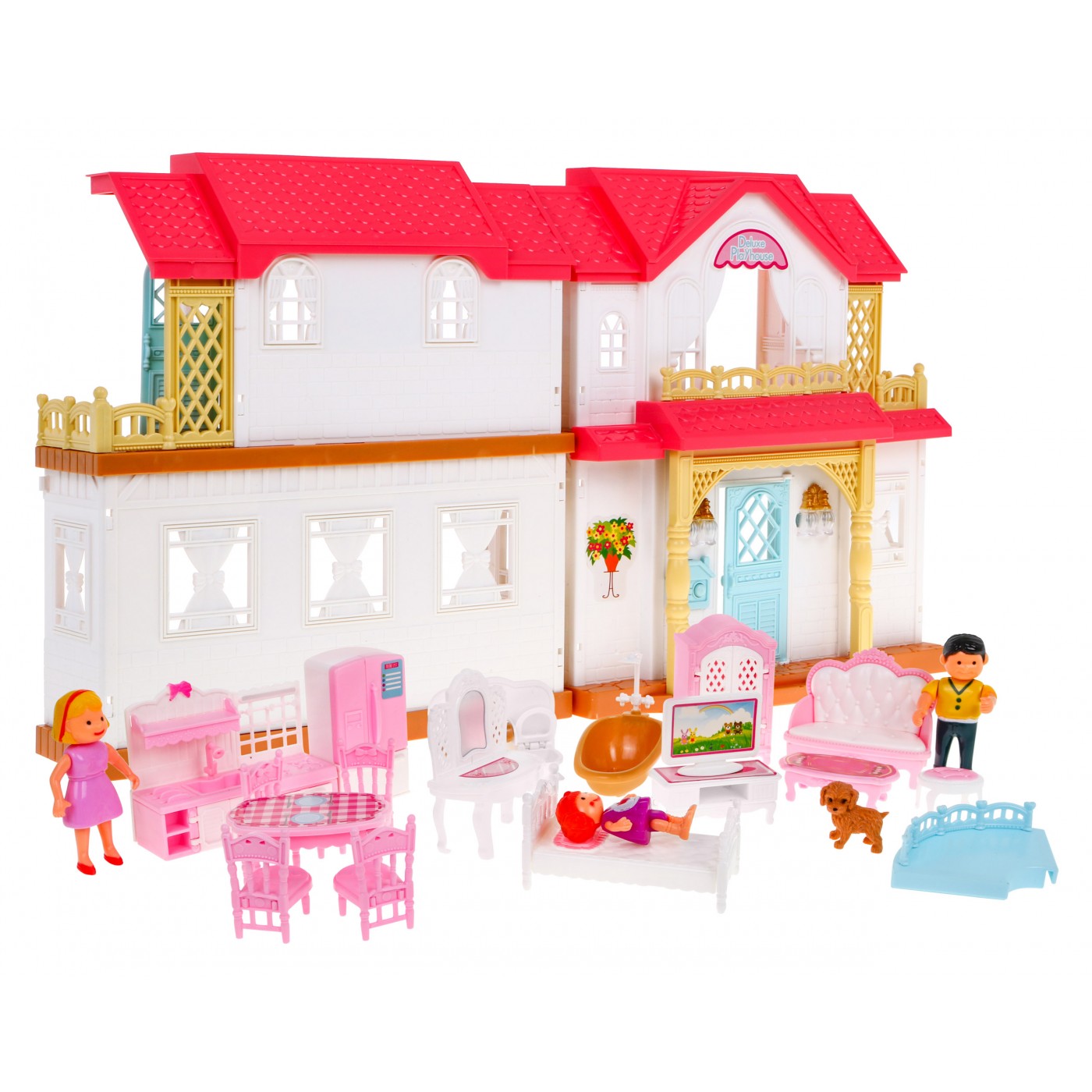 | | - domek-villa, - akcesoria: * lodówka z otwieranymi drzwiczkami i wysuwaną szufladą, * szafki kuchenne z otwieranymi drzwiczkami i otwieranym piekarnikiem, zlewozmywak oraz okap kuchenny, * telewizor, * komoda, * stół kuchenny, * 4 krzesła, * sofa, * ława, * łóżko, * toaletka z lustrem, * szafa z otwieranymi drzwiczkami, * mały stoliczek, * toaleta z podnoszoną deską, * wanna z prysznicem, * umywalka, * wieszaczek, * uchwyt na papier toaletowy, - postacie – figurka mamy, taty, dziecka oraz pieska, - naklejki dekoracyjne. |