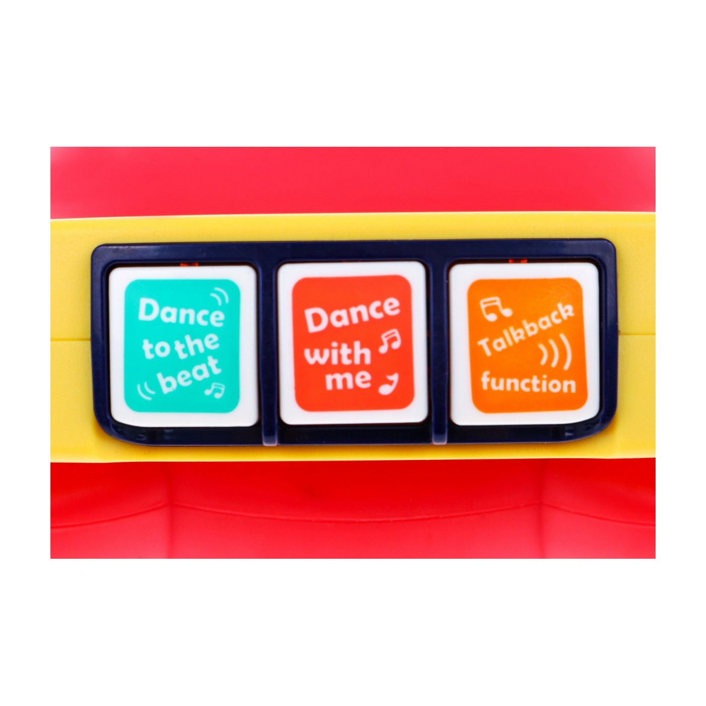 | Duży tańczący kotek to propozycja dla dzieci od 18 miesiąca życia. Kotek tańczy w miejscu w trybie STOP oraz chodzi i tańczy w trybie GO, zmiana trybów na spodzie zabawki. Ma wbudowany mikrofon, nagrywa to co mówimy i powtarza w zabawny sposób. Zabawka zasilana jest bateriami typu 4 x AA 1,5V których brak w zestawie. Na górze zabawki znajdują się słuchawki kotka, które jednocześnie pełnią funkcję wygodnej rączki do przenoszenia. Są tam też trzy przyciski, które uruchamiają różne funkcje. Pierwszy przycisk „tańcz do rytmu” kot tańczy, macha rękami, biodrami, kręci głową w takt muzyki. Jeżeli przesuniemy przycisk na spodzie zabawki z pozycji STOP na GO, kotek dodatkowo chodzi i kręci się w kółko. Na brzuszku kotka migają kolorowe światełka. Drugi przycisk „tańcz ze mną” kot uczy dziecko tańczyć, należy naśladować jego ruchy. I tu ponownie kotek tańczy w miejscu, lub chodzi i tańczy a na brzuszku kotka migają światełka. Przycisk trzeci kotek nagrywa to co do niego mówimy i powtarza po nas. Podczas nagrywania świeci się czerwone światełko na brzuszku kotka a podczas odtwarzania zielone. Jeżeli poruszymy ogonkiem kotka z boku na bok, usłyszymy zabawne efekty dźwiękowe. Zabawa kotkiem pomaga wyćwiczyć poczucie rytmu u dziecka i nauczyć go podstawowych ruchów tanecznych. Zabawka ma możliwość regulacji głośności. Funkcje zabawki: - dźwiękowe (muzyka), - świetlne (migające światełko na brzuszku kotka), - poznawcze-kształcące, - kotek chodzi oraz tańczy, - posiada wbudowany mikrofon, - regulacja głośności. | |