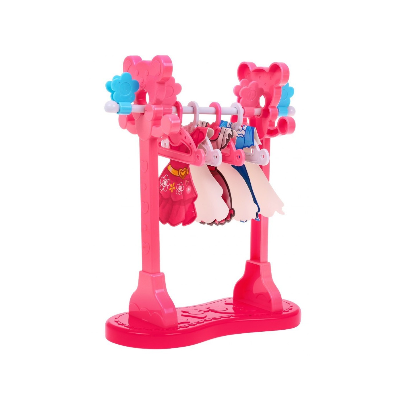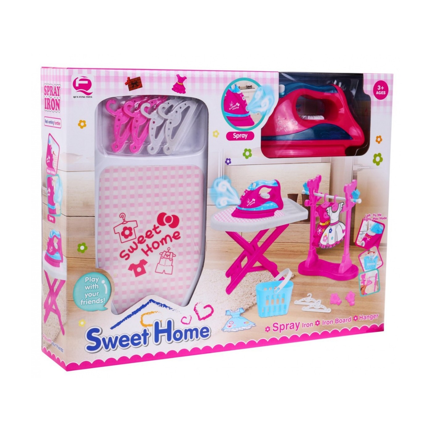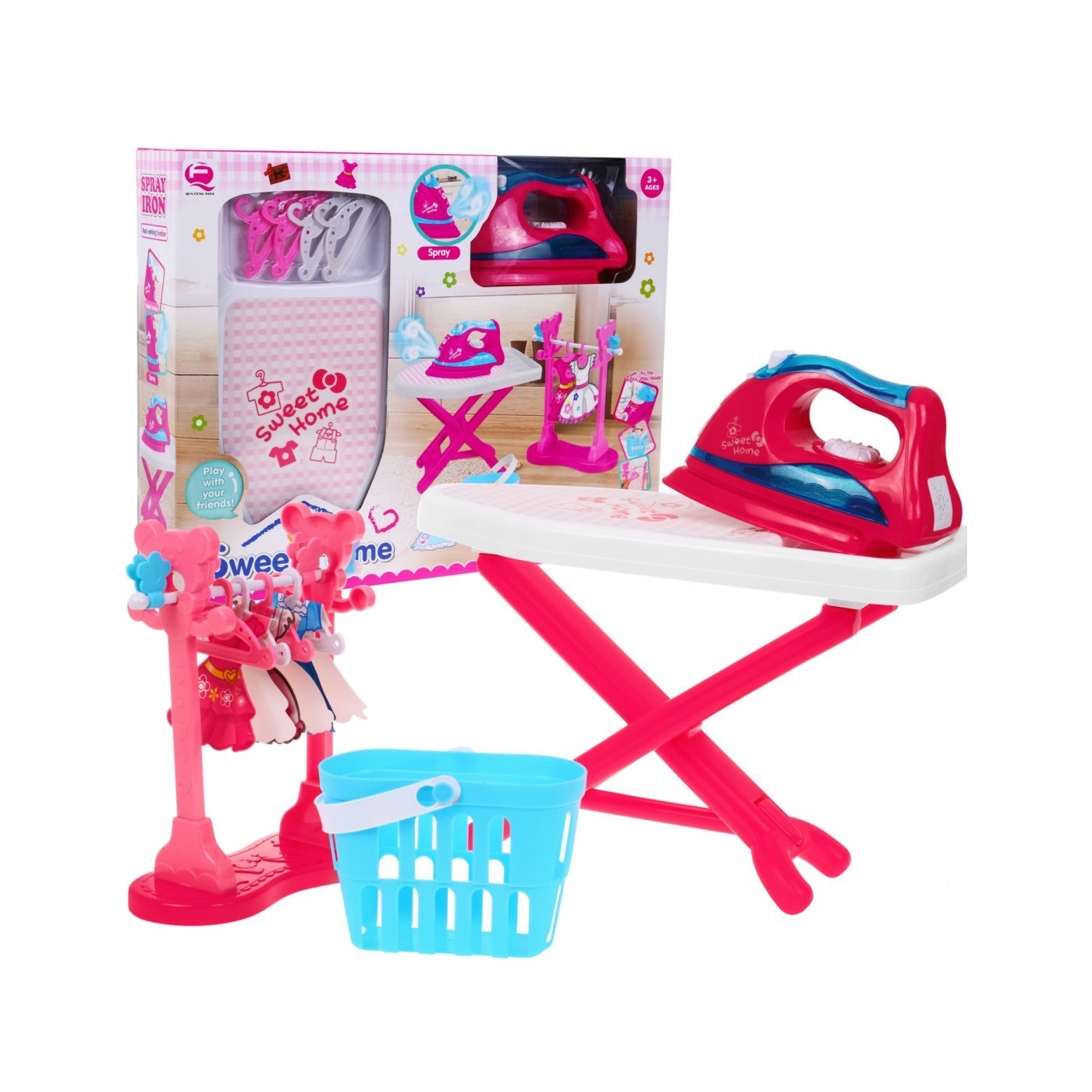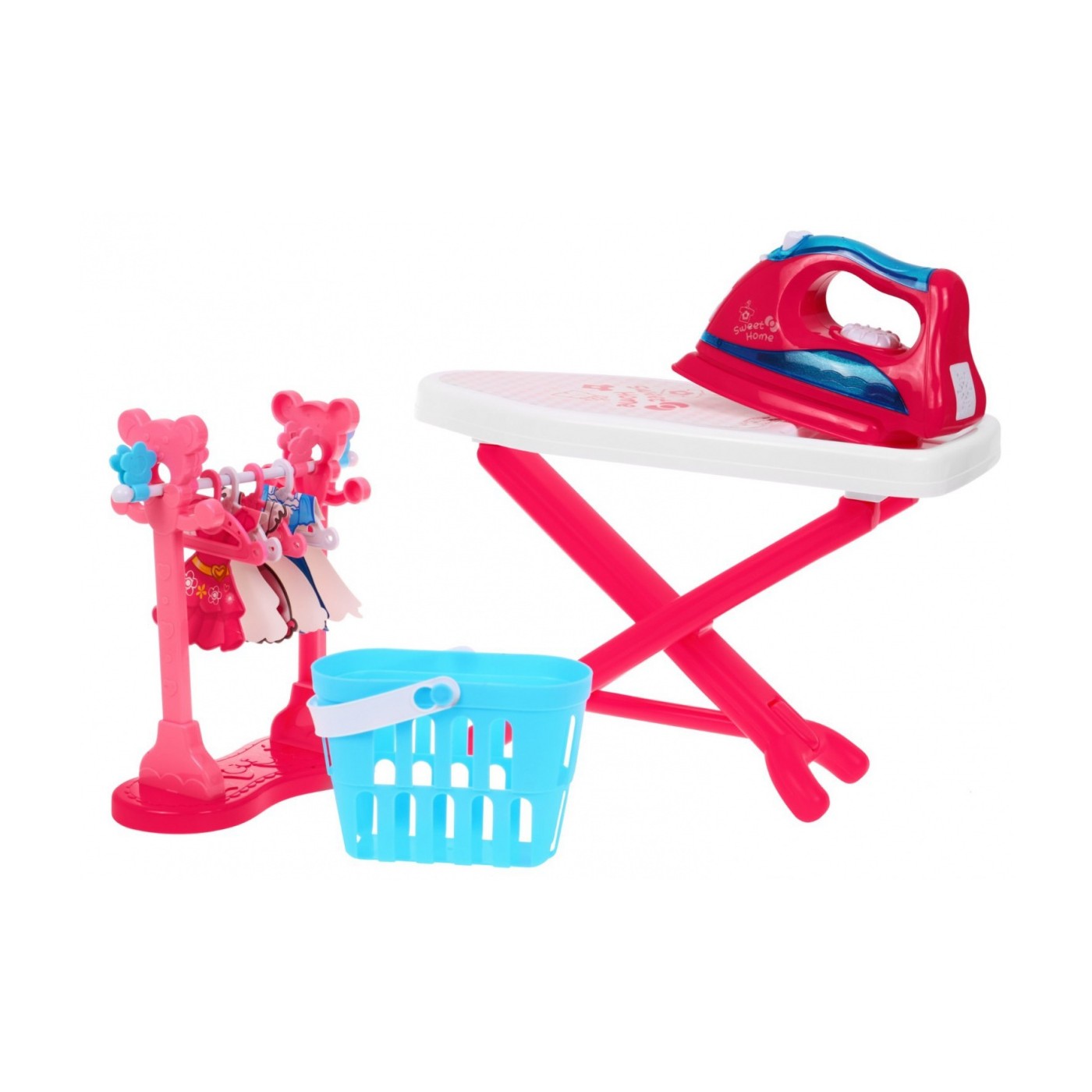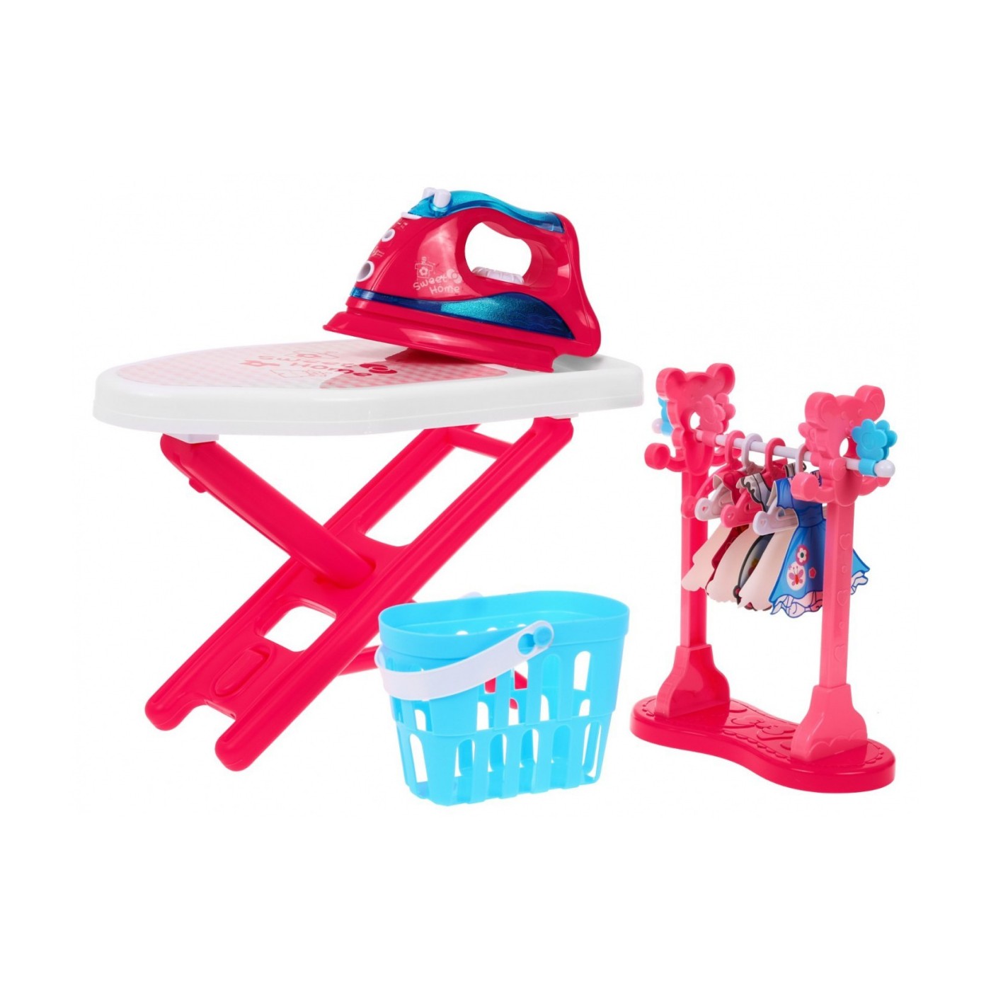 | - deska do prasowania, - żelazko, - stojak na ubrania, - 4 x wieszak, - 4 x klamerki do ubrań, - 3 x sukienka z kartonu do powieszenia na wieszaczku, - kosz na pranie, - pipeta do napełniania wodą żelazka. | |