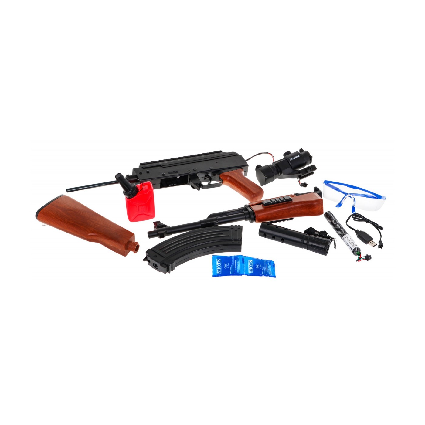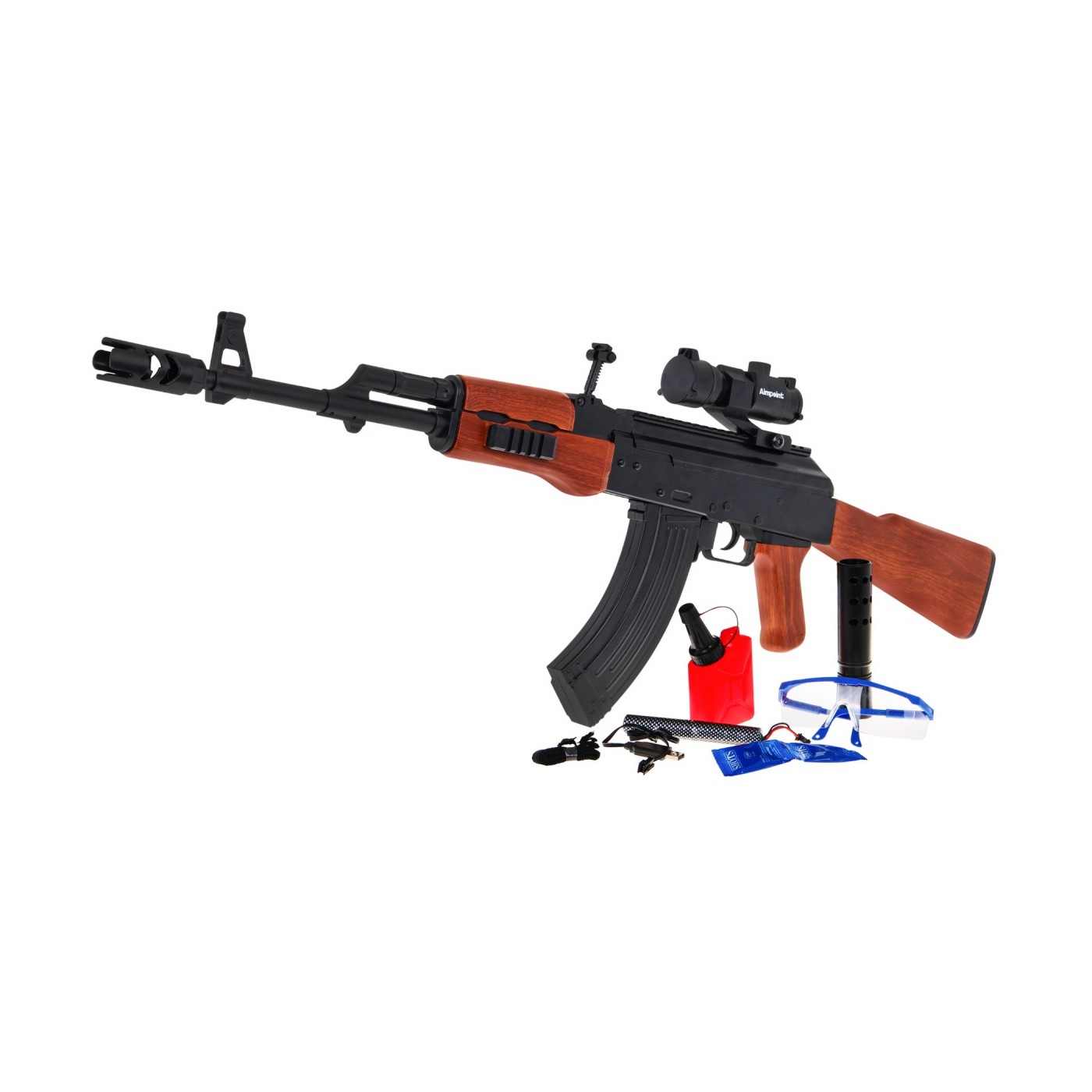 | | - pistolet, - magazynek, - tłumik, - nasadka, - USB kabel, - akumulator 7,4V, - 2000 nieprzygotowanych bomb wodnych, - smycz, - kanister, - okulary, - instrukcja. |