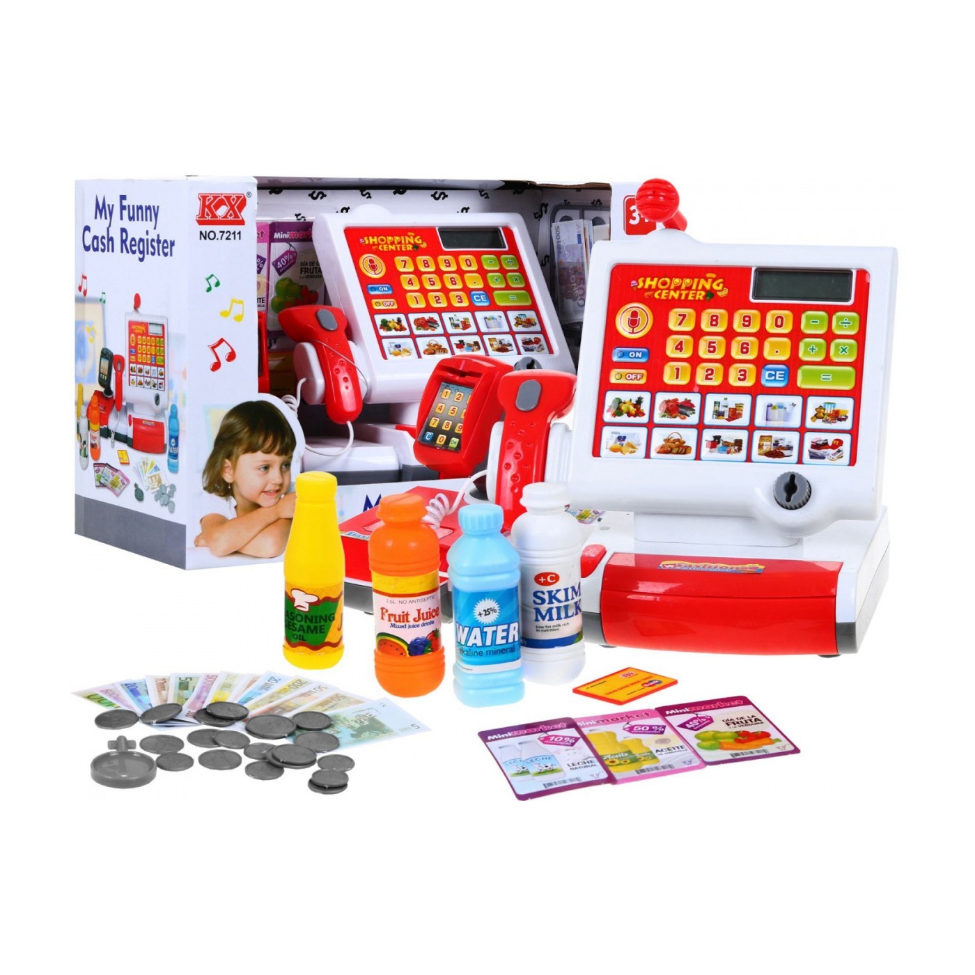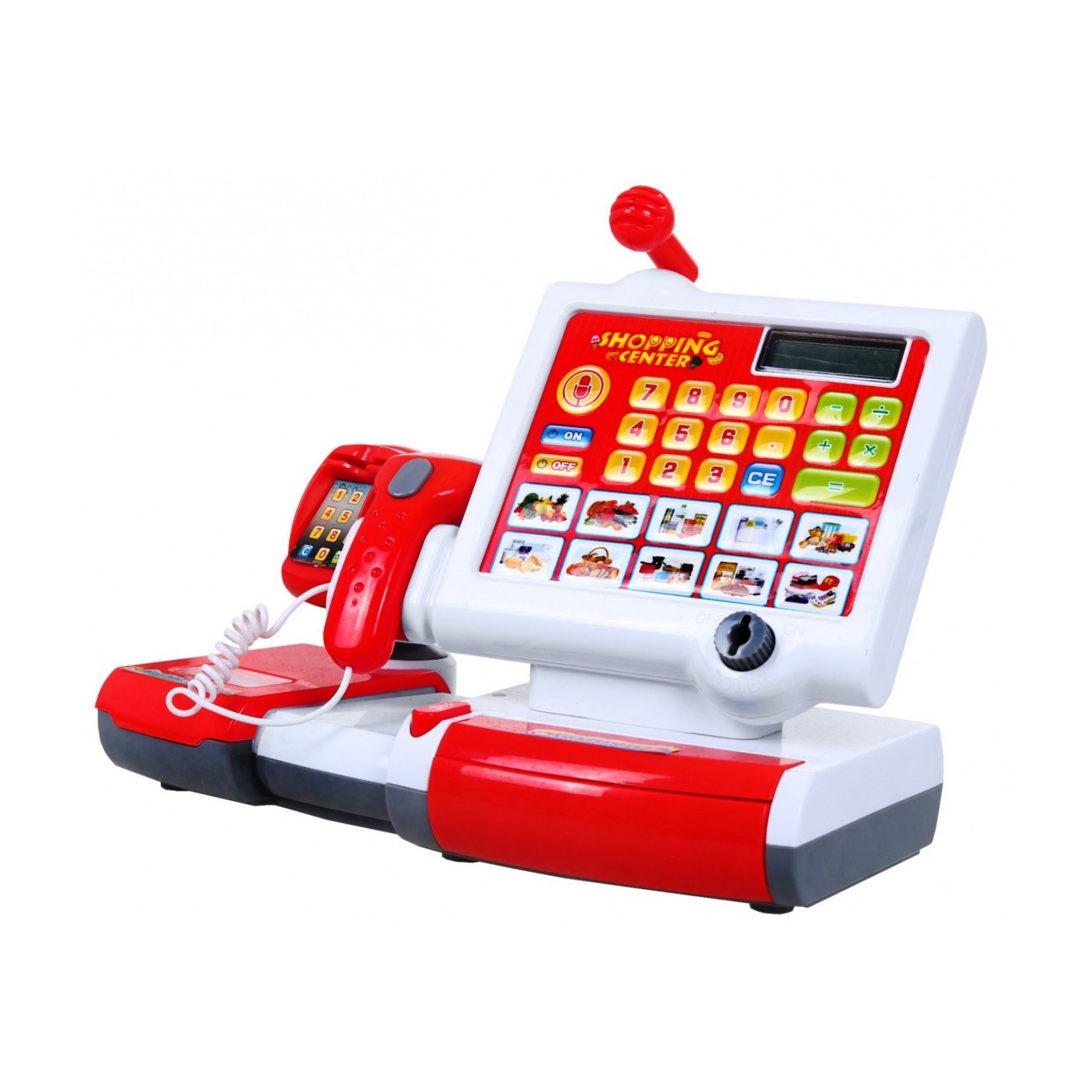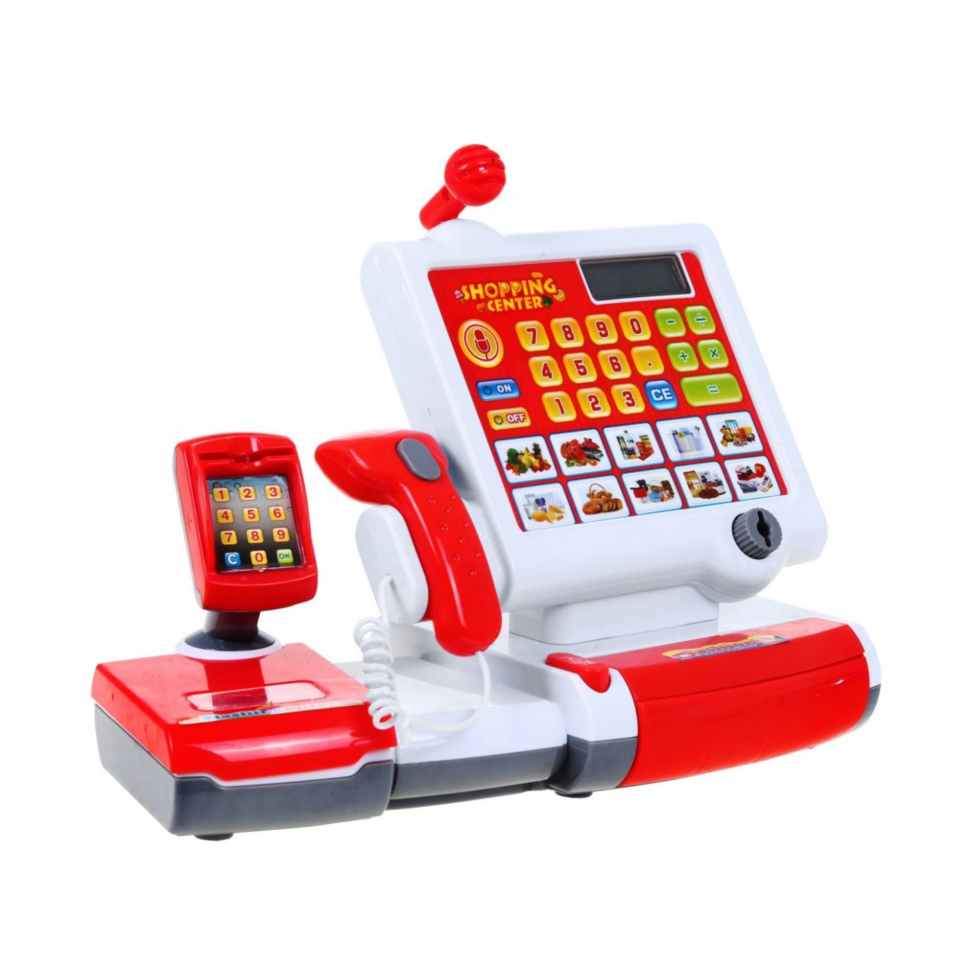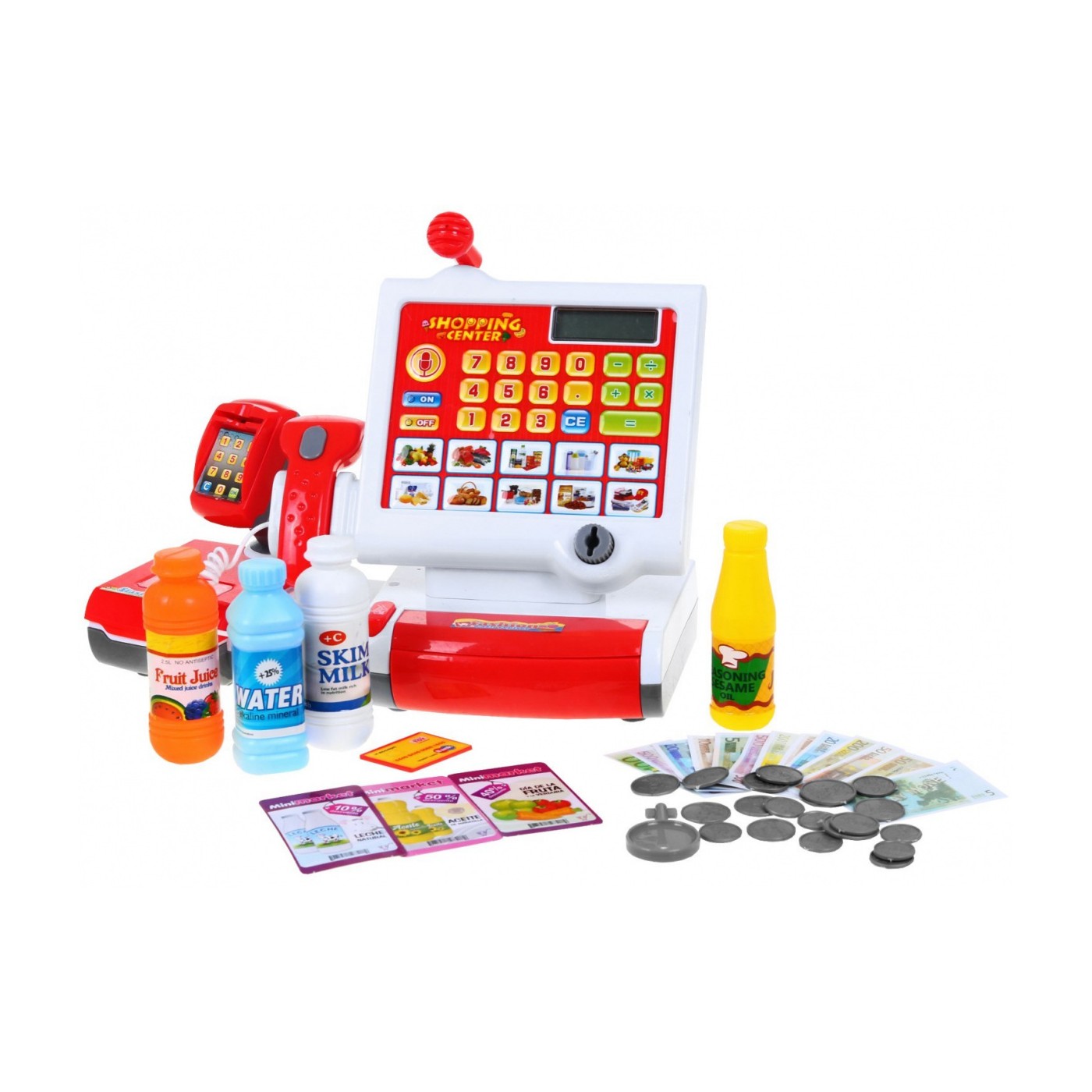 | - dotykowa kasa z wbudowanym dużym dźwiękowym kalkulatorem, - czytnik kodów kreskowych, - mikrofon, - automatycznie otwierana szufladka, - czytnik kart wraz z kartą kredytową, - zestaw 4 produktów spożywczych, - karty produktów, - komplet monet i banknotów. | |