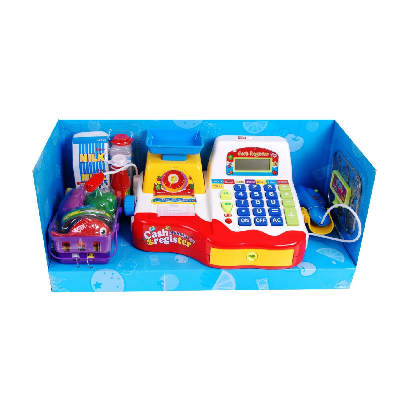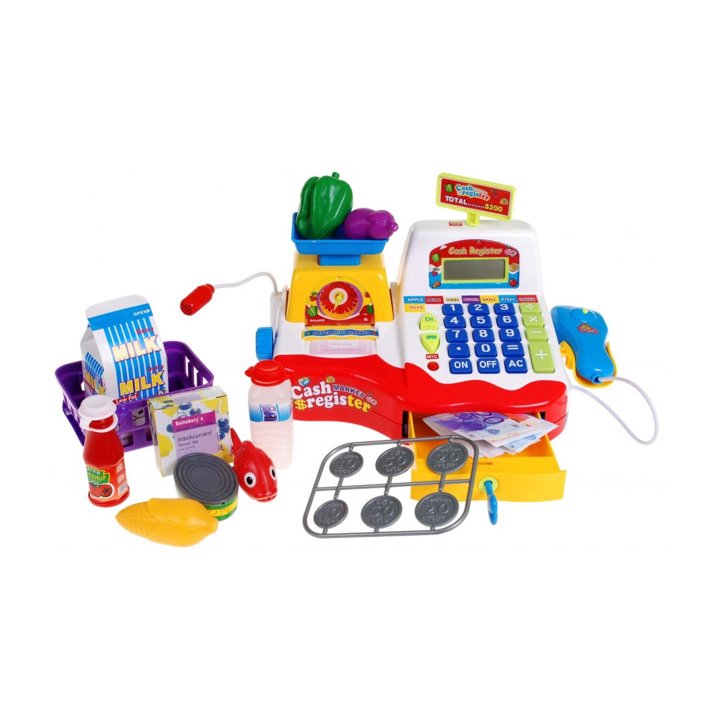 | - kasa, - czytnik kodów kreskowych (przy naciśnięciu guziczka wydaję dźwięk i zapala się czerwone światełko), - waga, - działający mikrofon, - wbudowany kalkulator, - wysuwany rachunek, - automatycznie otwierana szufladka dodatkowo zabezpieczana zamkiem na kluczyk, - zestaw 9 produktów spożywczych wraz z koszyczkiem, - komplet banknotów i monet. | |