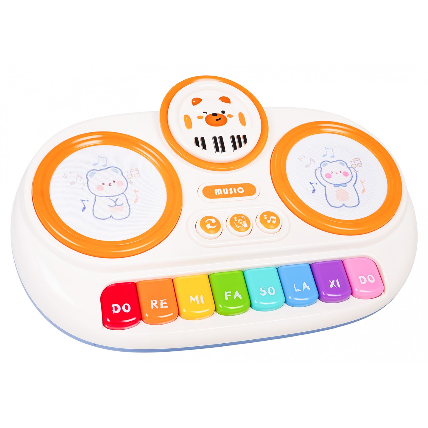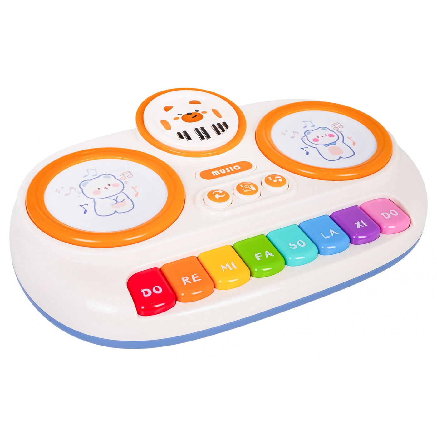Interaktívne piano citlivé na dotyk pre deti od dvanástich mesiacov. Vyrobené z odolných materiálov bezpečných pre deti, má žiarivé a pútavé farby, ktoré povzbudzujú k hre. Ponúka prepínateľný režim, 6 rôznych zvukov, 10 hravých melódií a DJ režim pre kreatívnu hru so zvukmi. Jemné bubny sa rozsvietia a umožňujú vám poklepkávať rytmus rukami. Farebné klávesy produkujú rôzne zvuky v závislosti od zvoleného režimu, od klasických zvukov až po zvuky zvierat alebo detský smiech. Táto sada piano a bicích uvedie vaše dieťa do sveta hudby a pomôže mu objaviť zvuky a rytmy. Hračka je napájaná 3 x AA 1,5V batériami (nie sú súčasťou balenia). Vlastnosti: - pre deti od dvanástich mesiacov veku, - vyrobené z materiálov bezpečných pre deti v živých farbách, - živé farby stimulujú zmysly, - zmeny režimov - 6 rôznych zvukov, - 10 veselých melódií, - DJ režim pre kreatívne prehrávanie zvuku, - bubny vyrobené z mäkkého materiálu majú podsvietenie, - farebné tlačidlá vydávajú rôzne zvuky v závislosti od zvoleného režimu. |