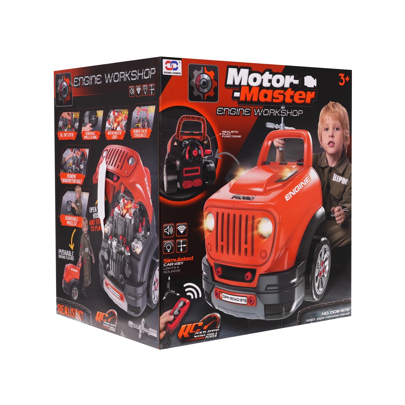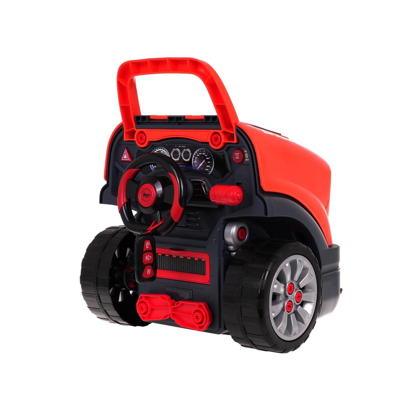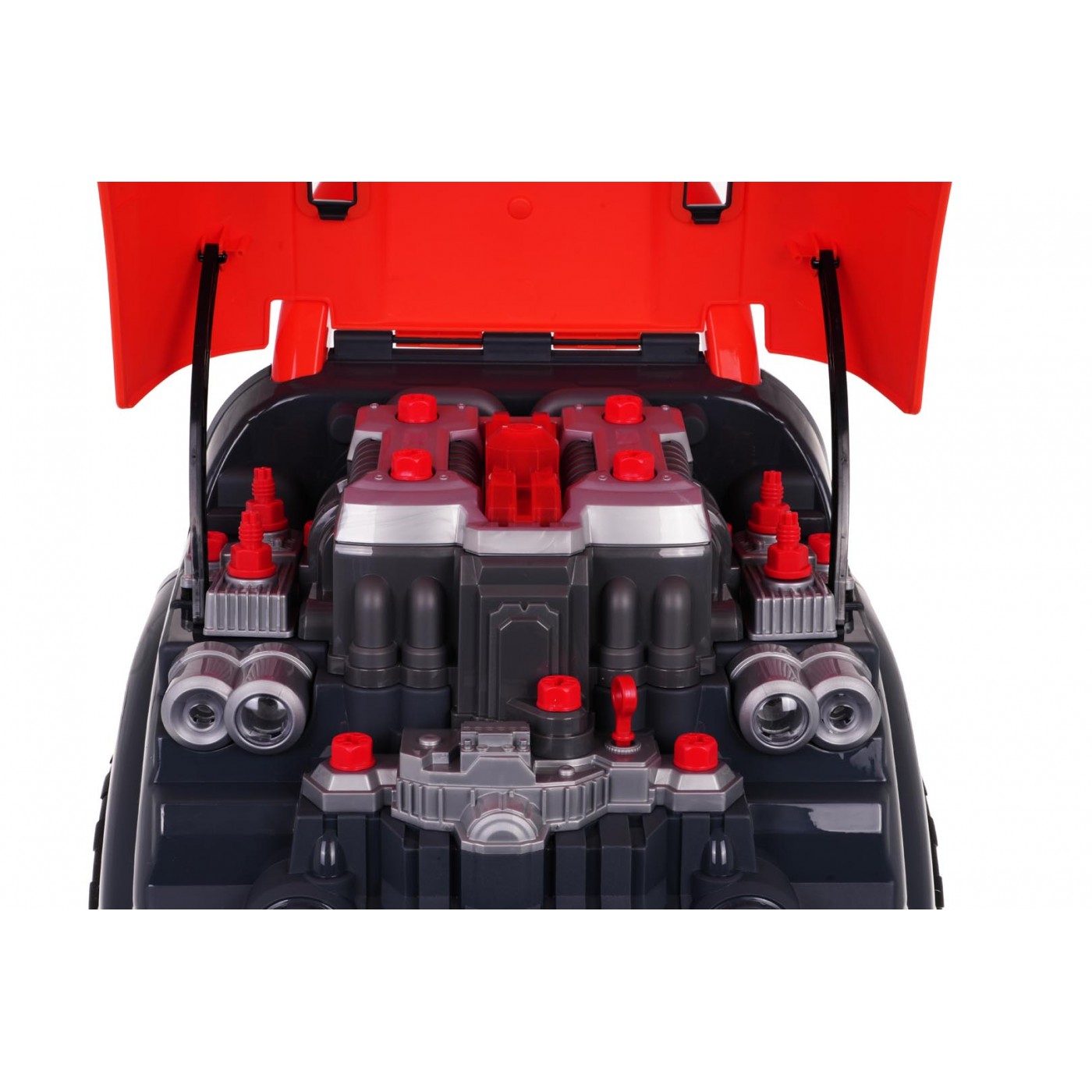 Interaktívna hračka, predná časť nákladného auta so zdvíhacou kapotou a prístrojovou doskou, určená pre deti od 3 rokov. Sada obsahuje komponenty nákladného auta a nástroje potrebné na montáž a demontáž dielov, ako je skrutkovač alebo kľúče. Pod kapotou vozíka sa nachádza veľký odskrutkovateľný motor, ktorý môže dieťa rozobrať. Vymeniteľné sú aj zapaľovacie sviečky a kolesá. Prístrojová doska má tlačidlo štartovania vozidla so zvukmi štartovania motora, pohyblivý volant s klaksónom a núdzovým signálom. Pod volantom sa nachádza odkladacia priehradka, do ktorej môžete vložiť všetko potrebné náradie, skrutky a gombíky. Auto je vybavené automatickou prevodovkou - má radiacu páku ako v skutočnom vozidle. V závislosti od preradenia radiacej páky na príslušný prevodový stupeň budeme počuť zvuk napríklad štartovania vozidla, zvuk jazdy alebo pri spiatočke zvuk cúvania. Sada obsahuje diaľkové ovládanie v tvare autokľúčov, ktoré umožňuje ovládať svetelné moduly (žiariace svetlomety a horná časť motora) a zvukové moduly (zvuk otvárania a zatvárania auta, klaksón). Hračka má pohodlnú rukoväť na prenášanie. Napájanie 3 x AA 1,5 V batérie - auto (nie sú súčasťou balenia), CR2025 3V - diaľkové ovládanie (súčasťou balenia). Hračka pre malého mechanika rozvíja manuálne zručnosti, jemnú motoriku a koordináciu oko-ruka.