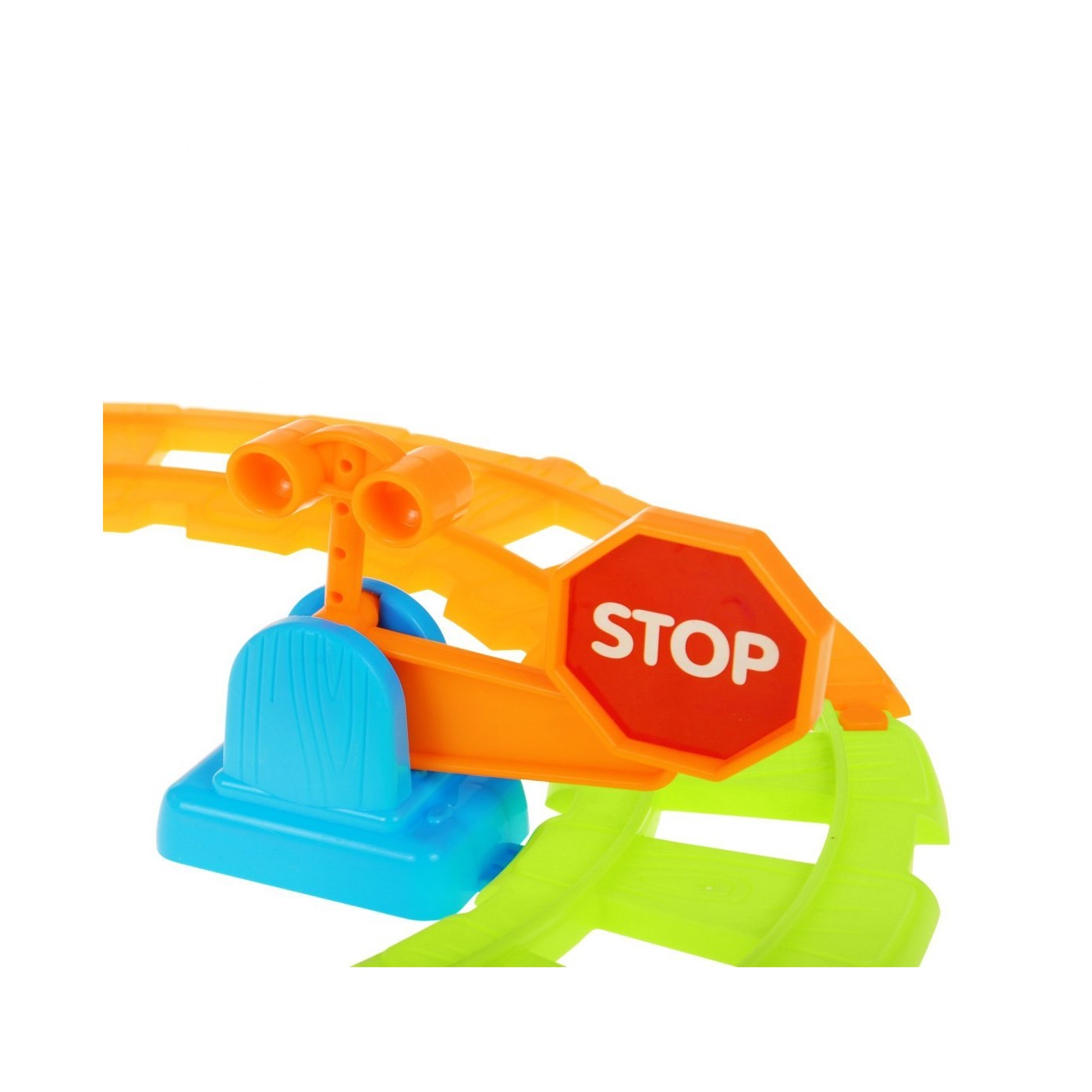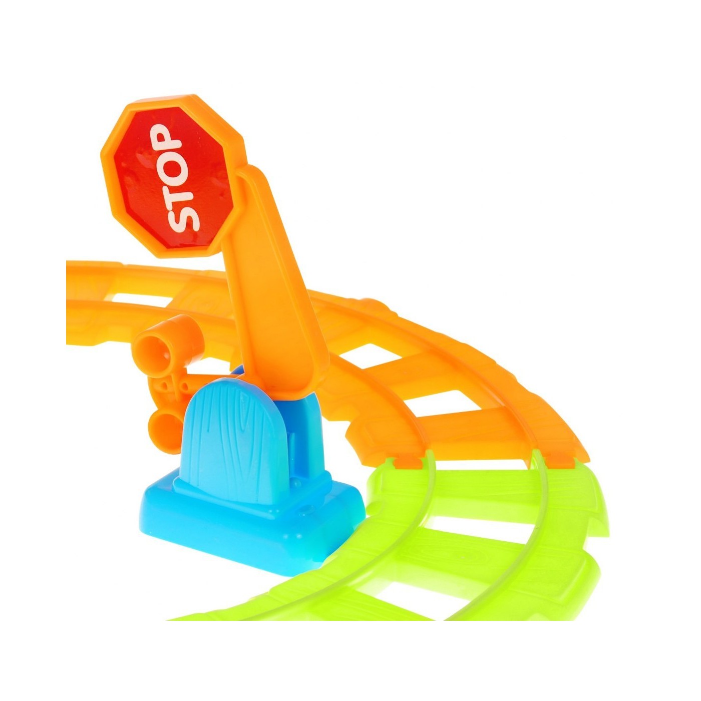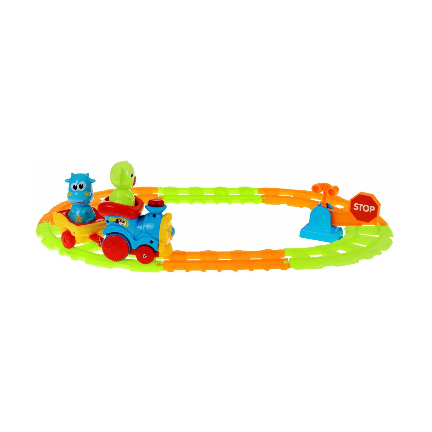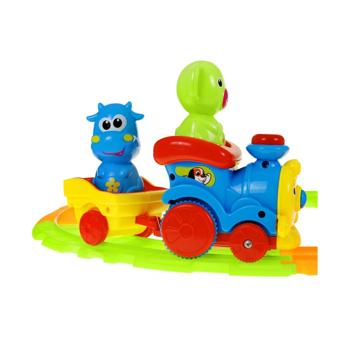 | | - ciuchcia, - wagonik, - ruchomy szlaban, - 6 sztuk kolorowych torów, - 2 postacie zwierzątek (słonik i krówka). |