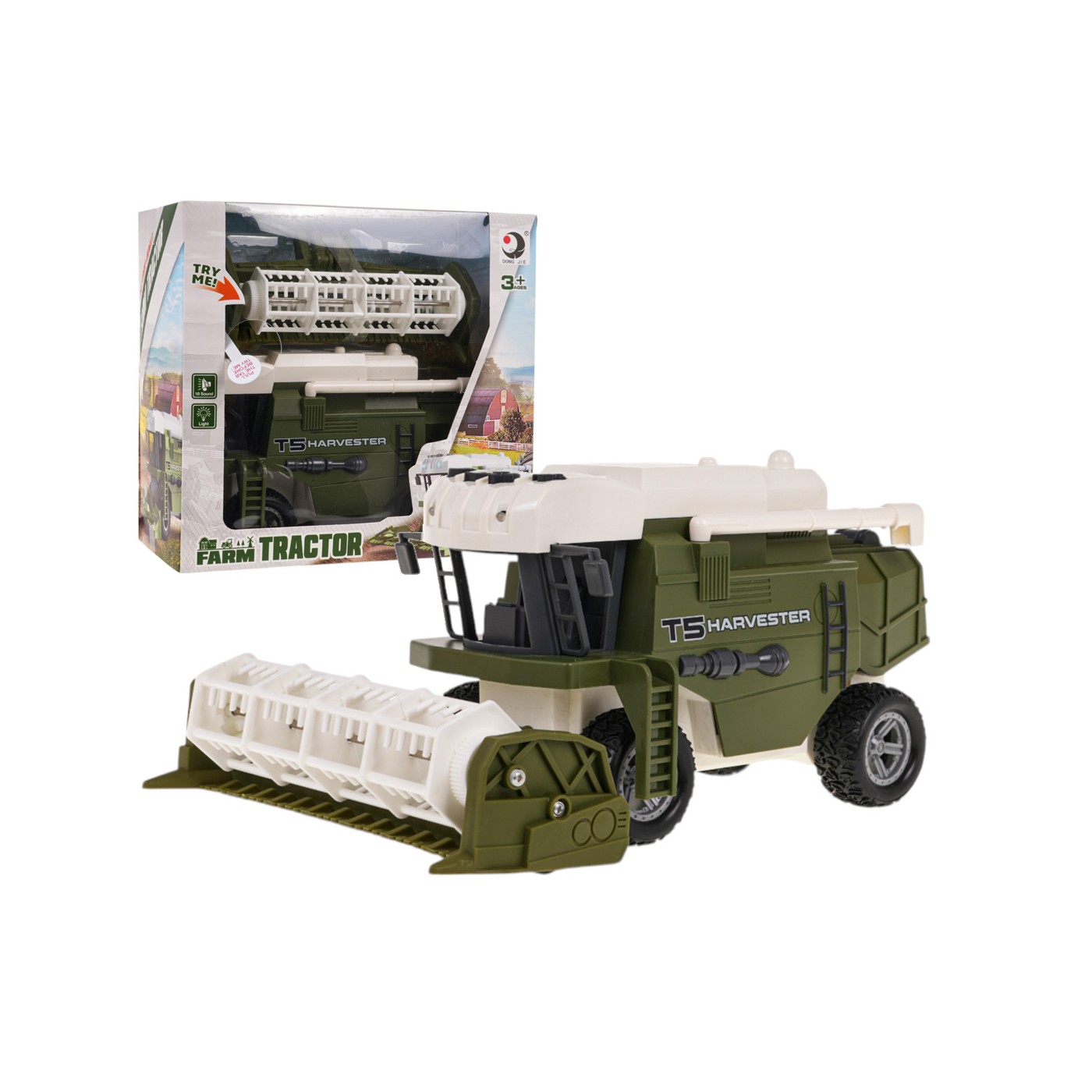 Interaktívny kombajn s pohonom a zvukovými a svetelnými funkciami pre deti od 3 rokov. Hračka má na streche štyri zvukové tlačidlá, po stlačení vydáva zvuky zapaľovania, chodu motora, zvieracie zvuky a klaksón. Kombajn je vyrobený z najkvalitnejších materiálov a má veľké gumené kolesá s pohonom. Svetlá v prednej, hornej časti vozidla svietia. Hračka je napájaná 3 x AG13 batériami (sú súčasťou balenia).
