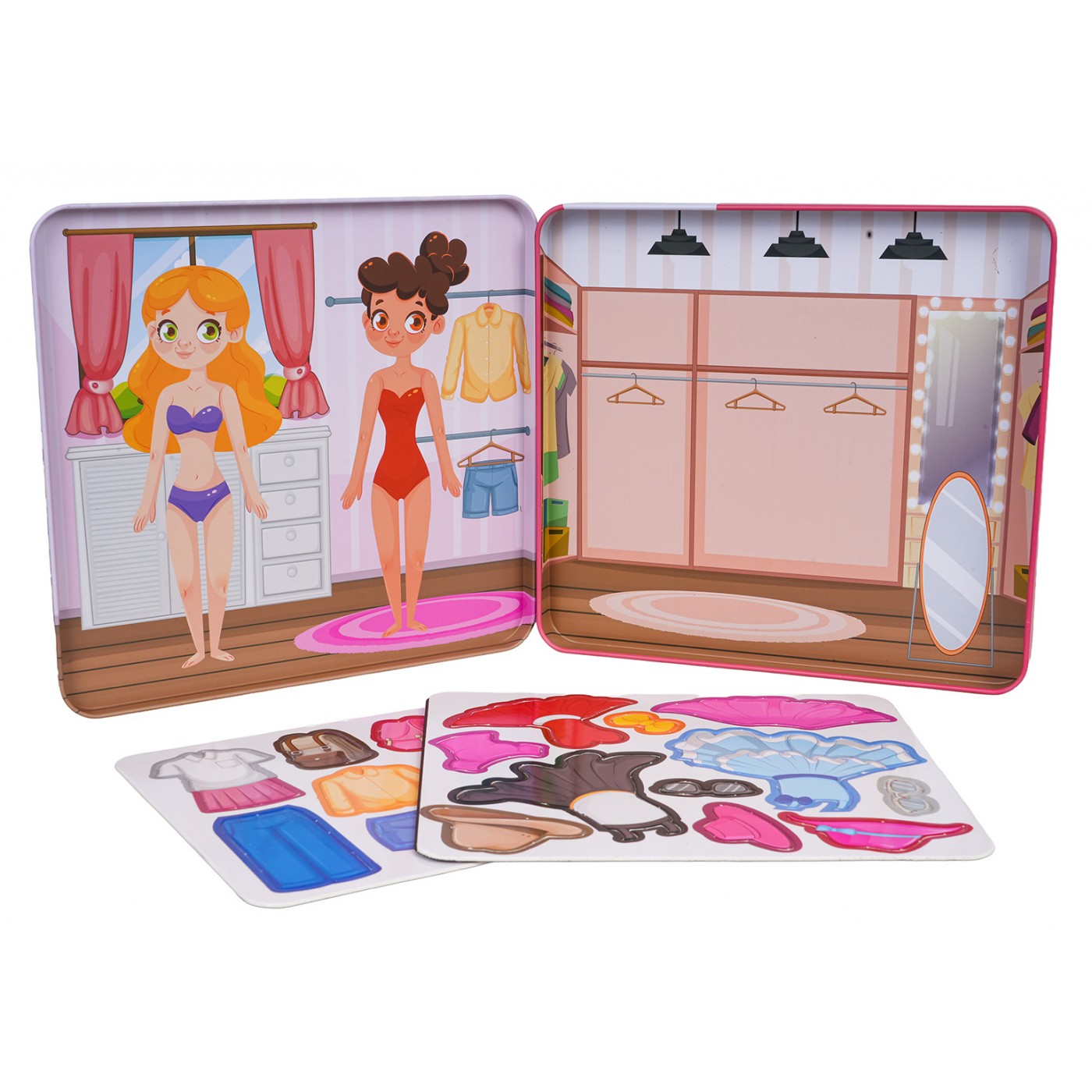 - kovová, farebná krabica s kresbami dvoch modelov na vnútornej strane veka a skriňou vo vnútri krabice, - 25 kusov šatníka |
