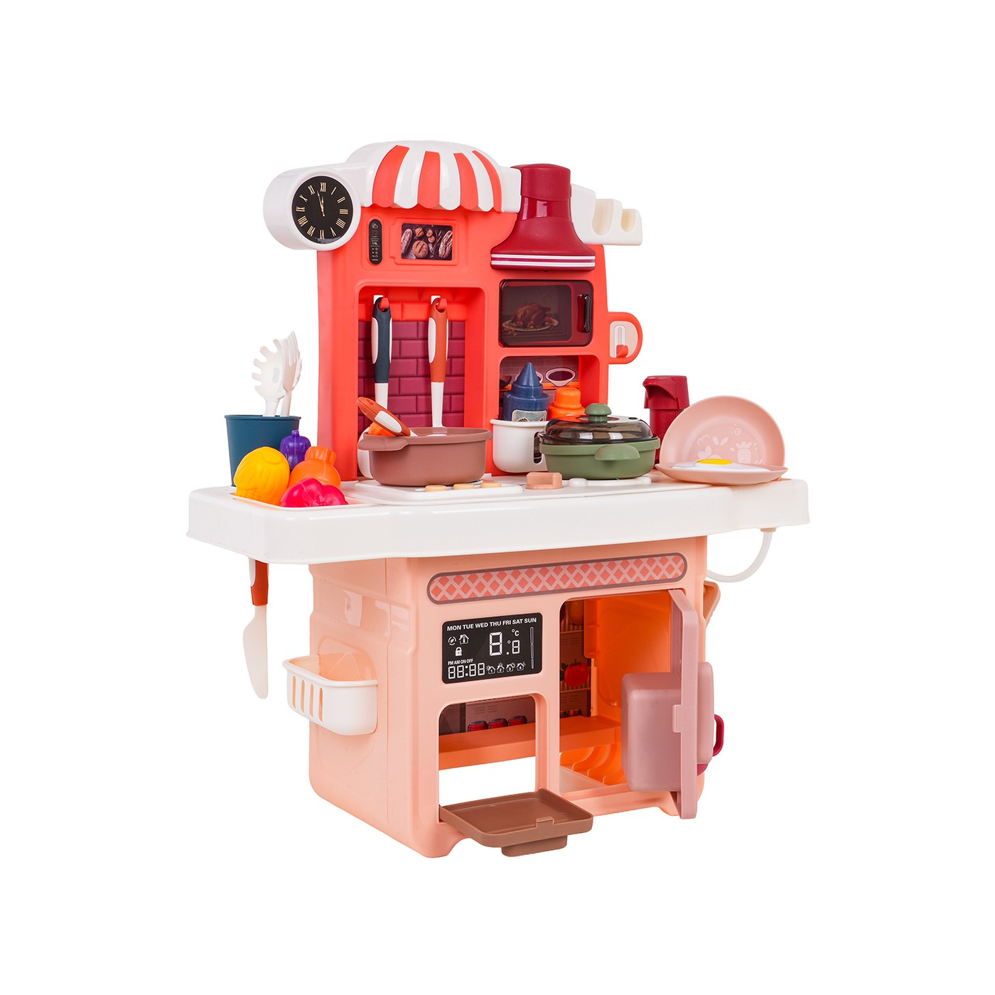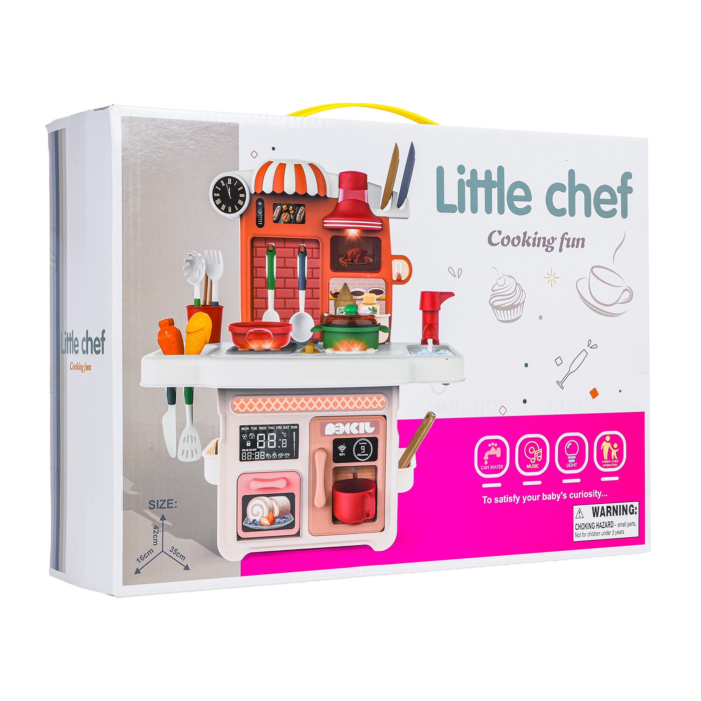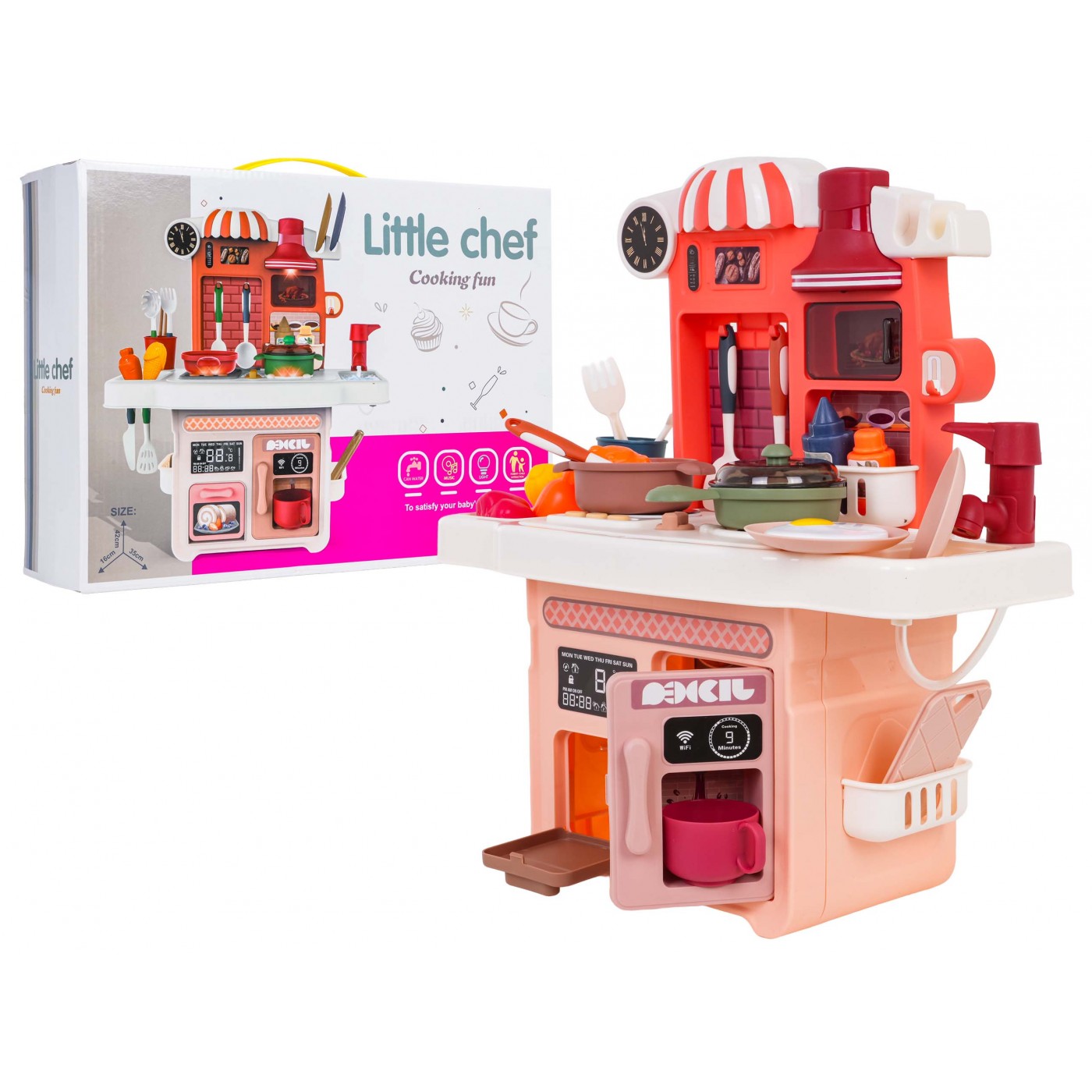 Interaktívna kuchynka so svetlami, zvukmi, výtokom vody a množstvom príslušenstva, vhodná pre deti od troch rokov. Kuchynka je nádherne vyrobená z vysoko kvalitného plastu a vyznačuje sa žiarivými farbami, ktoré povzbudzujú k hre. Kuchynská doska je vybavená interaktívnou varnou doskou s horákmi. Otočením gombíka sa spúšťajú zvuky varenia a vyprážania. Zvuky varenia a vyprážania sú sprevádzané podsvietením. Stlačením jedného z troch tlačidiel sa prehrávajú rôzne pesničky, riekanky a bezpečnostné tipy. Voda skutočne tečie z kohútika (pomocou čerpadla), rovnako ako v skutočnom dreze, čo deťom umožňuje umývať hračkársky riad. Sada obsahuje aj simulovaný kávovar a rúru, ako aj osvetlený digestor. Celá sada vyzerá fantasticky. Hračka je napájaná 3 x AA 1,5V batériami pre varnú dosku (batérie nie sú súčasťou balenia) a 3 x AG13 batériami pre digestor (batérie sú súčasťou balenia).