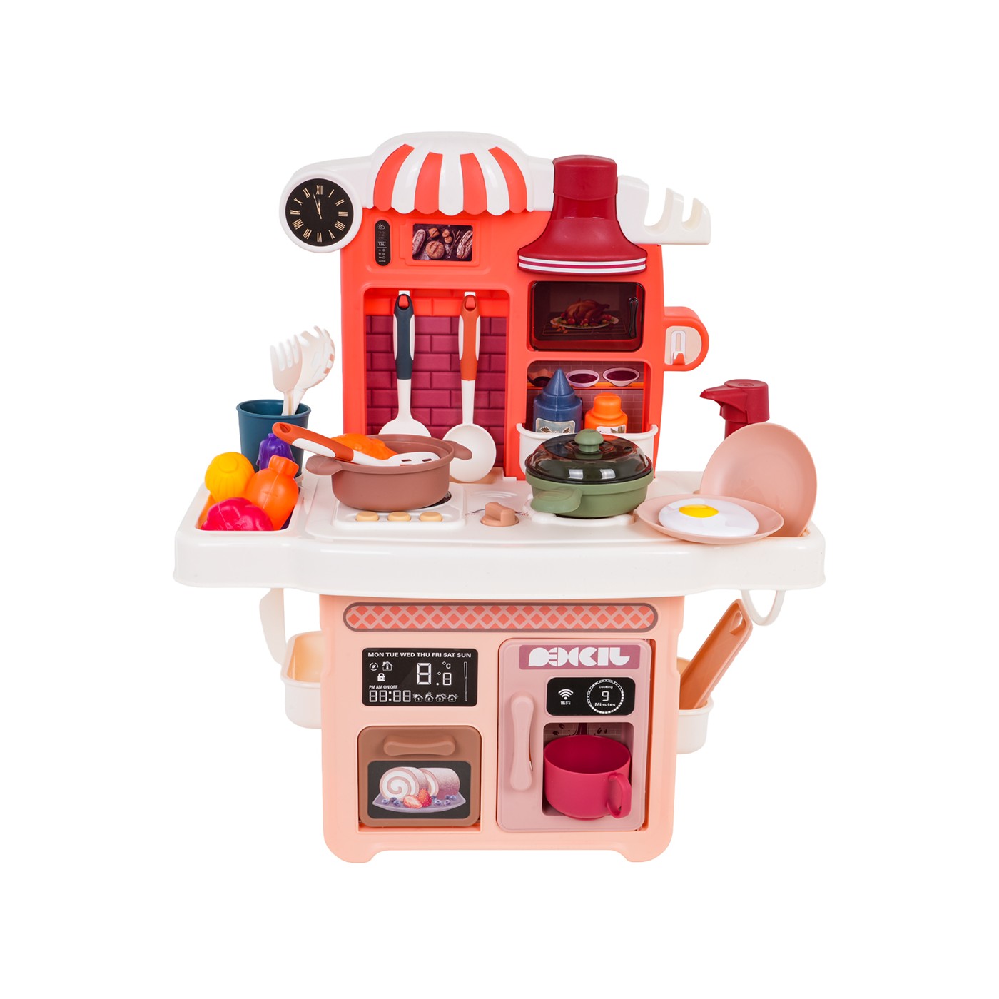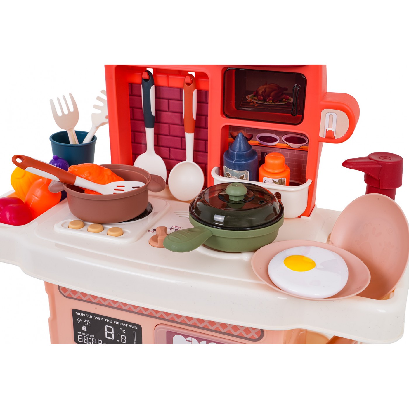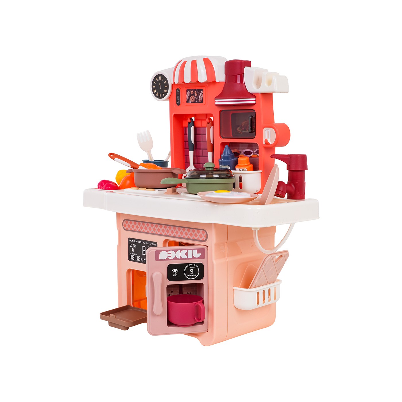 Interaktívna kuchynka so svetlami, zvukmi, výtokom vody a množstvom príslušenstva, vhodná pre deti od troch rokov. Kuchynka je nádherne vyrobená z vysoko kvalitného plastu a vyznačuje sa žiarivými farbami, ktoré povzbudzujú k hre. Kuchynská doska je vybavená interaktívnou varnou doskou s horákmi. Otočením gombíka sa spúšťajú zvuky varenia a vyprážania. Zvuky varenia a vyprážania sú sprevádzané podsvietením. Stlačením jedného z troch tlačidiel sa prehrávajú rôzne pesničky, riekanky a bezpečnostné tipy. Voda skutočne tečie z kohútika (pomocou čerpadla), rovnako ako v skutočnom dreze, čo deťom umožňuje umývať hračkársky riad. Sada obsahuje aj simulovaný kávovar a rúru, ako aj osvetlený digestor. Celá sada vyzerá fantasticky. Hračka je napájaná 3 x AA 1,5V batériami pre varnú dosku (batérie nie sú súčasťou balenia) a 3 x AG13 batériami pre digestor (batérie sú súčasťou balenia).