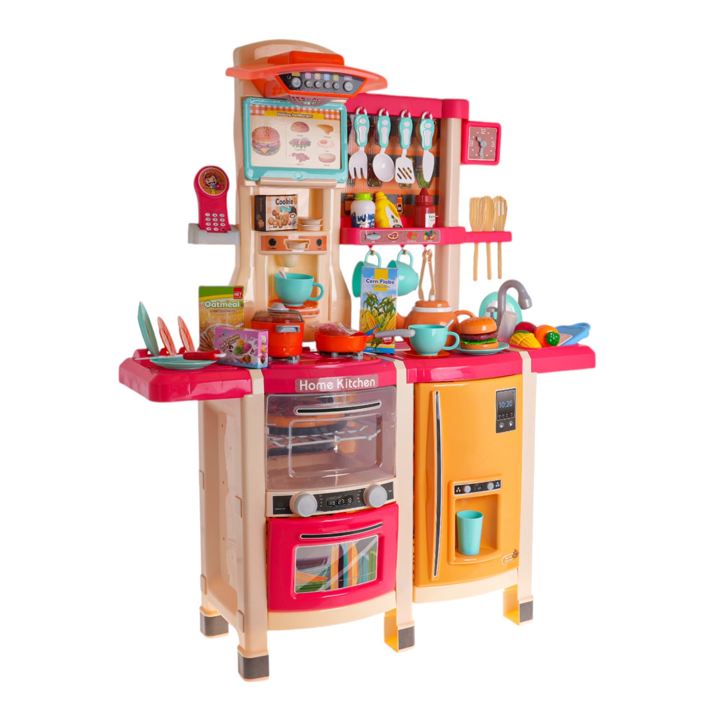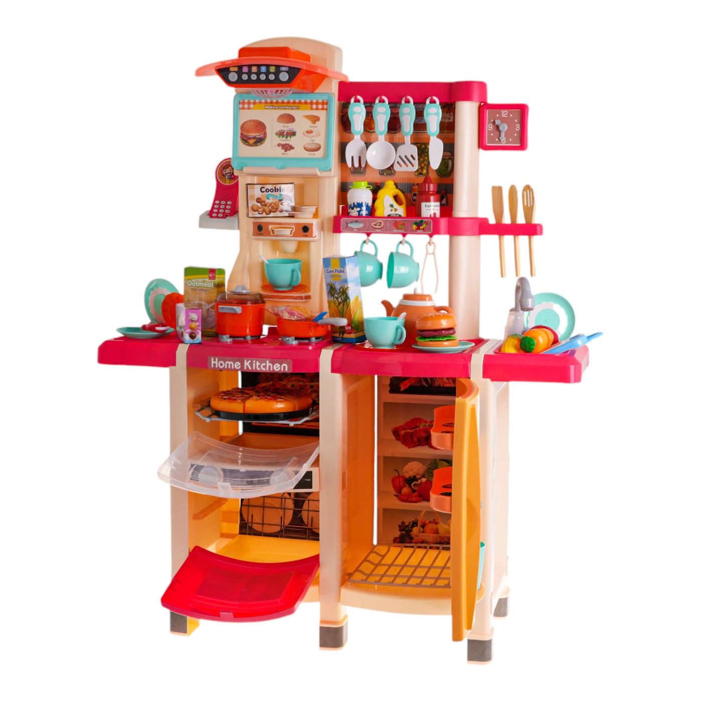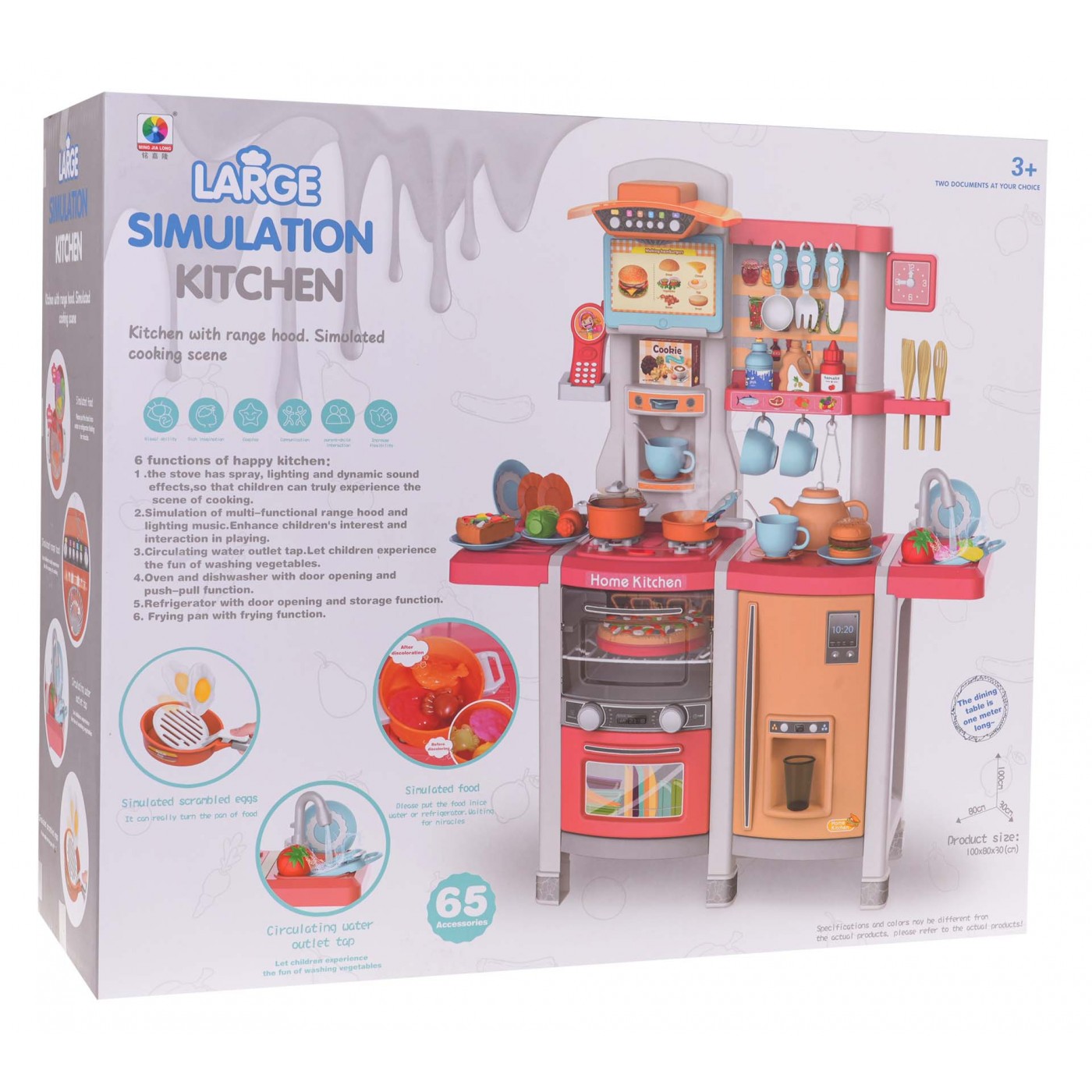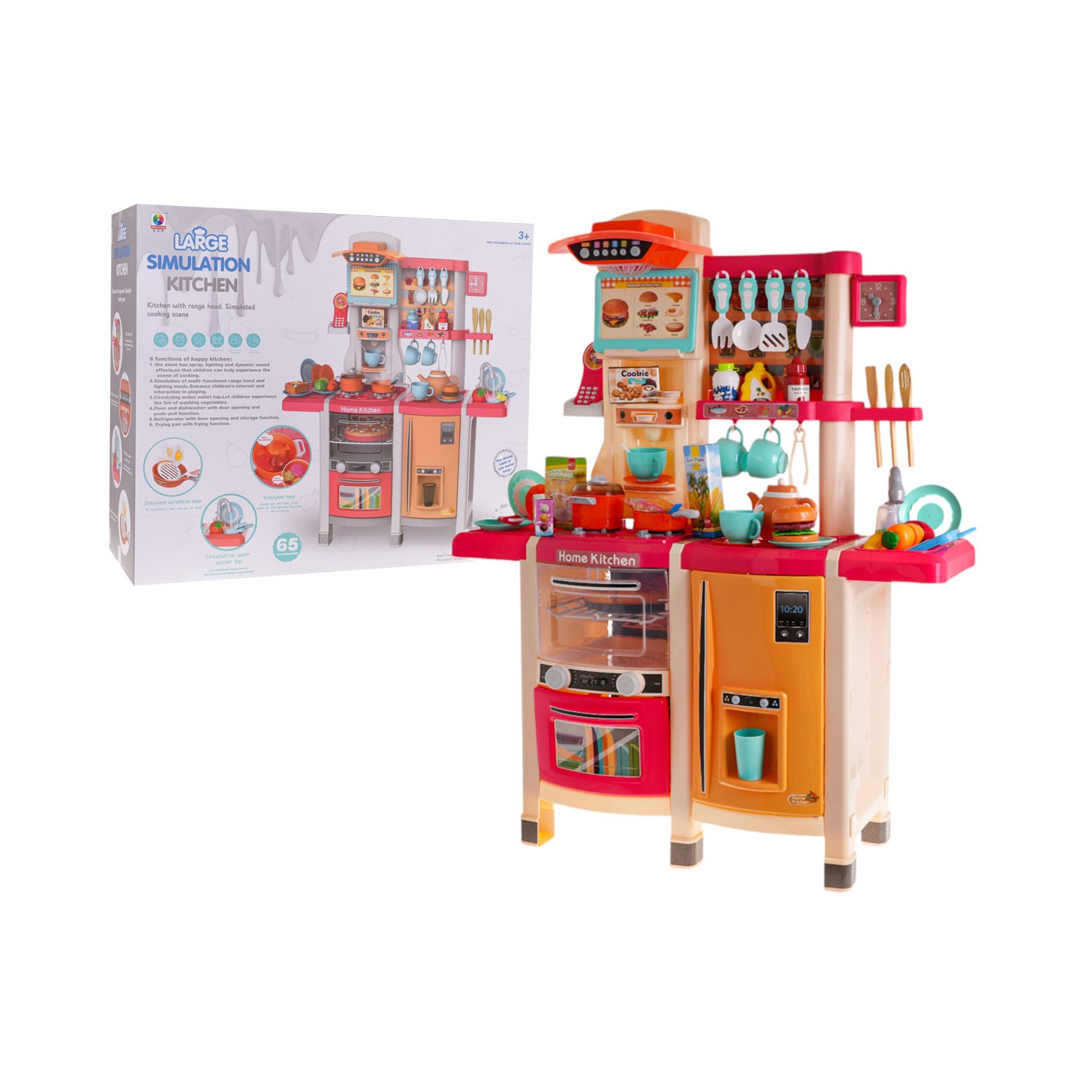 - vhodné pre deti od 3 rokov, - vyrobené z najkvalitnejšieho plastu v živých farbách, - bohato vybavená, sada sa skladá až zo 65 prvkov, - pohyblivé gombíky, - horáky s podsvietením, - zvuky vyprážania a varenia, - kohútik s tečúcou vodou, - otváracia chladnička s falošným dávkovačom vody, - otváranie rúry zvukom a svetlom, - otváracia umývačka riadu, - vstavaný kávovar, - panel s ventilátorom, svetlami a zvukmi, - telefón so zvukmi (zvončeky, zvuky zvierat, pieseň) a osvetlenou anténou, - rám na kartičky s receptami, - hodiny s pohyblivými ručičkami, - 3 produkty (ryba, rak, kus mäsa) po vložení do tlakového hrnca zmenia farbu. |