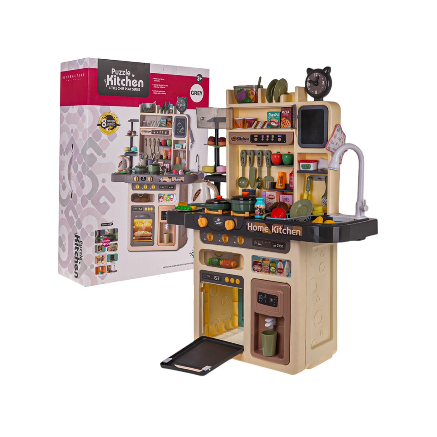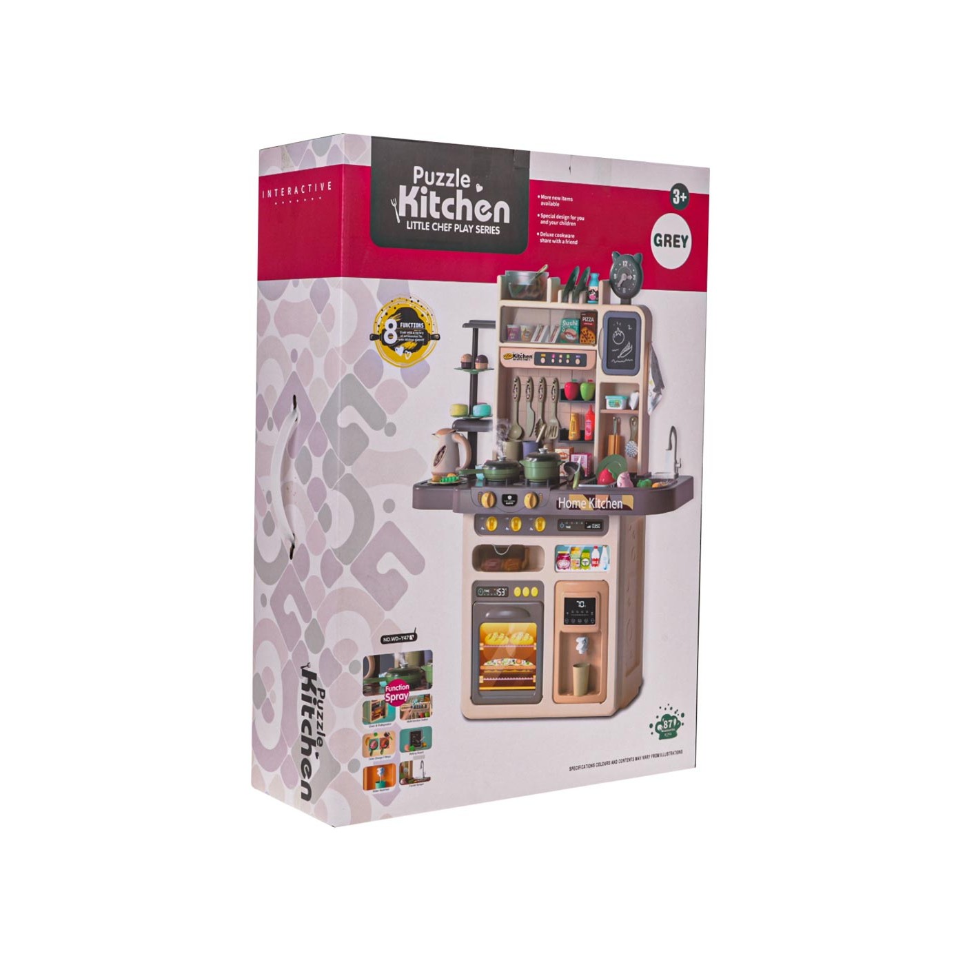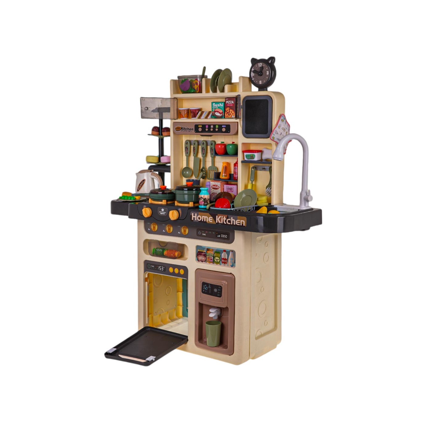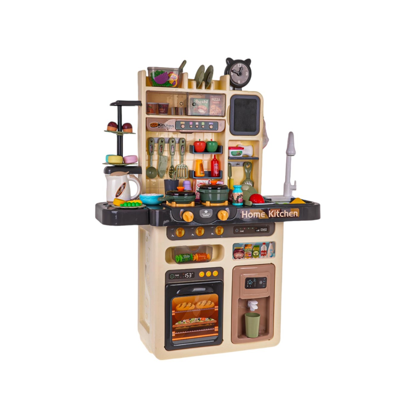 Fantastická, dobre vybavená, veľká multifunkčná kuchynka pre deti od 3 rokov. V kuchyni je drez s kohútikom, z ktorého tečie voda, osvetlené horáky so zvukmi varenia a vyprážania, jeden z horákov má funkciu tvorby pary, pohyblivé gombíky, digestor s lampou a hudobným panelom, otváracia rúra , chladnička s dávkovačom vody, hodiny a police a množstvo kuchynských doplnkov. Súprava je napájaná 7 x AA 1,5 V batériami (nie sú súčasťou balenia).