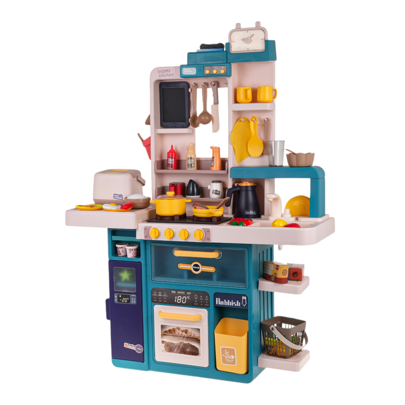Interaktívna kuchynka so svetelnými, parnými, zvukovými funkciami a kohútikom, z ktorého vyteká voda, ako aj množstvom doplnkov pre deti od 3 rokov. Kuchynka je vyrobená z najkvalitnejšieho plastu a je dodávaná v živých farbách, ktoré povzbudzujú vaše dieťa k hre. Na kuchynskej linke je interaktívna varná doska s horákmi. Keď otočíte jedným gombíkom, budete počuť zvuky varenia a druhého zvuky vyprážania. Zvuky varenia a vyprážania sú sprevádzané osvetlením horákov. Okrem toho z panvice alebo hrnca vychádza para. Voda v skutočnosti tečie z kohútika, rovnako ako v skutočnom dreze, takže dieťa bude môcť umývať riad s hračkami. Súčasťou sady je aj kriedová tabuľa, na ktorú si môžete pripraviť napríklad recept alebo nákupný zoznam. Sada obsahuje aj maketu chladničky s otváracími dvierkami, otváraciu rúru a množstvo políc, na ktoré môžeme umiestniť makety produktov. V hornej časti kuchynskej súpravy je hudobný panel s tlačidlami, ktoré aktivujú rôzne melódie a zvuky vydávané digestorom. Súčasťou sady je aj nádoba na varenie ryže, z ktorej vychádza bezpečná para a môžete počuť rôzne zvuky varenia. Celý set vyzerá skvele. Celý set je napájaný 9 x AA 1,5 V batériami (nie sú súčasťou balenia).