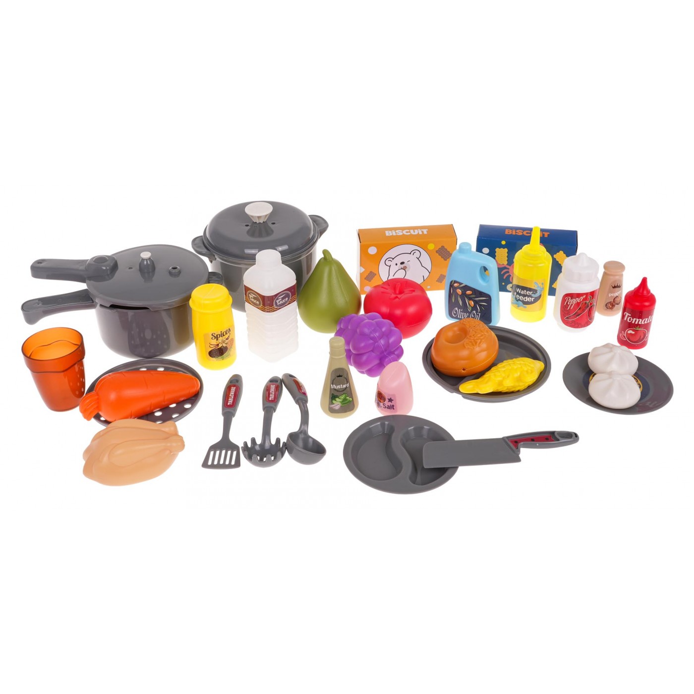 - kuchyňa, - tlakový hrniec, - hrniec s pokrievkou, - 3 plechy na pečenie, - tanier, - 2 x krabica na sušienky, - pohár, - lopata na mäso, - lyžica na cestoviny, - naberačka, - veľký nôž, - soľnička, - korenie, - kečup, - horčica, - nádoba na olej, - 2 nádoby s korením, - nádoba s rybacou omáčkou, - fľašu s vodou, - falošné potravinárske výrobky: paradajka, mrkva, kuracie mäso, ryba, hruška, hrozno, 2 x pusinka, koláč, - dekoratívne nálepky. |