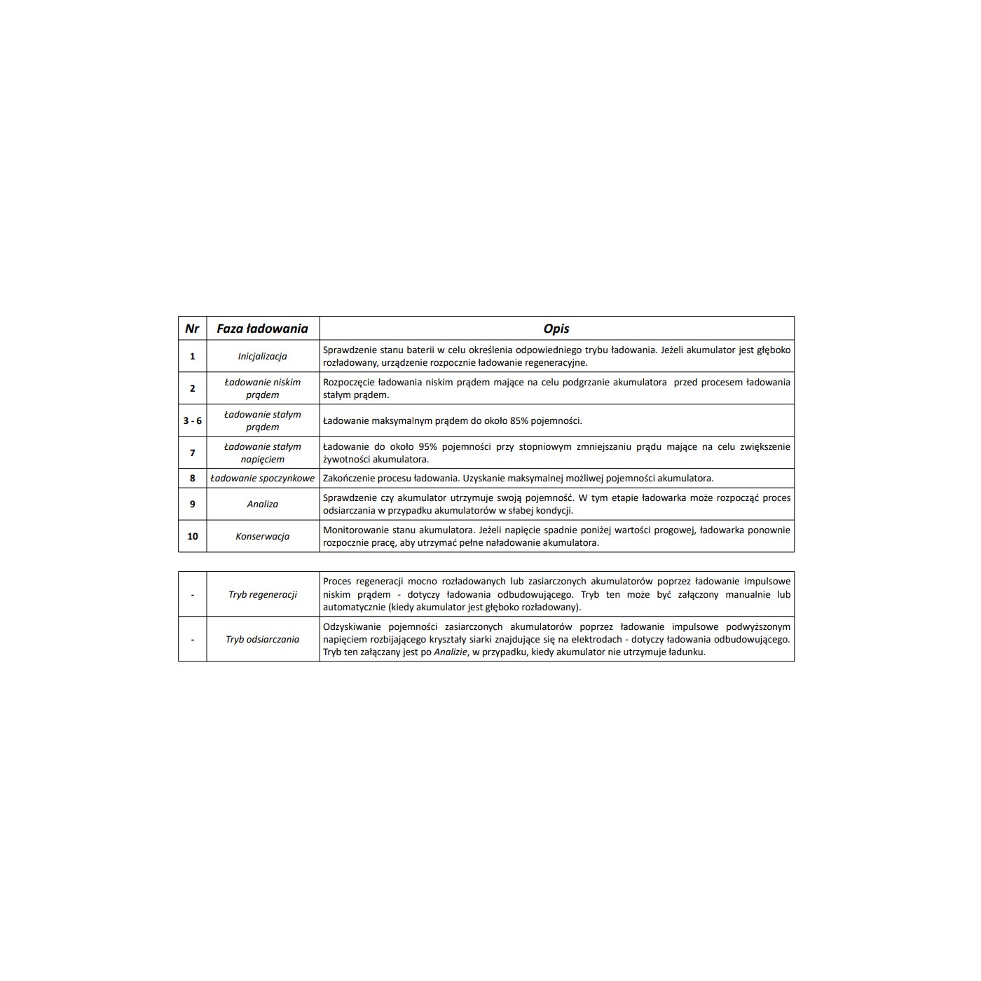 | Zabezpieczenia | Nadnapięciowe >16VDC (tryb 12V), >32V (tryb 24V), odłączenie napięcia wyjściowego Zwarciowe Odłączenie napięcia wyjściowego, informacja na wyświetlaczu |