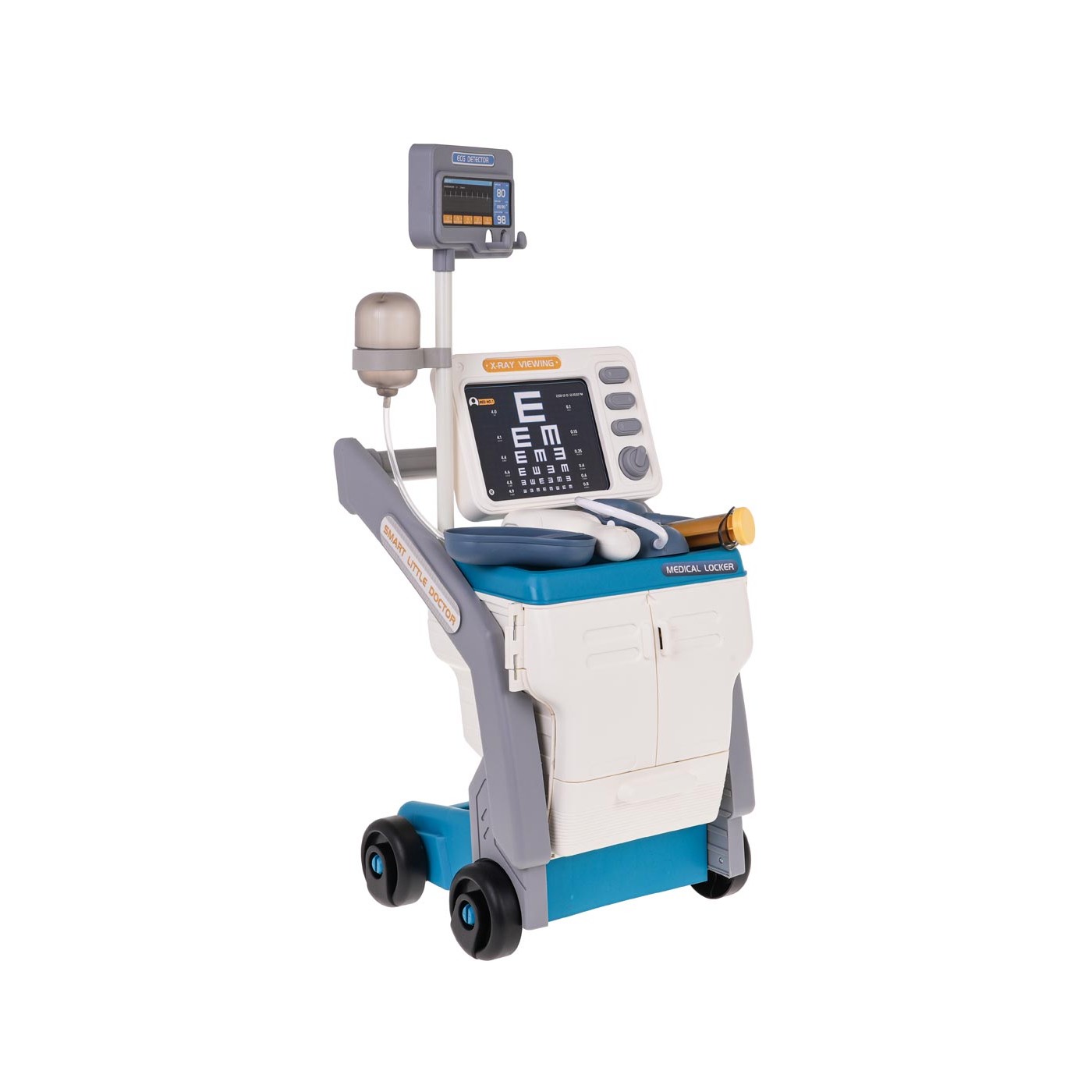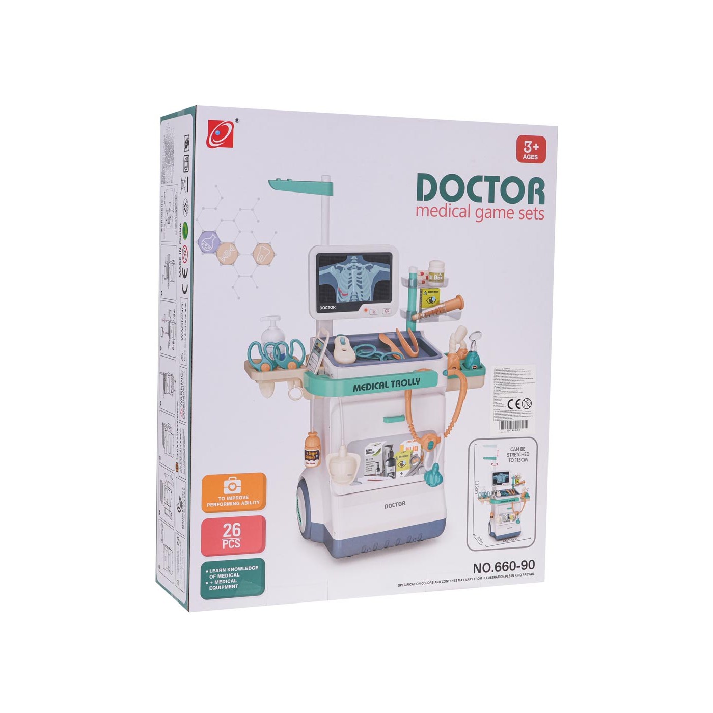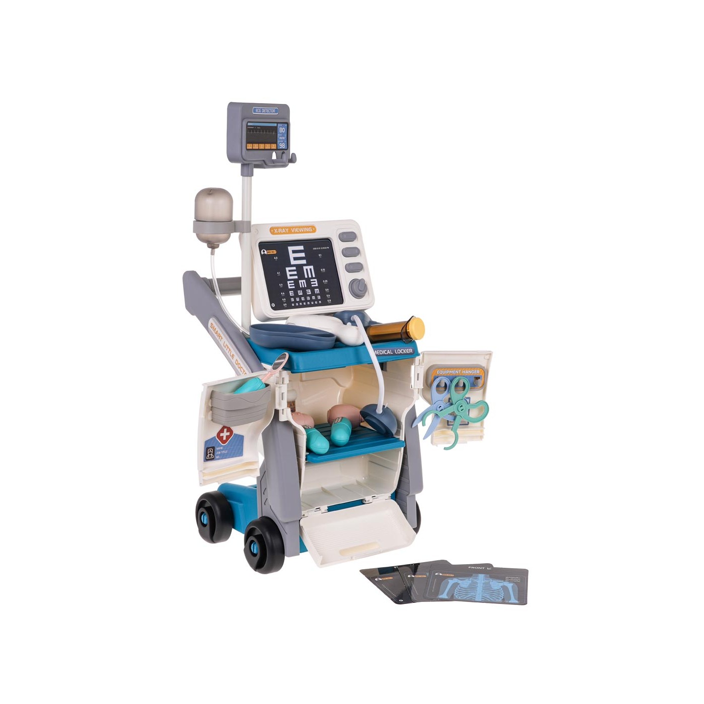 - vhodné pre deti od 3 rokov, - dobre vybavená sada s množstvom príslušenstva, - skvele vyrobené v živých farbách, - má pohodlnú rukoväť na tlačenie, - má veľké kolesá, ľahko sa presúva, - monitorovací panel so zvukmi srdcového tepu a alarmom, - schopnosť meniť röntgenové snímky, - teplomer s podsvietením a zvukom merania teploty, - stetoskop so zvukmi tlkotu srdca. |