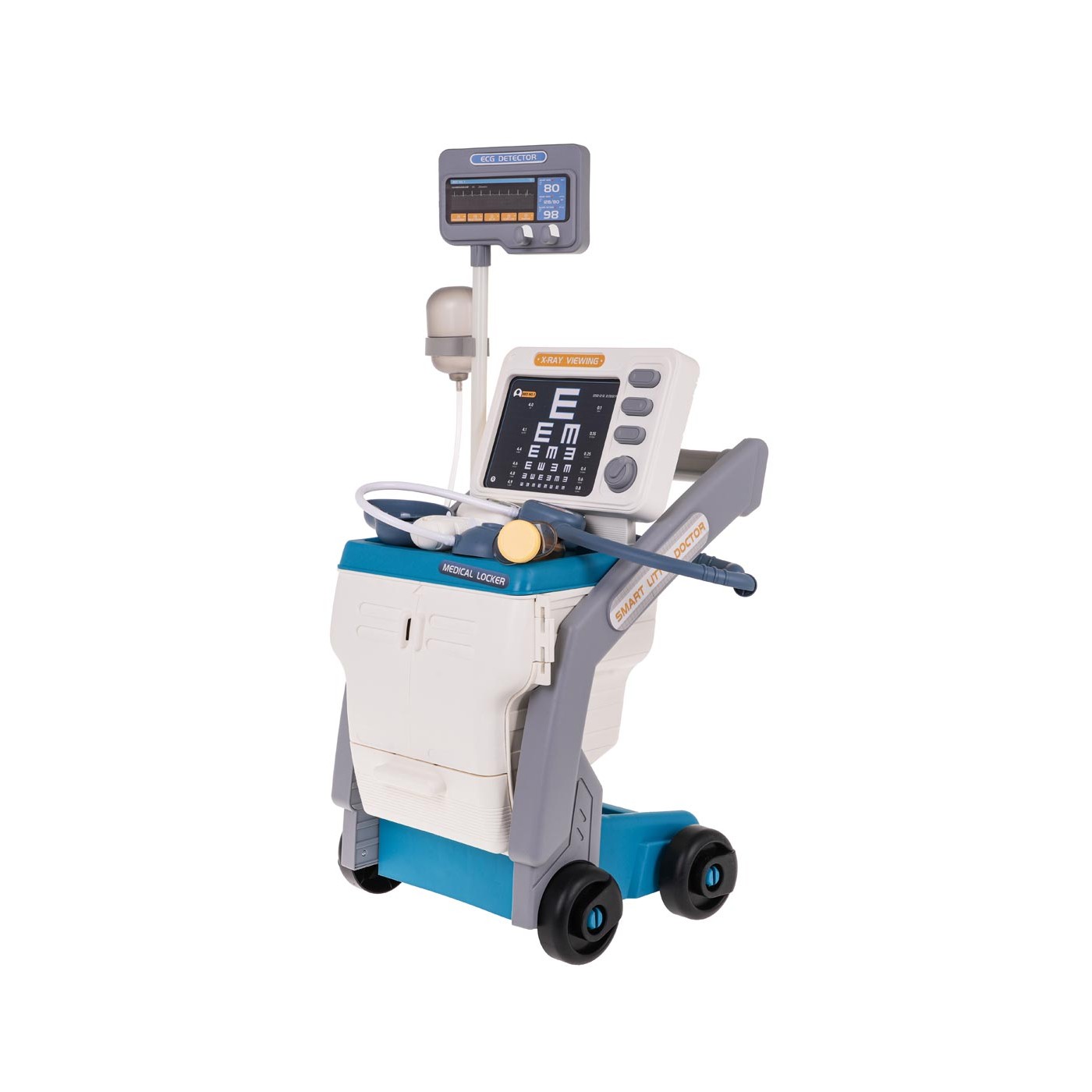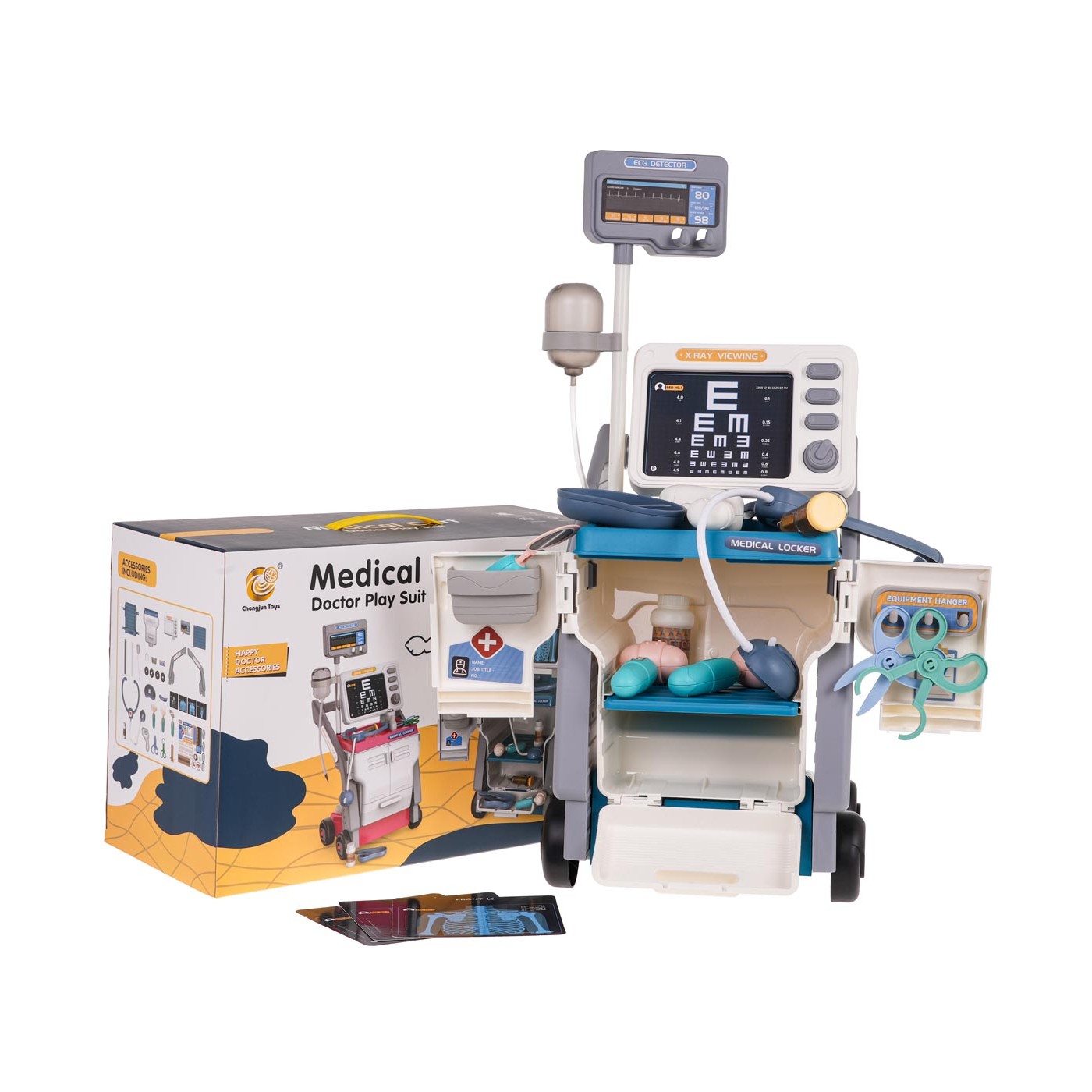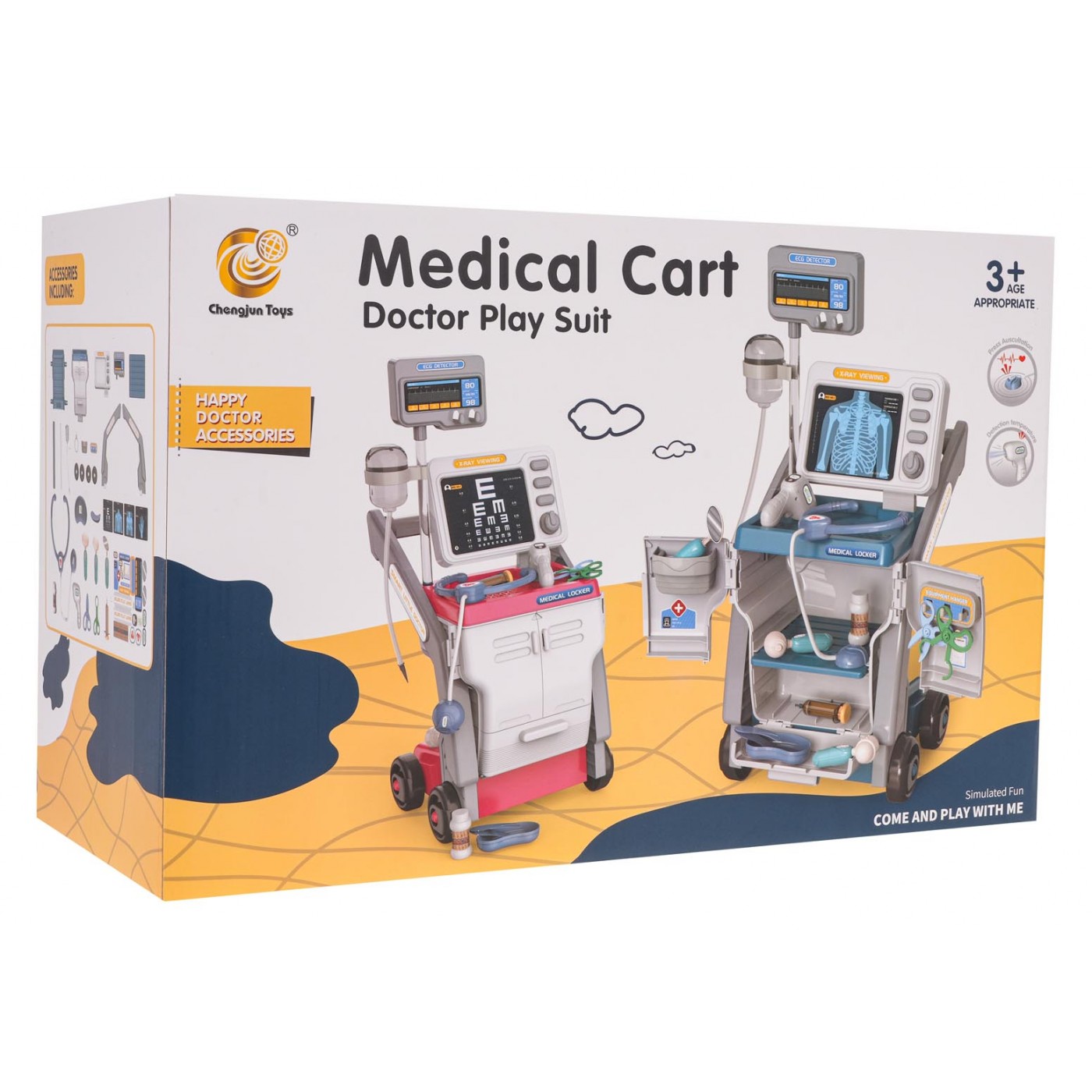Interaktívna, bohato vybavená zdravotná súprava so zvukovými a svetelnými efektmi, pre deti od 3 rokov. Súprava pozostáva zo solídne vyrobeného ľahkého vozíka s veľkými kolesami a šikovnou rukoväťou a množstva lekárskych nástrojov. Môžeme si vymieňať röntgenové snímky a na monitorovacej obrazovke môžeme pomocou tlačidiel aktivovať tlkot srdca alebo zvuky budíka. Monitorovací panel je napájaný 2 x AA 1,5 V batériami (nie sú súčasťou balenia). Stetoskop má zvuky srdcového tepu a teplomer má zvuky merania teploty a podsvietenie. Stetoskop a teplomer sú napájané 3 x AG10 1,5 V batériami (súčasť balenia)