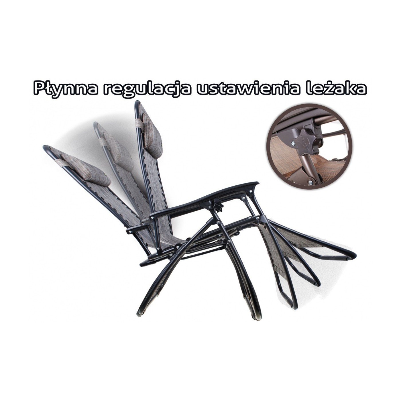 | Jest to jeden z niewielu foteli posiadających płynną regulacje położenia, która charakteryzuje się łatwością obsługi i niezawodnością. Wystarczy odpowiednio zadziałać ciężarem ciała a fotel automatycznie odchyla się lub składa. Osiągając optymalna pozycje wypoczynku wystarczy przekręcić blokadę znajdującą się w oparciu aby unieruchomić ciągłą regulację. - wysoka jakość wykonania, - redukcja nacisku na kręgosłup, - stabilna, mocna oraz trwała konstrukcja, - konstrukcja metalowa, malowana proszkowo (zabezpieczenie przed korozją), - przewiewny komfortowy materiał, - zagłówek z regulacją wysokości, - łatwy do składania, - wygodny do przechowania (zajmuje mało miejsca) i transportu, - odporny na działanie warunków atmosferycznych, - łatwy do utrzymania w czystości, - blokada położenia leżaka, - łatwość zmiany kąta nachylenia, bez użycia rąk i schodzenia z leżaka, - nowoczesne wzornictwo,