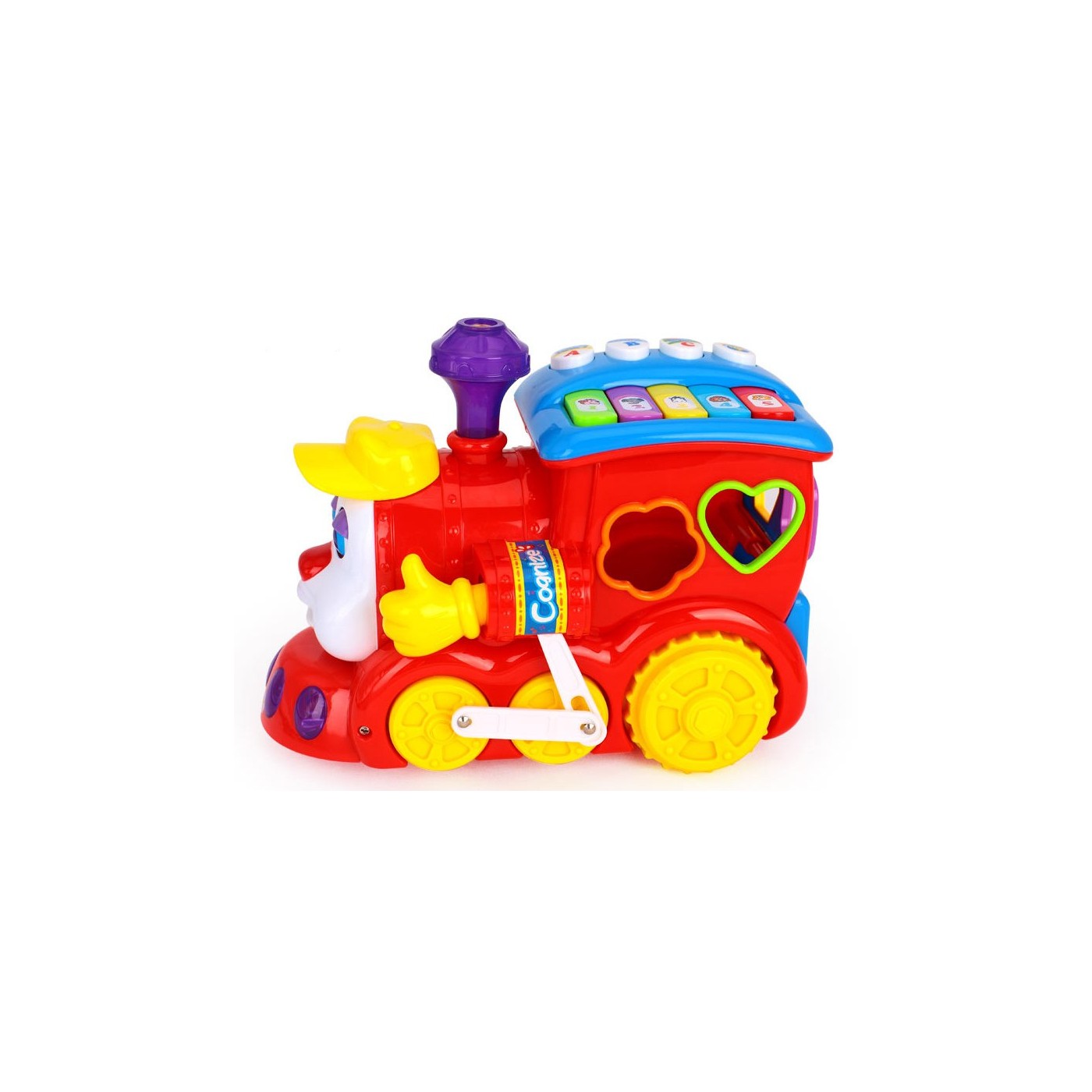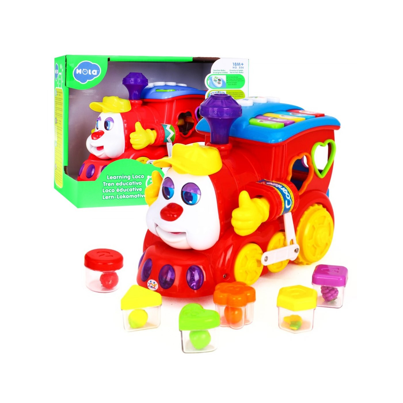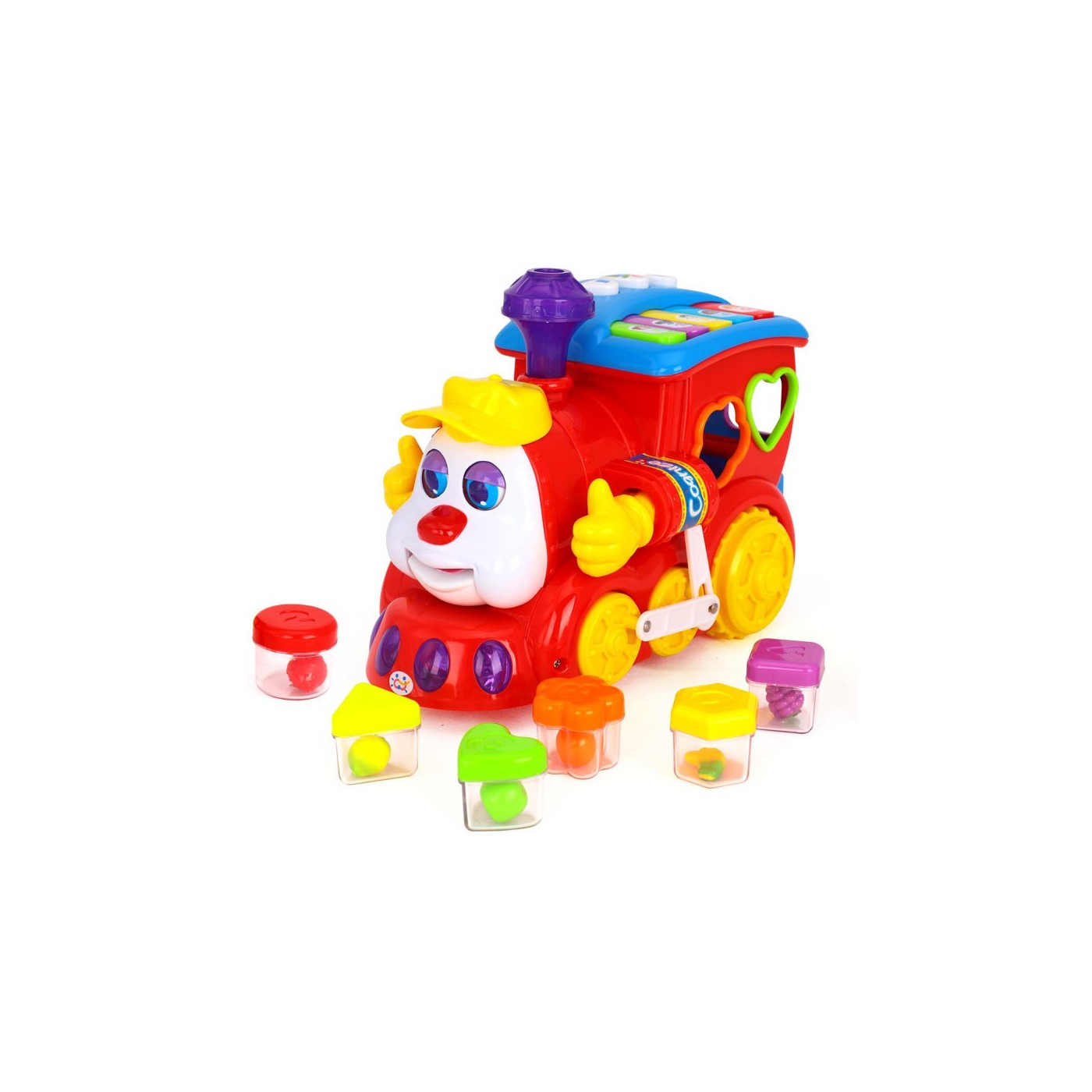 | | - ciuchcia, - zestaw klocków z owocami w środku, - wbudowane pianinko. |